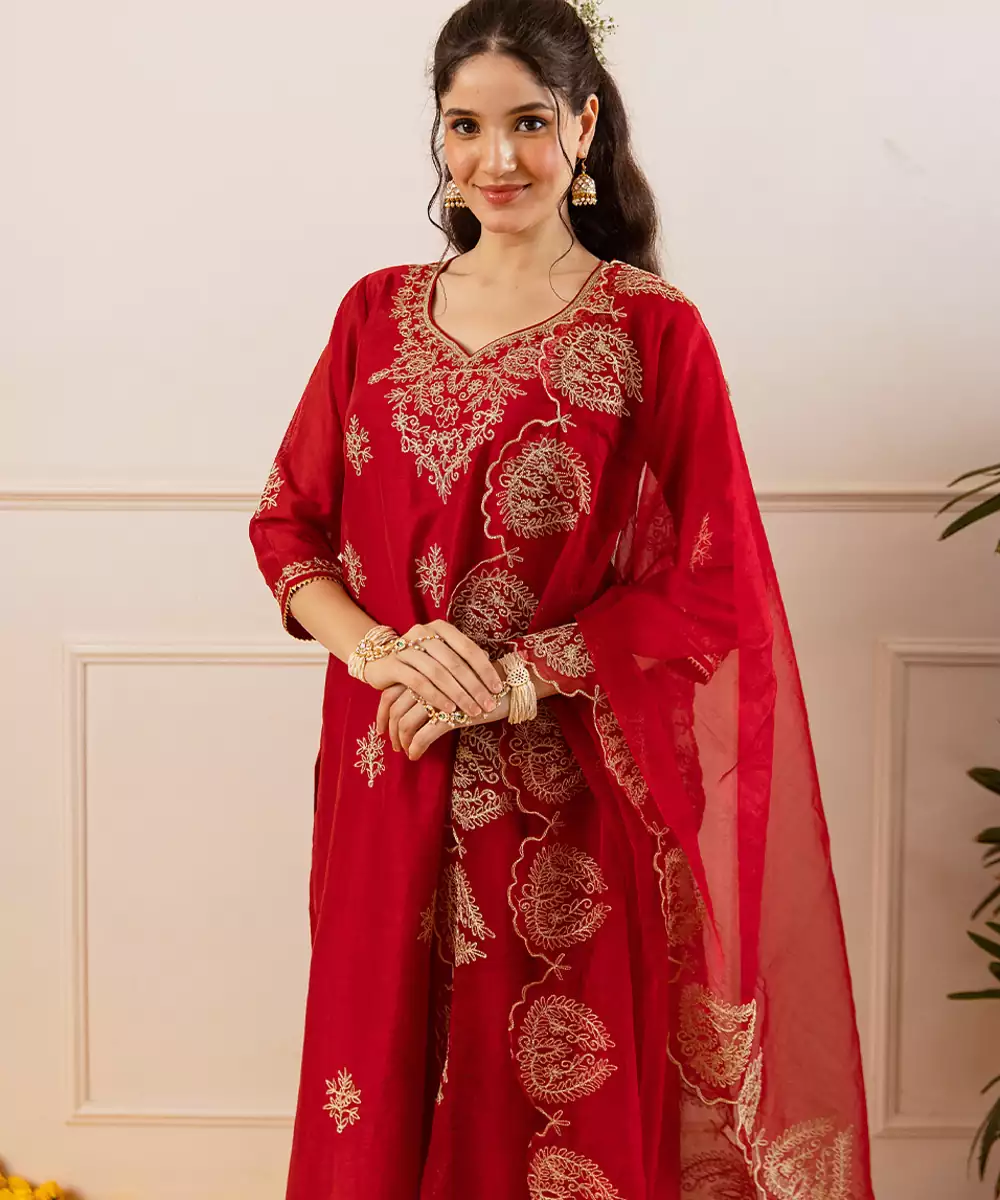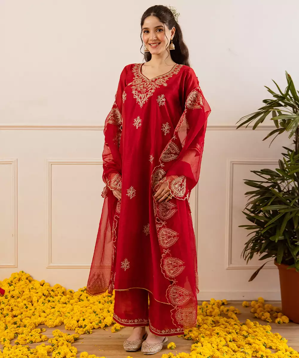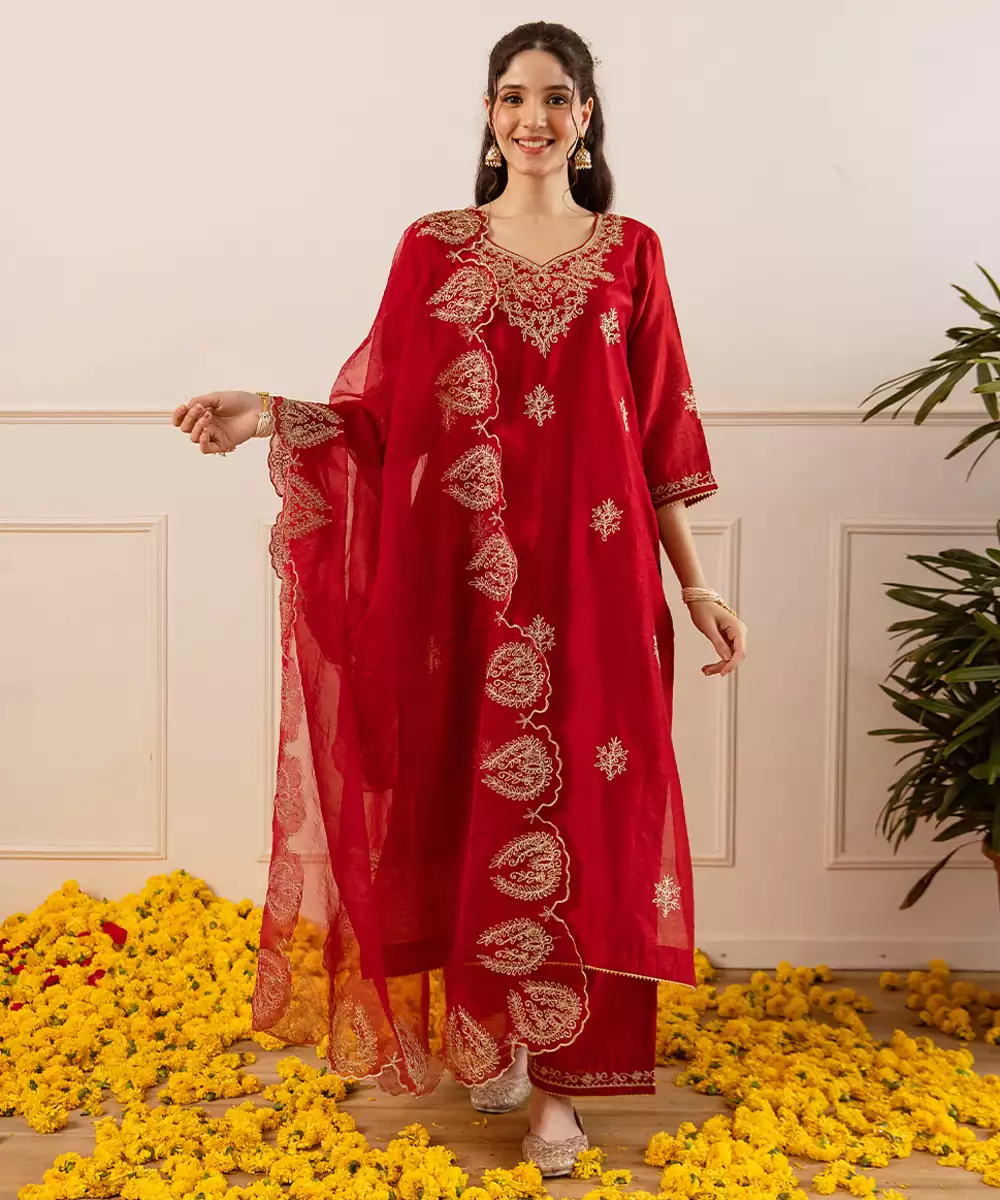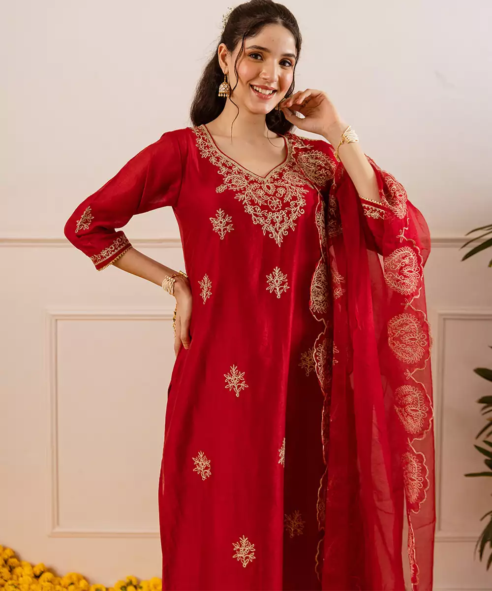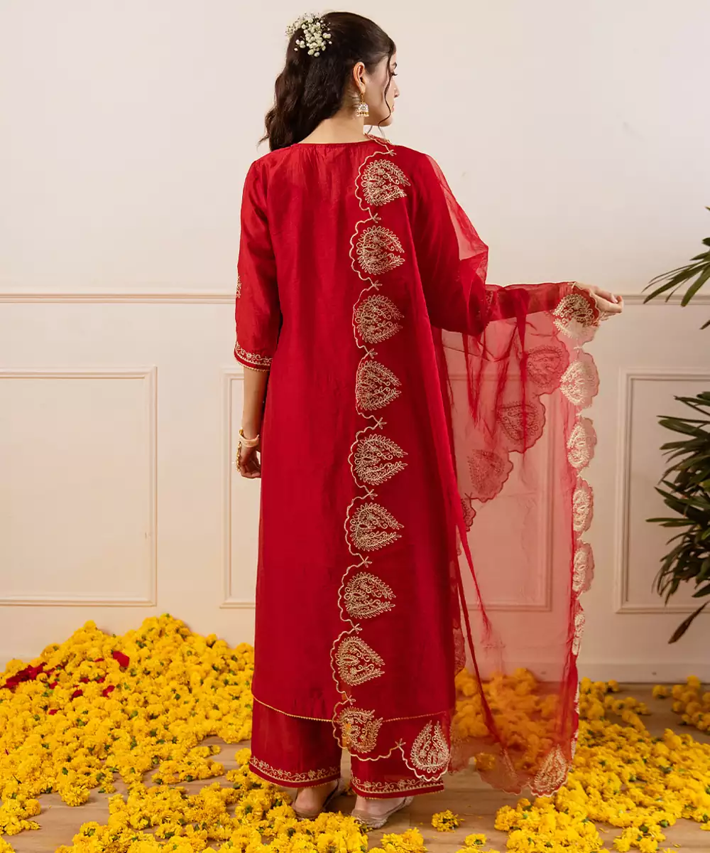 Red Straight Set: A Festive Red Straight Fit Kurta Set In A Glossy Chanderi Like Weave, Defined By A V Neckline Traced In Opulent Zari Foliage And A Scalloped Yoke Motif That Lends Heirloom Detail. The Kurta Is Dotted With Zari Buttas, While The Sheer Organza Dupatta Features Matching Scalloped Zari Appliqués And Highlighted Corners For A Dramatic Frame.