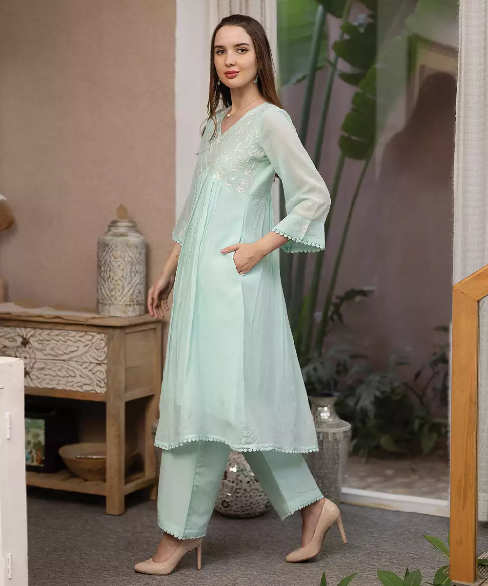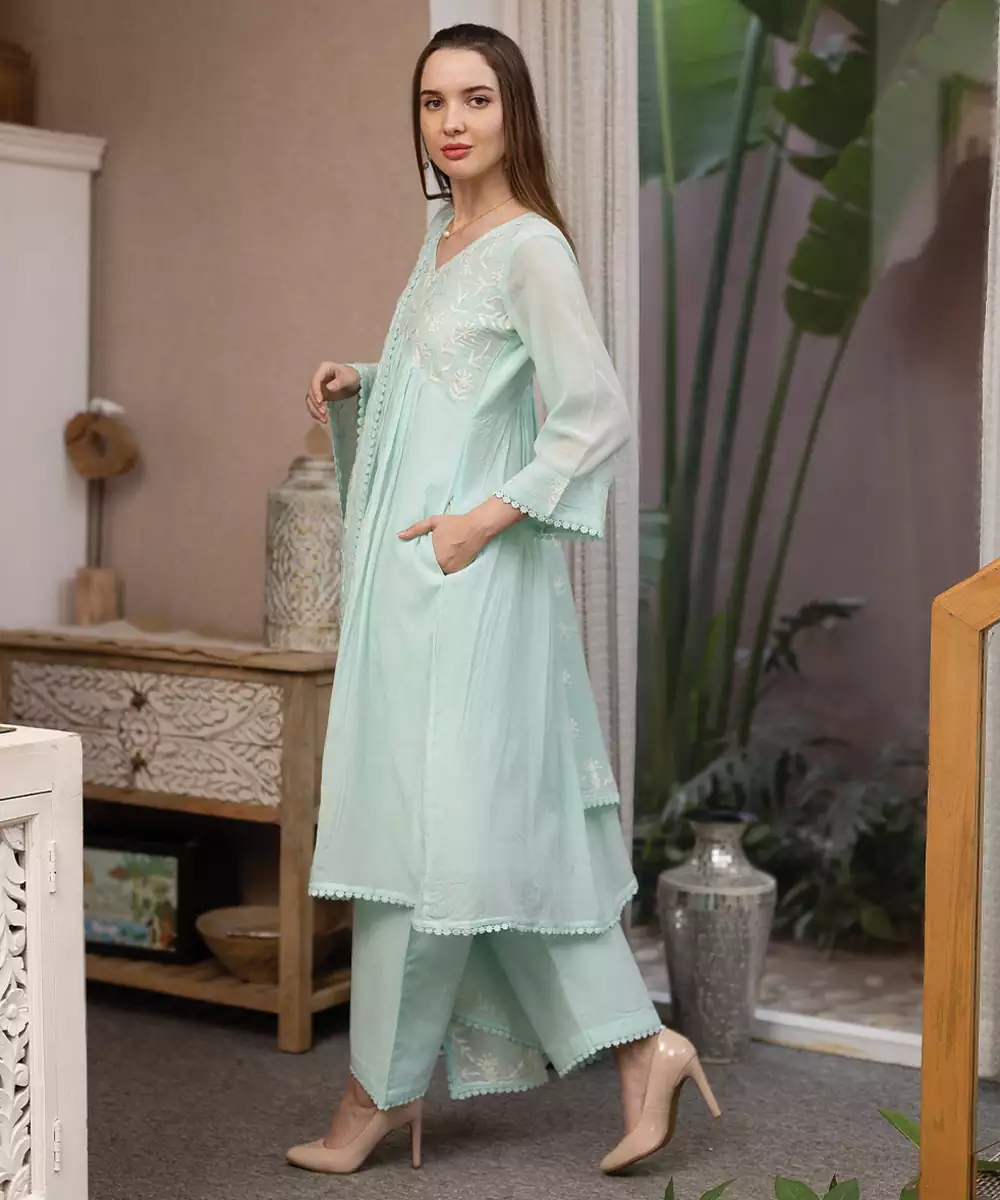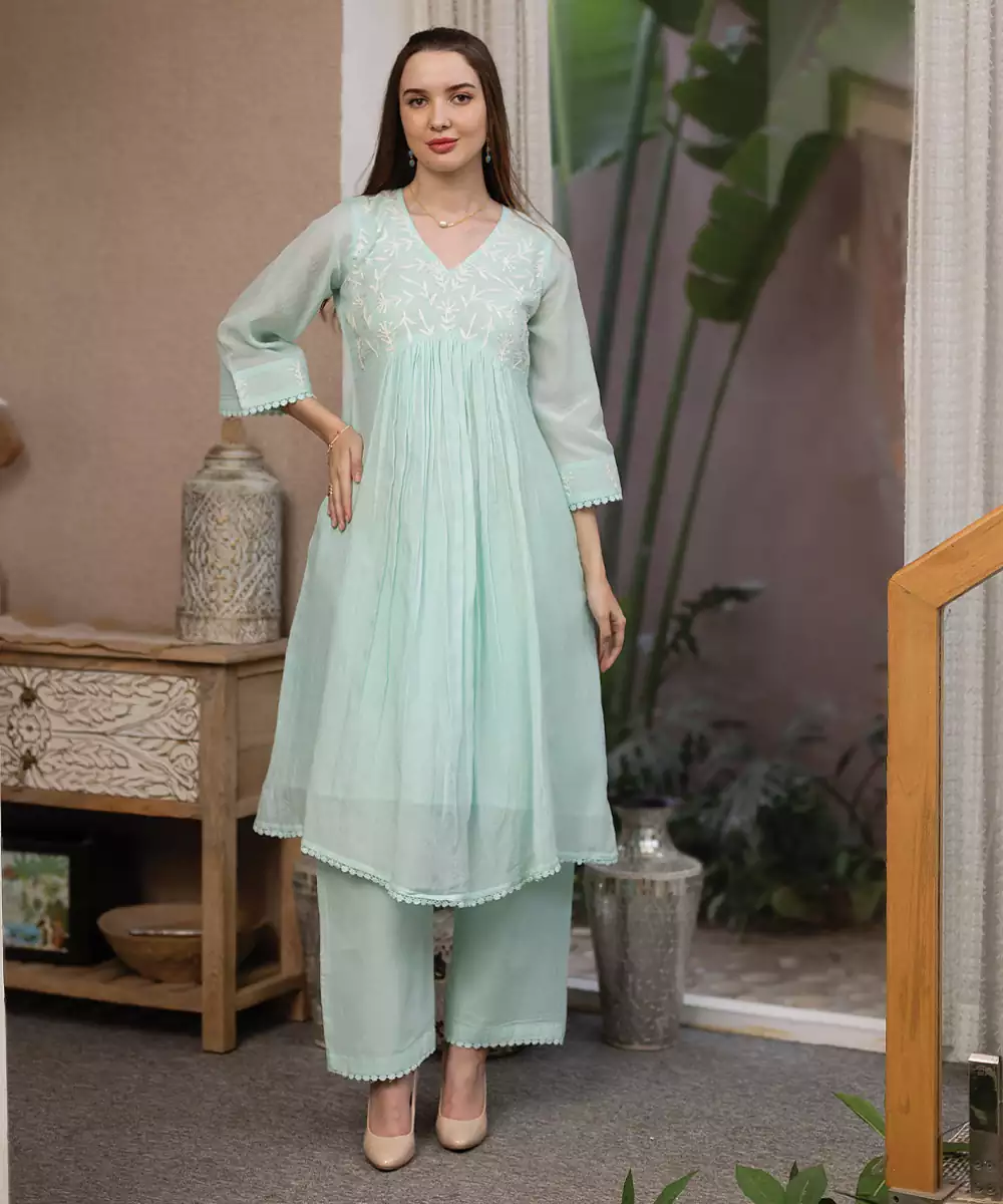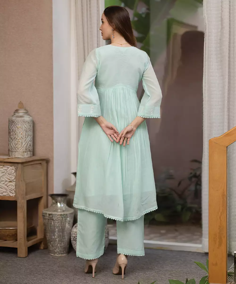 Sea Green Embroidered Mul Chanderi Straight Suit Set
