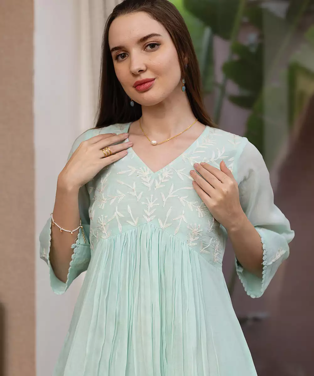 Elegant And Refreshing, This Sea Green Embroidered Mul Chanderi Straight Suit Set Features Fine Detailing With A Soft Sheen. The Breathable Fabric Ensures Comfort, While The Graceful Silhouette Makes It Perfect For Festive Wear, Offering A Blend Of Tradition And Contemporary Style.