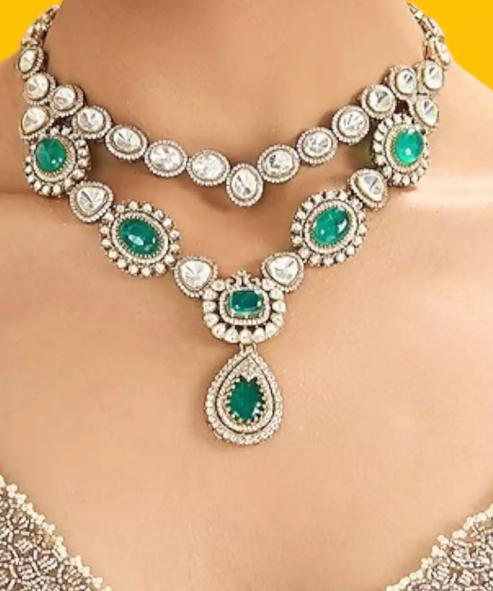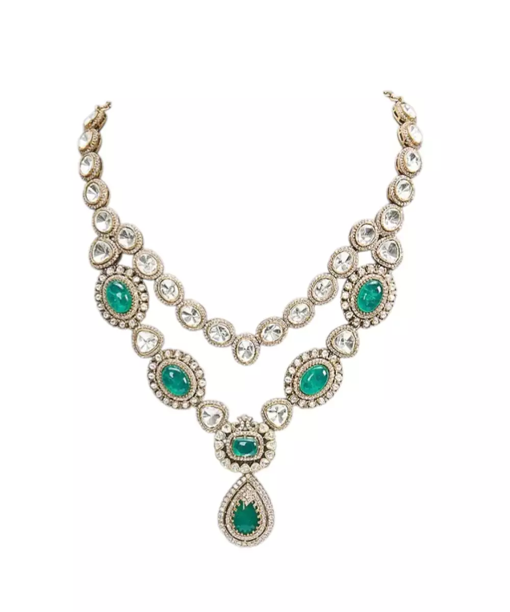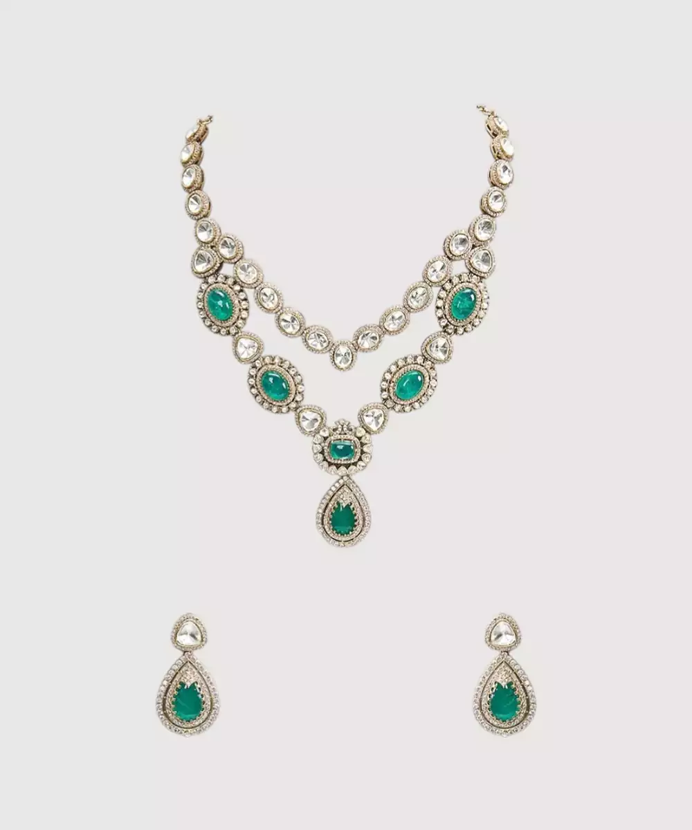 Make A Grand Statement With This Regal Gold Plated Bridal Necklace Set, Embellished With Green Kundan Stones And Lustrous Pearls. The Layered Design Exudes Traditional Charm While Adding A Luxurious Touch To Your Festive Or Bridal Attire. The Set Includes A Matching Pair Of Earrings, Perfectly Crafted To Complement The Elaborate Necklace. A Must Have For Weddings, Receptions, Or Festive Celebrations.