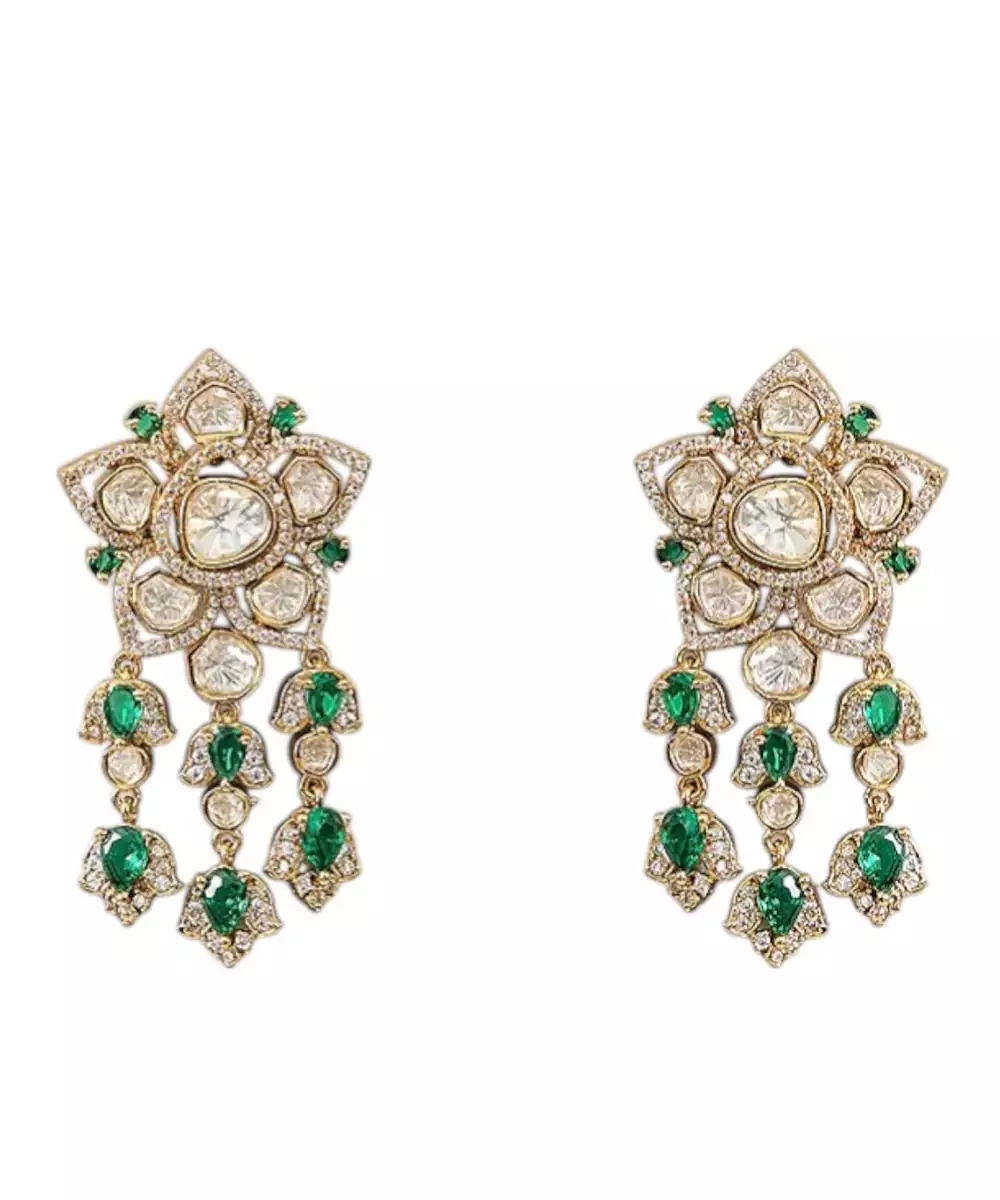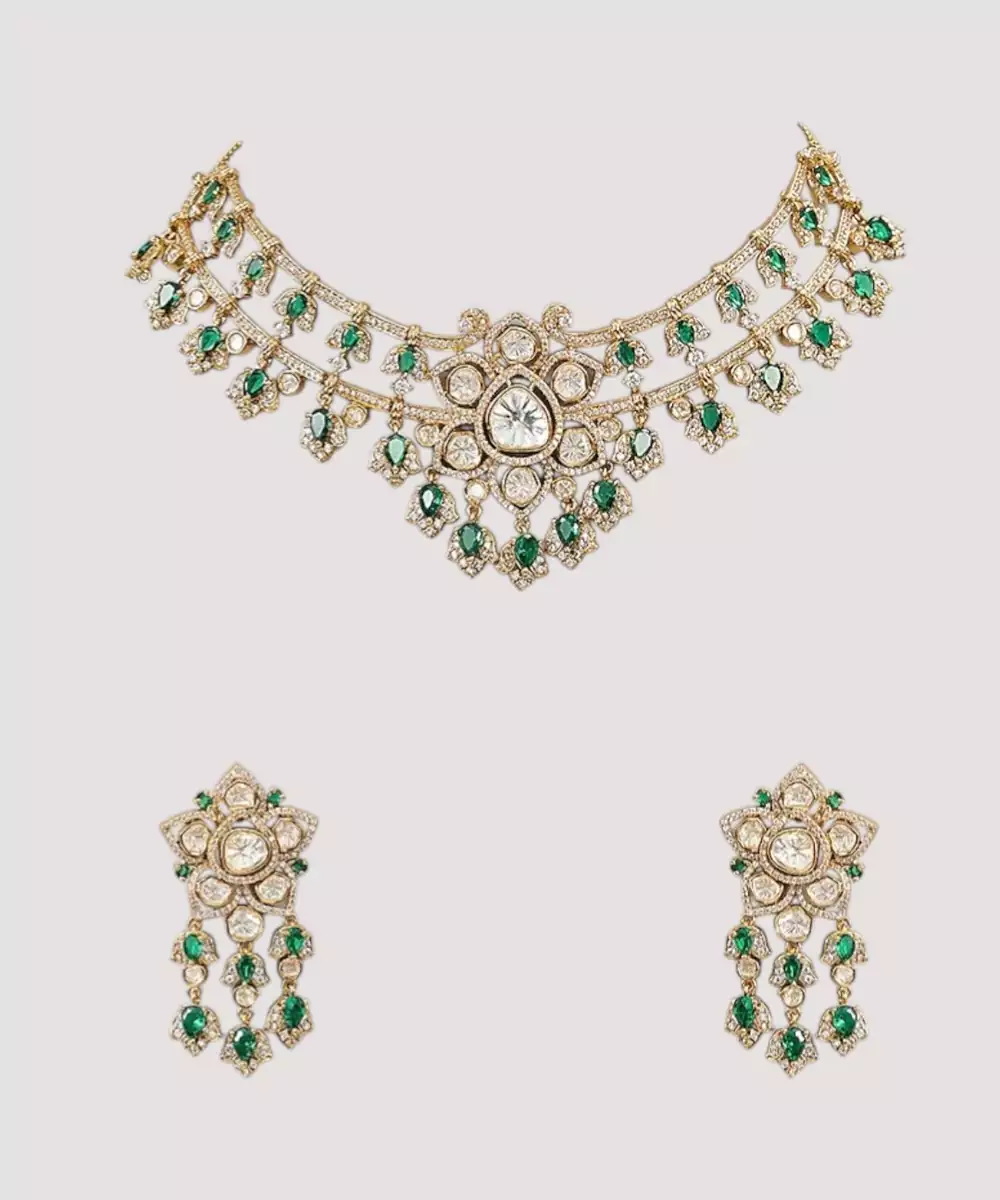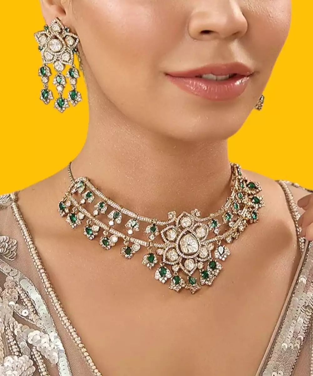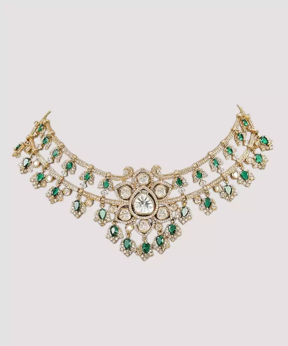 Turn Heads At Any Event With This Royal Green And Gold Kundan Choker Necklace Set, Crafted To Perfection For Festive And Bridal Occasions. Designed With An Intricate Floral Motif In The Center, The Necklace Features Dazzling White Kundan Stones Paired With Emerald Green Drops For A Rich And Luxurious Look.
