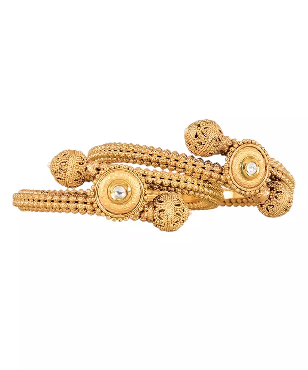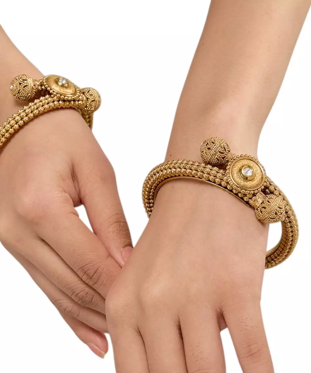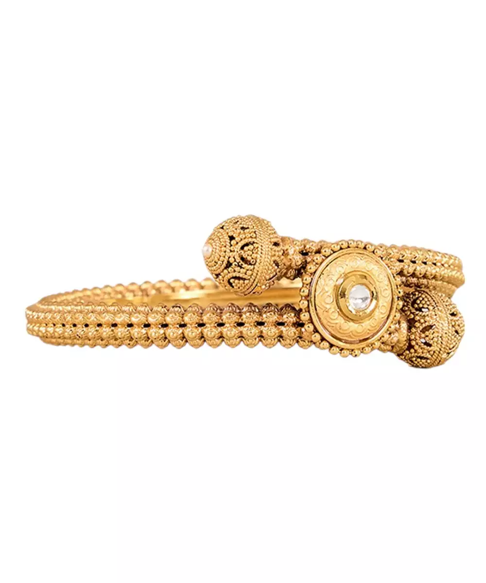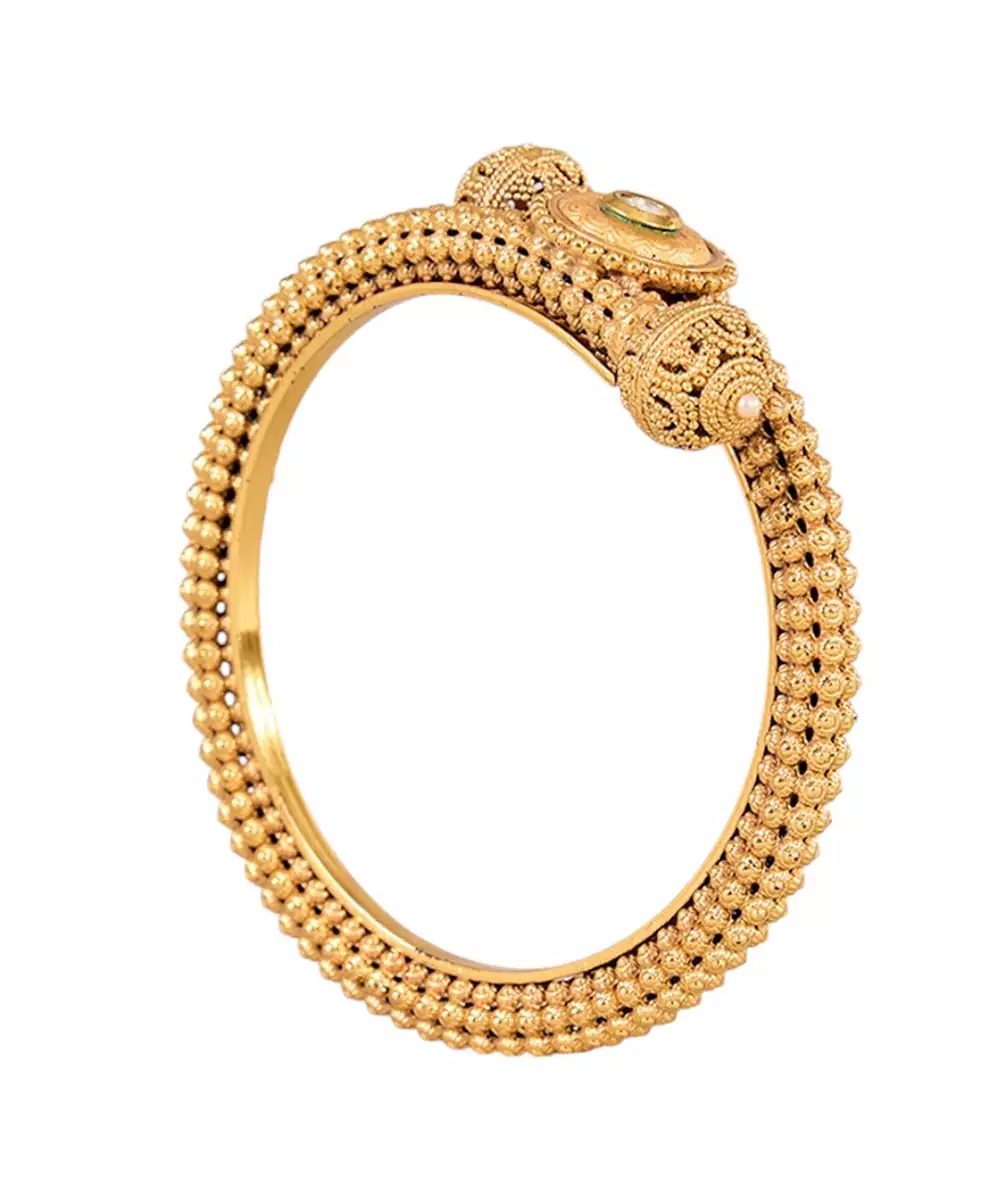 Add A Touch Of Regal Charm To Your Traditional Attire With These Antique Gold Plated Bangles. Designed With Intricate Bead Work And Adorned With A Central Stone Accent, These Bangles Reflect Vintage Indian Craftsmanship. The Sturdy Brass Construction And Detailed Motifs Make Them A Perfect Fit For Weddings, Festivals, Or Ethnic Celebrations.