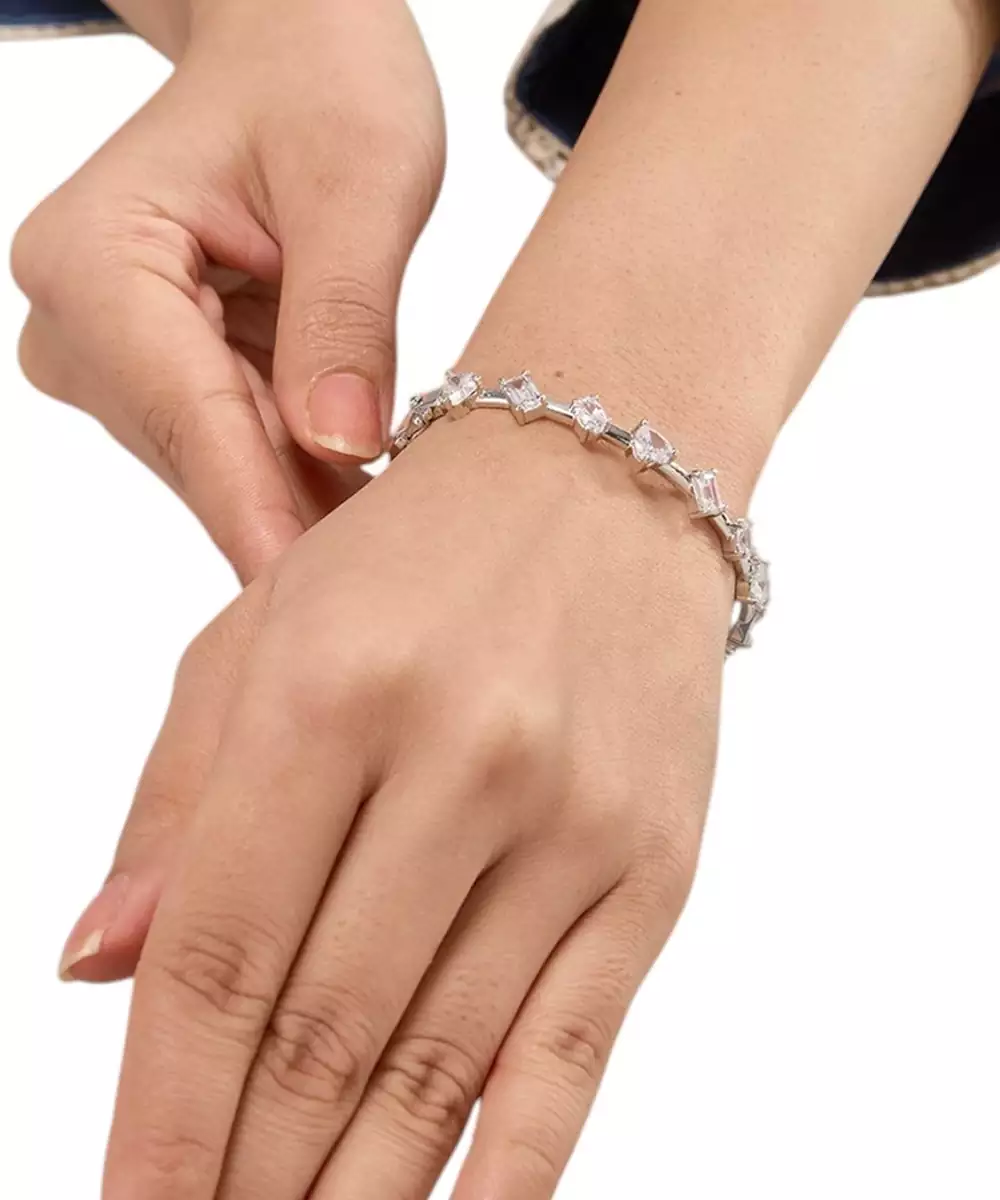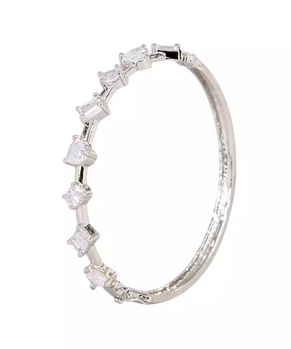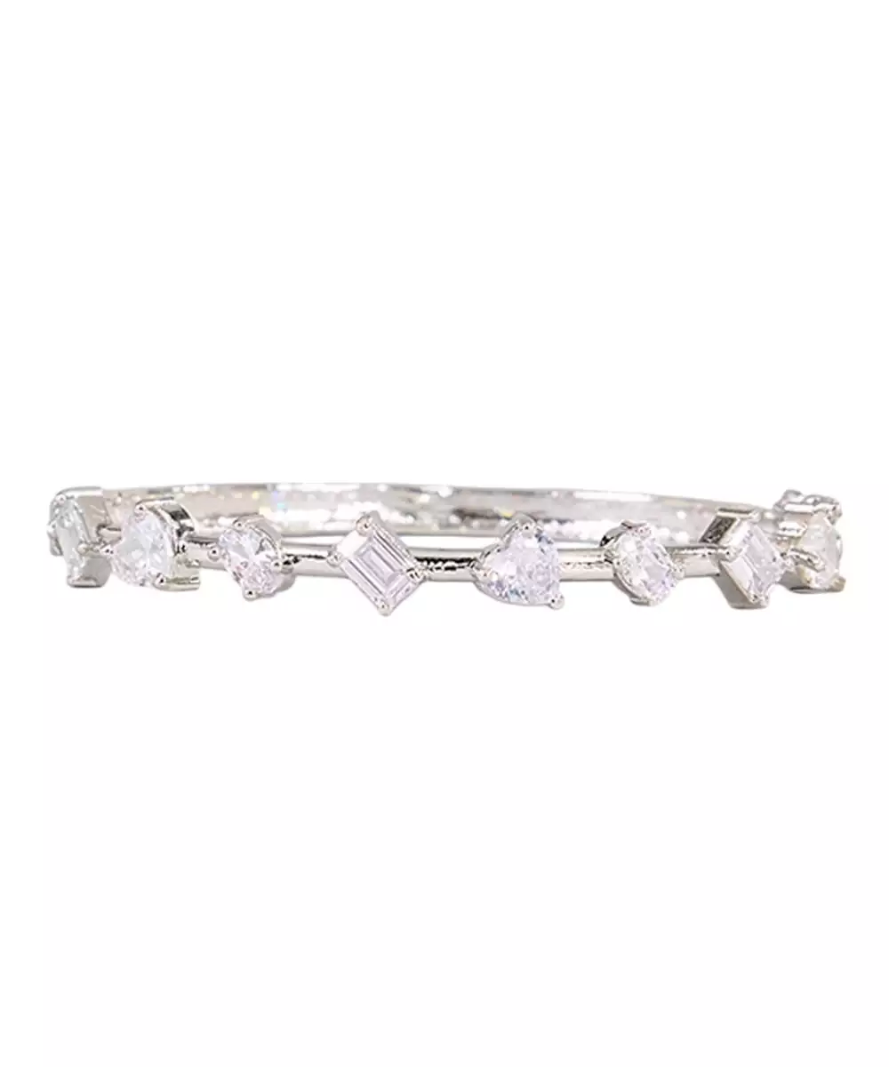 Elegant Silver Toned Bangle Bracelet Studded With Sparkling Cubic Zirconia Stones.This Delicate Silver Plated Bangle Adds Subtle Elegance With Its Unique Arrangement Of Multi Cut Cz Stones. Ideal For Everyday Glam Or Pairing With Light Festive Outfits, It Blends Minimalism With Brilliance Effortlessly.