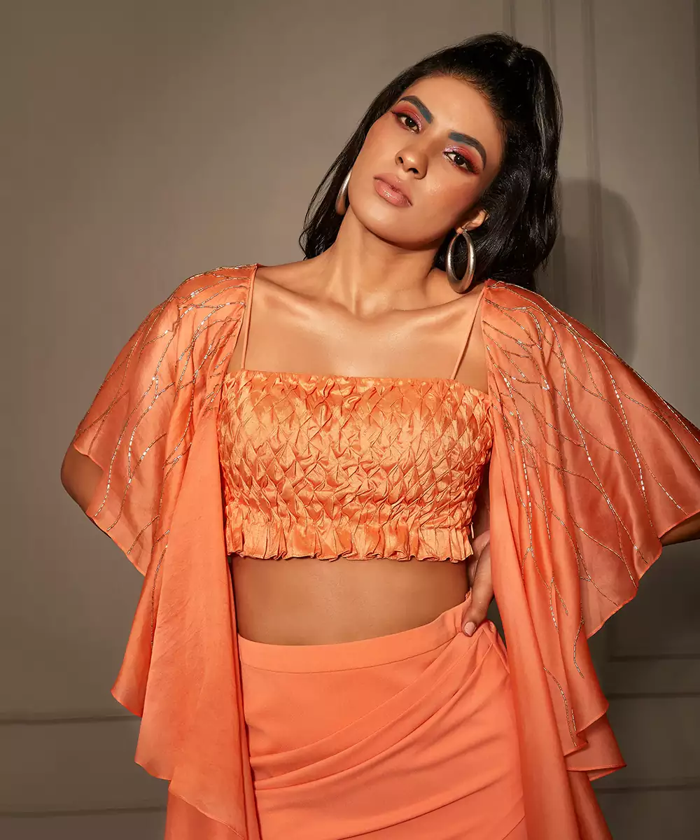 An Orange Ultra Chic Silhouette Including A Ruched Bralette, High Slit Drape Skirt Paired With An Organza Cape Embellished In Silver Bugle Beads.