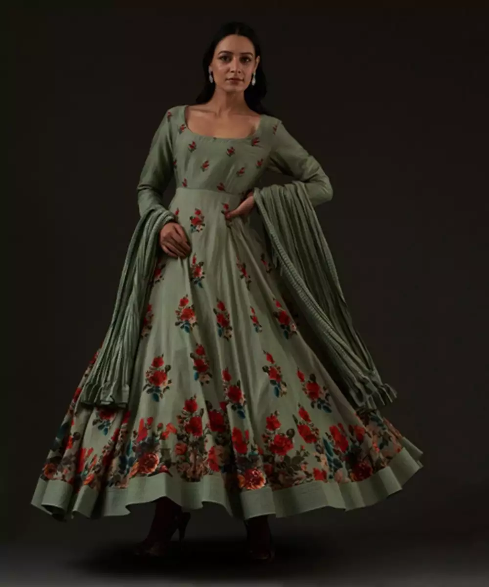 Featuring A Floral Printed Anarkali Paired With Crinkled Chanderi Dupatta And Churidar. Colour: Dusty Green Fabric: Chanderi Components: 3 ( Anarkali , Pants , Dupatta) Work: Printed