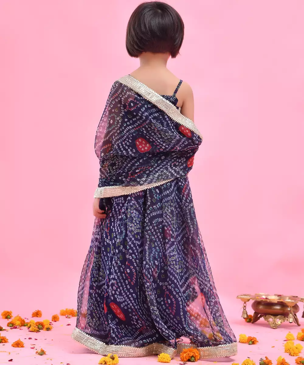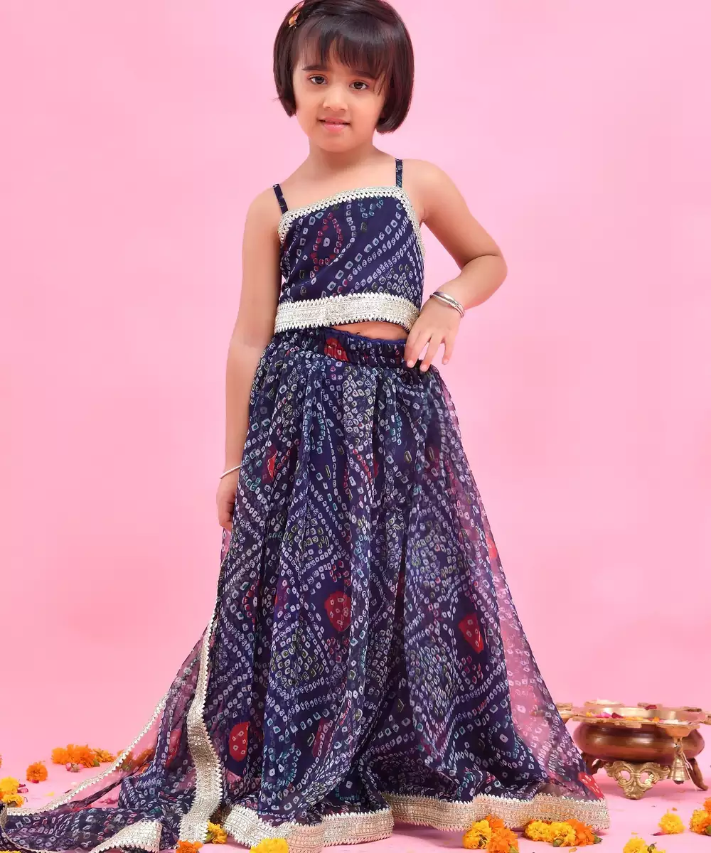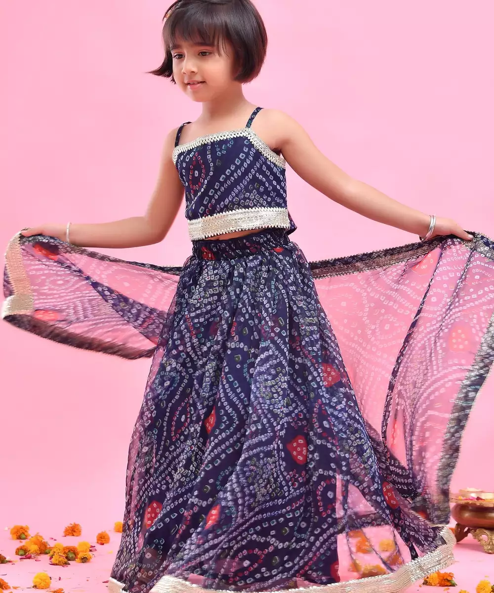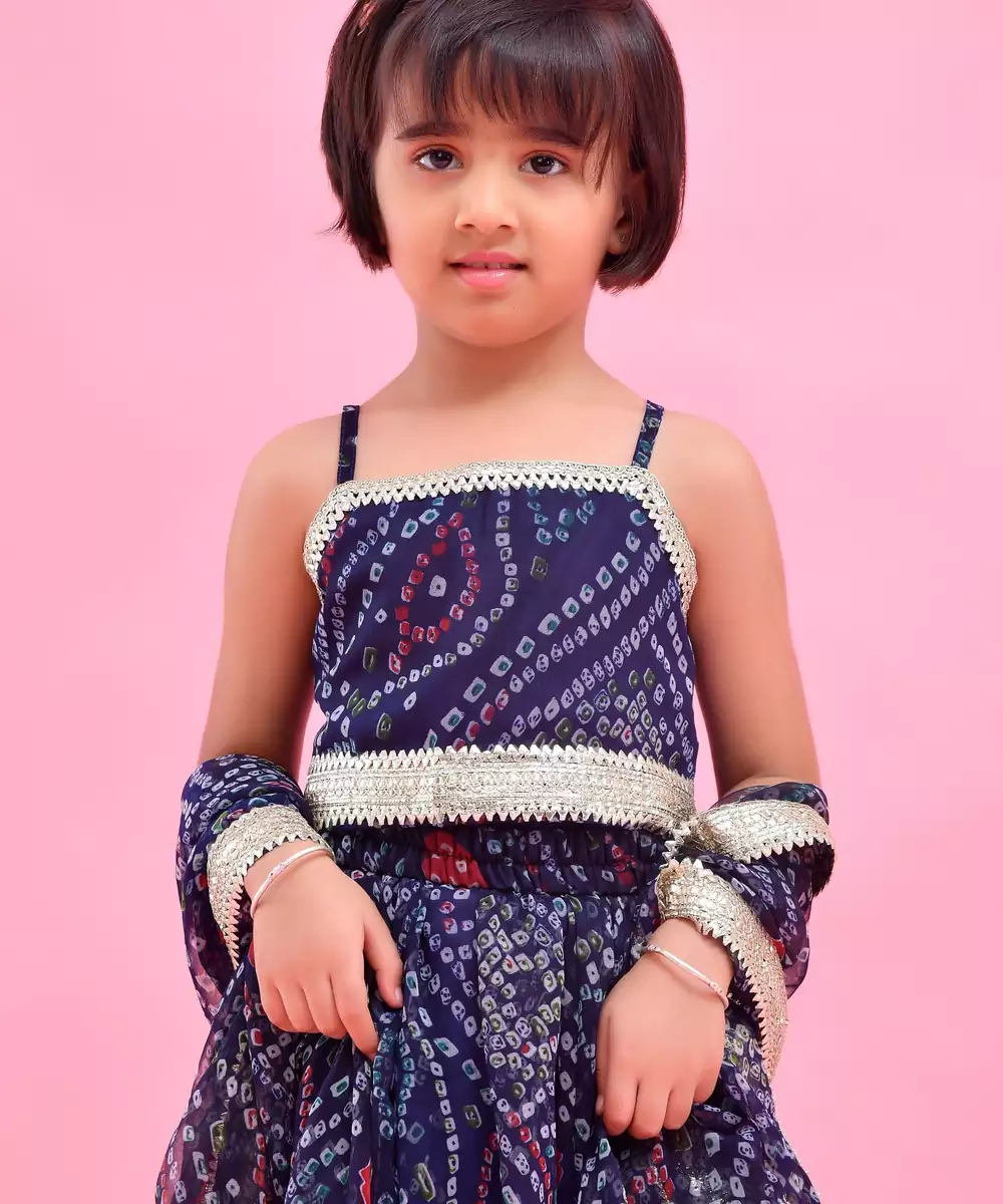 Featuring A Blue, Bandhani Printed And Lace Embellished, Spaghetti Blouse , Lehenga And Dupatta In Chiffon Fabric. Colour: Blue Fabric: Chiffon Components: 1 / Lehenga 1 / Blouse 1 / Dupatta