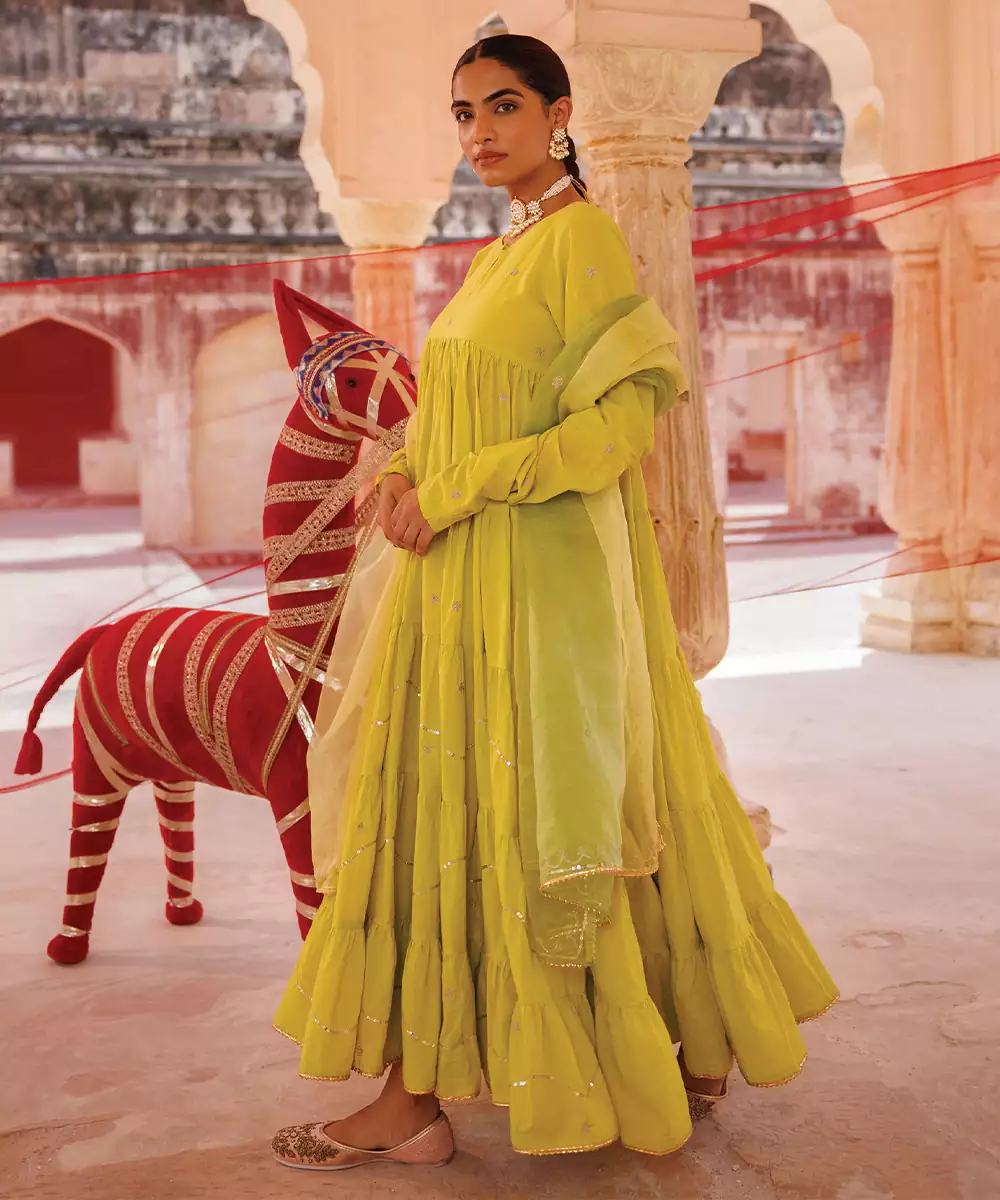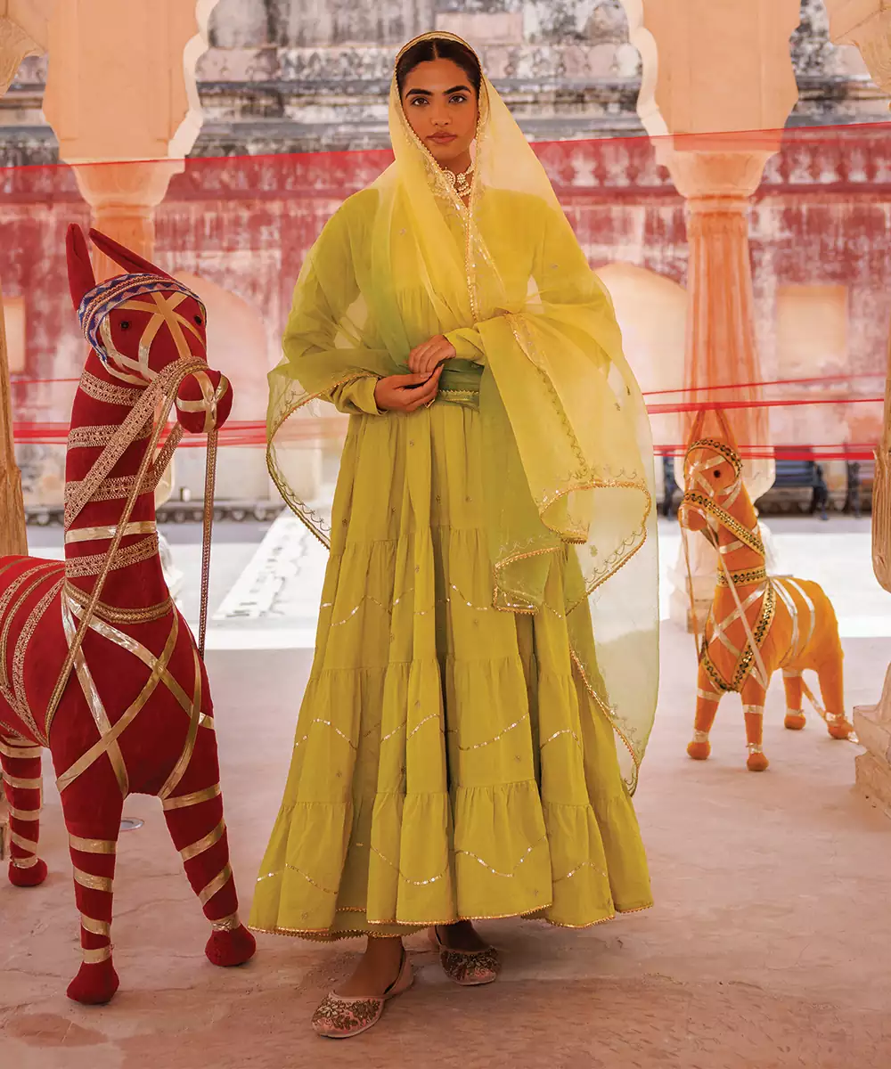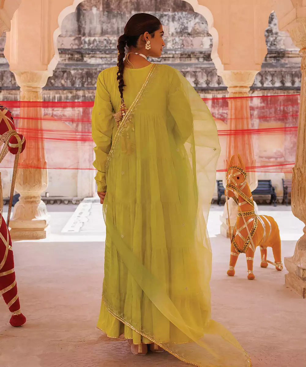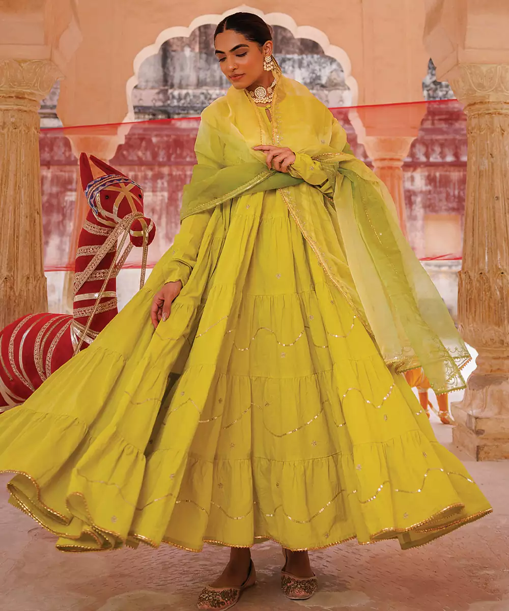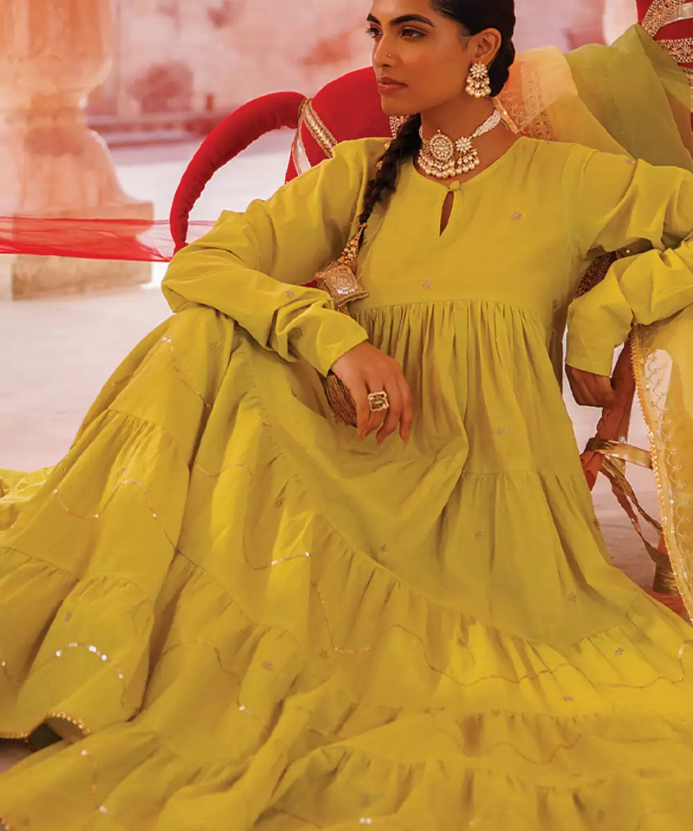 Bold And Vibrant, This Green Embroidered Cotton Anarkali Set Stands Out With Its Striking Color And Elegant Detailing. The Breathable Fabric Ensures Comfort, While The Flared Silhouette Adds Movement. Perfect For Festive Occasions, It Brings A Modern Twist To Traditional Wear.