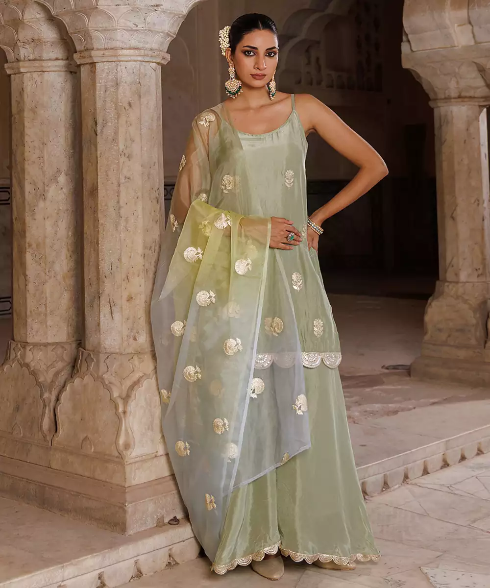 This Green Embroidered Silk Sharara Set Radiates Festive Elegance With Its Vibrant Hue And Intricate Embroidery. Crafted From Luxurious Silk Fabric, It Offers A Rich Texture And Graceful Silhouette. Perfect For Weddings, Celebrations, Or Festive Gatherings, This Set Adds A Bright, Traditional Charm To Your Ethnic Wardrobe.