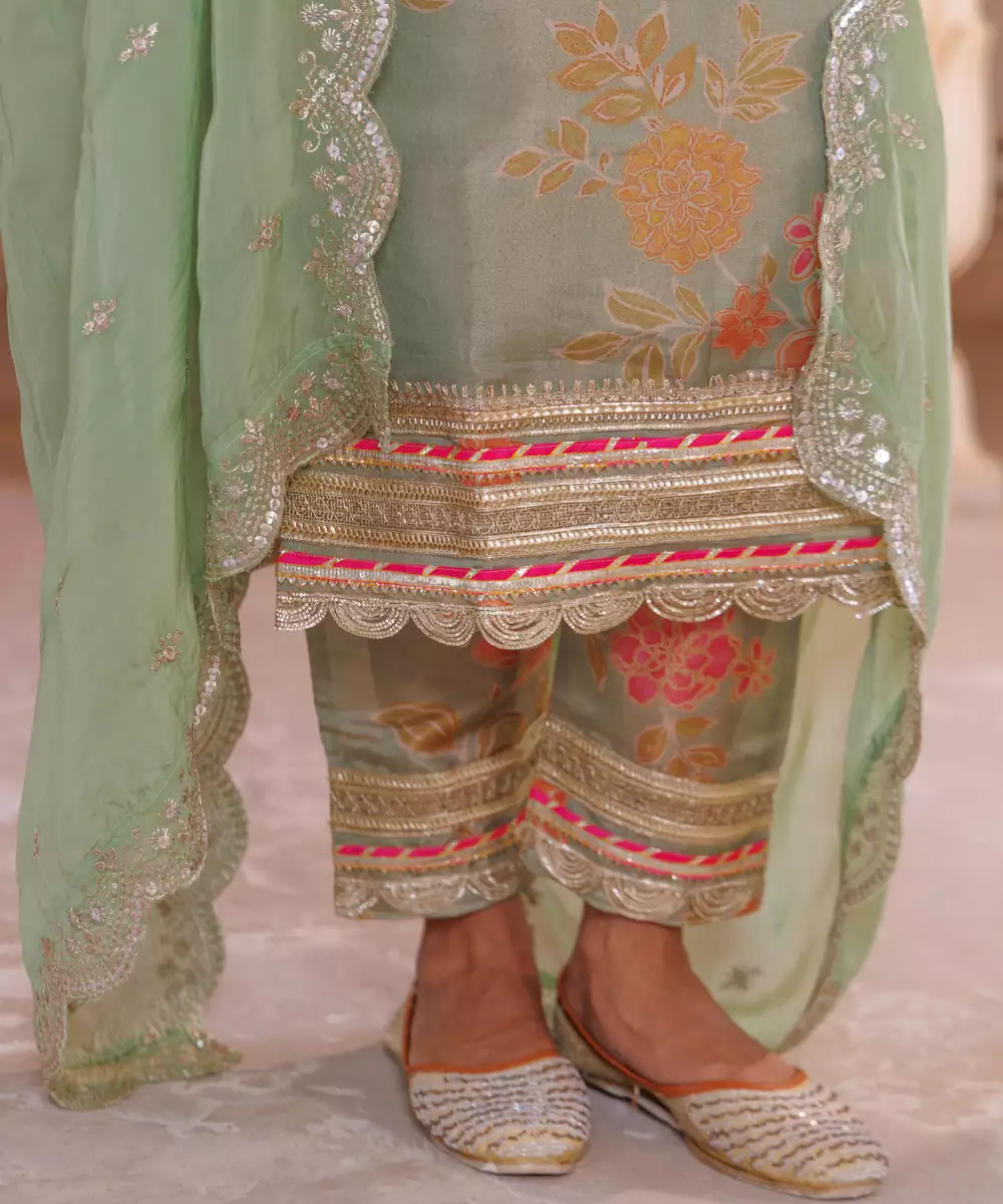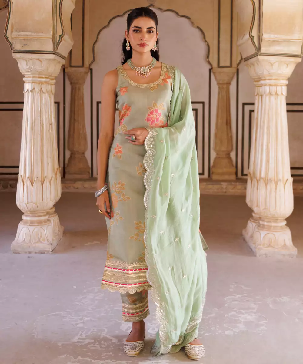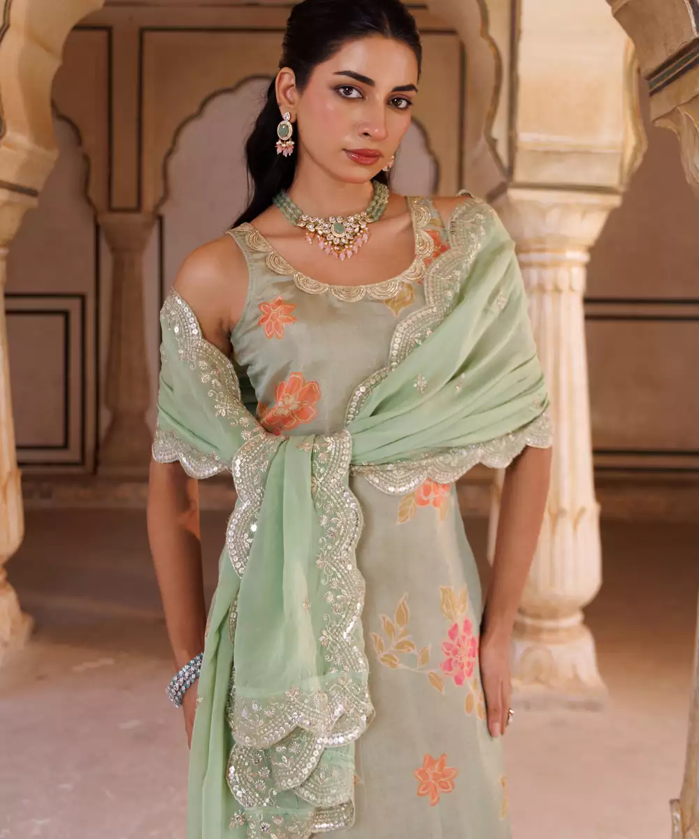 Pastel Green Tissue, Floral Printed Kurta Set With Lace Embellished Details On Kurta & Pant. Paired With An Embroidered Georgette Dupatta.