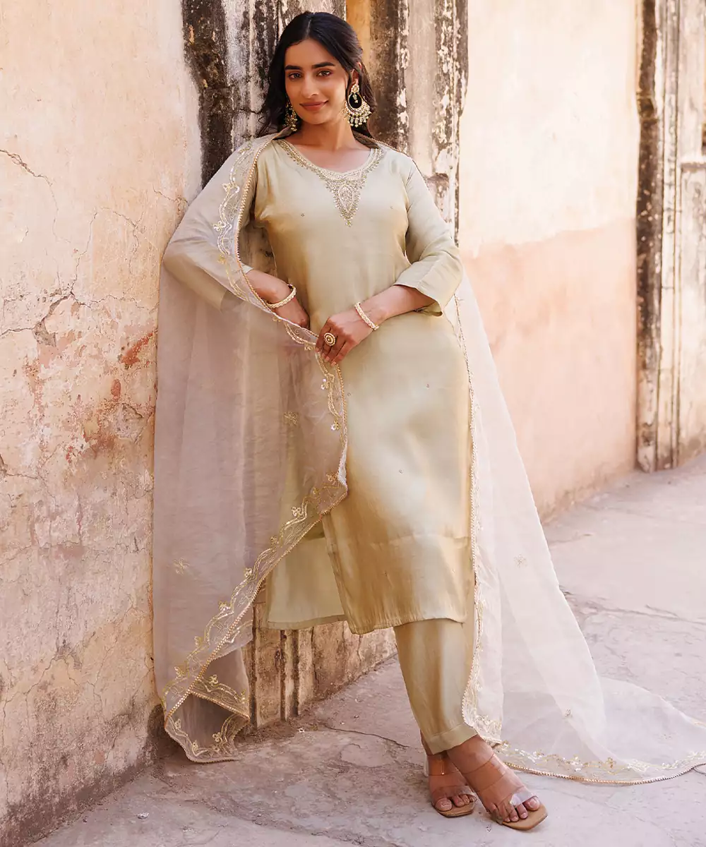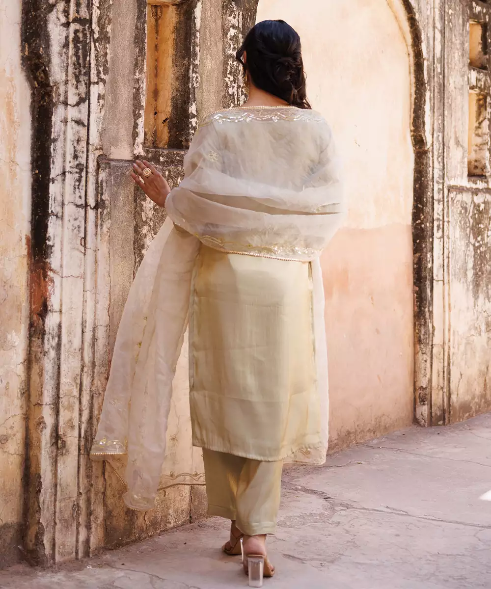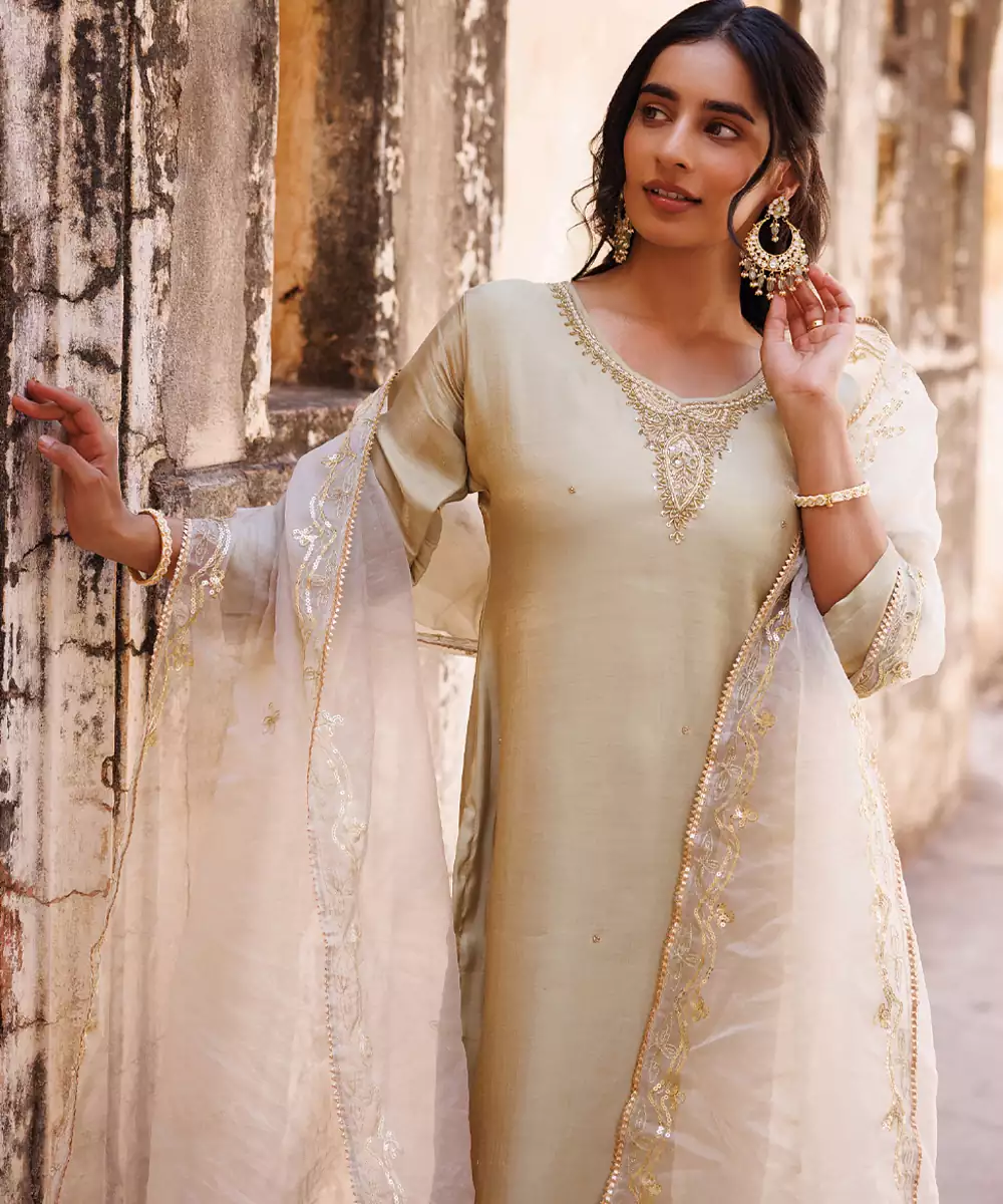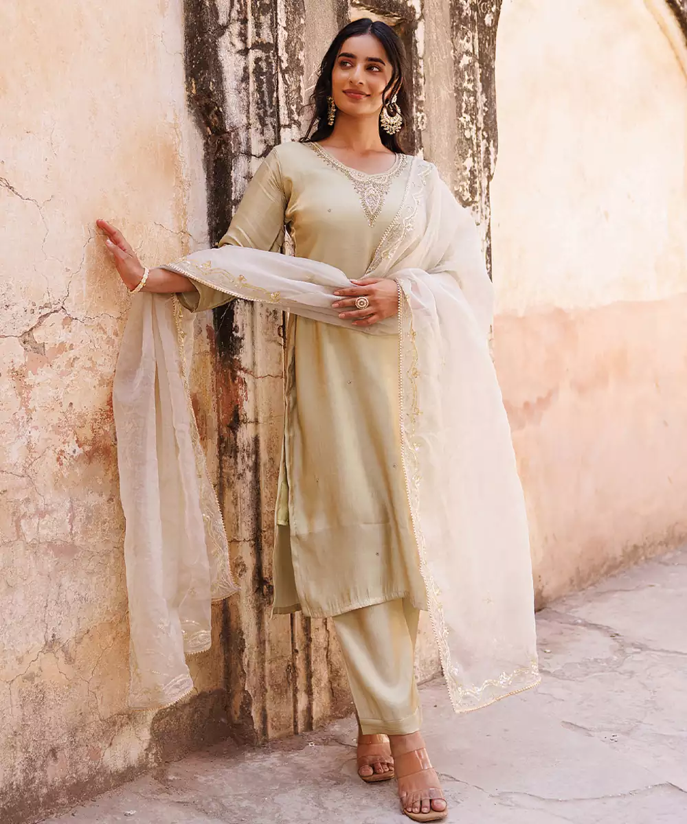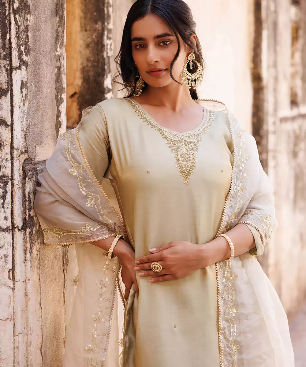 This Ivory Embroidered Art Silk Kurta Set Exudes Elegance With Its Smooth Texture And Subtle Sheen. The Intricate Detailing Enhances Its Refined Appeal, Making It Perfect For Festive Occasions. A Timeless Outfit That Blends Sophistication With Comfort, Offering A Graceful And Polished Ethnic Look.