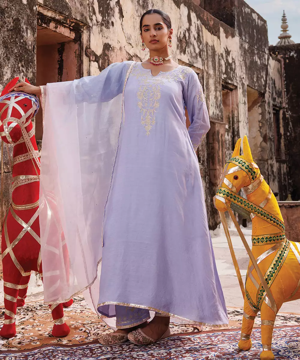 This Lavender Embroidered Chanderi Kurta Set Features A Soothing Color With Intricate Detailing. The Soft Sheen Of The Fabric Enhances Its Elegance, Making It Ideal For Festive And Special Occasions. A Refined Outfit That Combines Comfort With Graceful And Modern Ethnic Style.