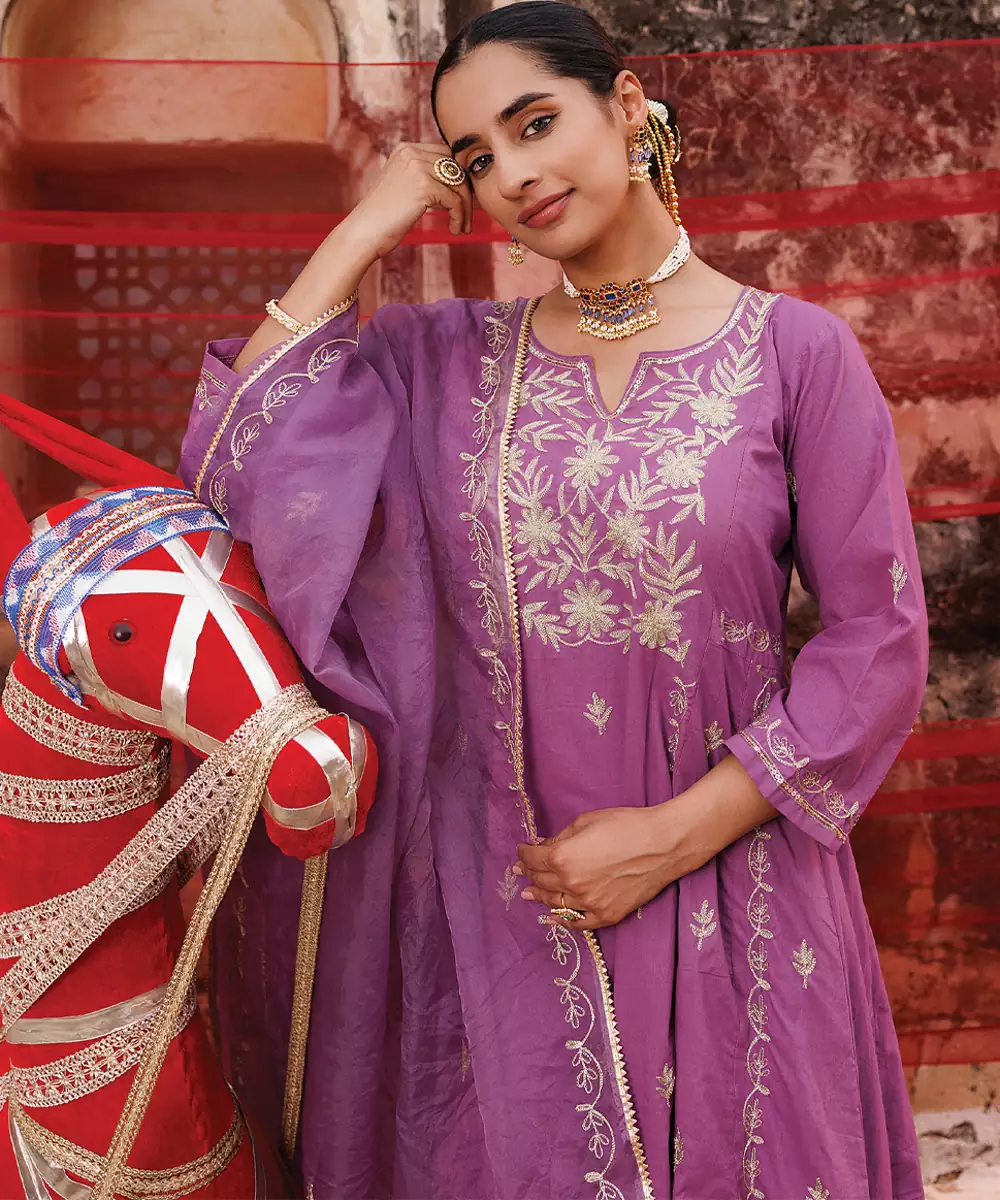 Soft And Soothing, This Lavender Embroidered Cotton Anarkali Set Showcases Delicate Craftsmanship With A Graceful Flare. The Breathable Fabric Ensures Comfort, While The Elegant Silhouette Enhances Its Charm. Ideal For Festive And Casual Wear, It Offers A Refined And Feminine Ethnic Look.