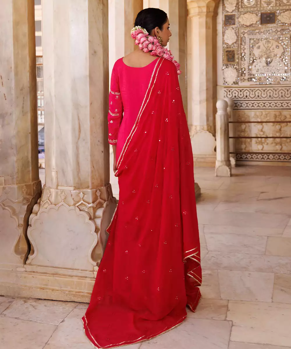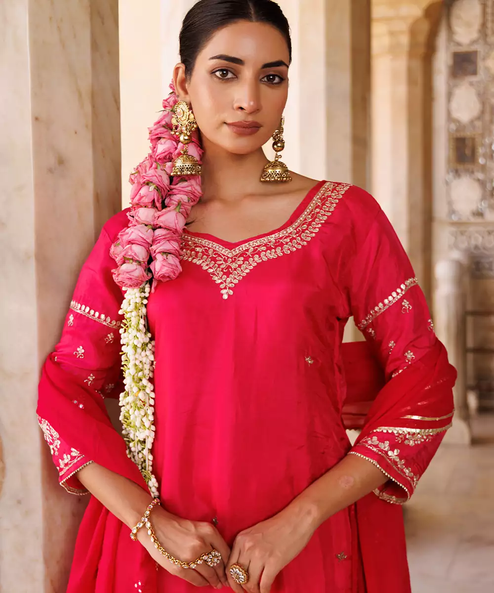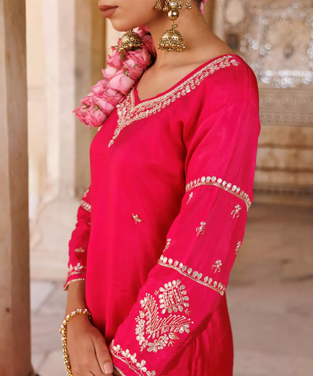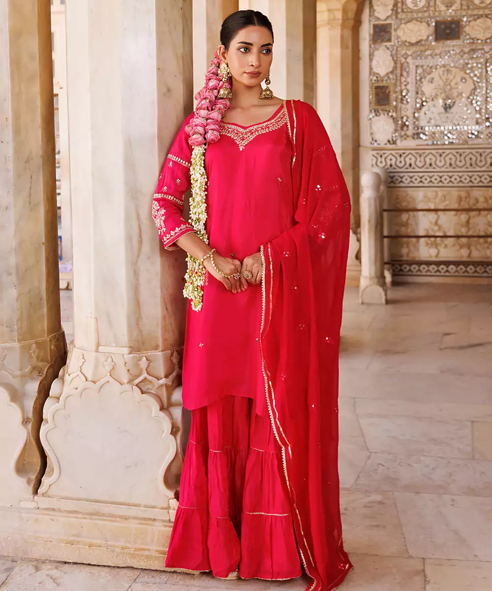 This Magenta Embroidered Silk Sharara Set Radiates Festive Elegance With Its Vibrant Hue And Intricate Embroidery. Crafted From Luxurious Silk Fabric, It Offers A Rich Texture And Graceful Silhouette. Perfect For Weddings, Celebrations, Or Festive Gatherings, This Set Adds A Bright, Traditional Charm To Your Ethnic Wardrobe.