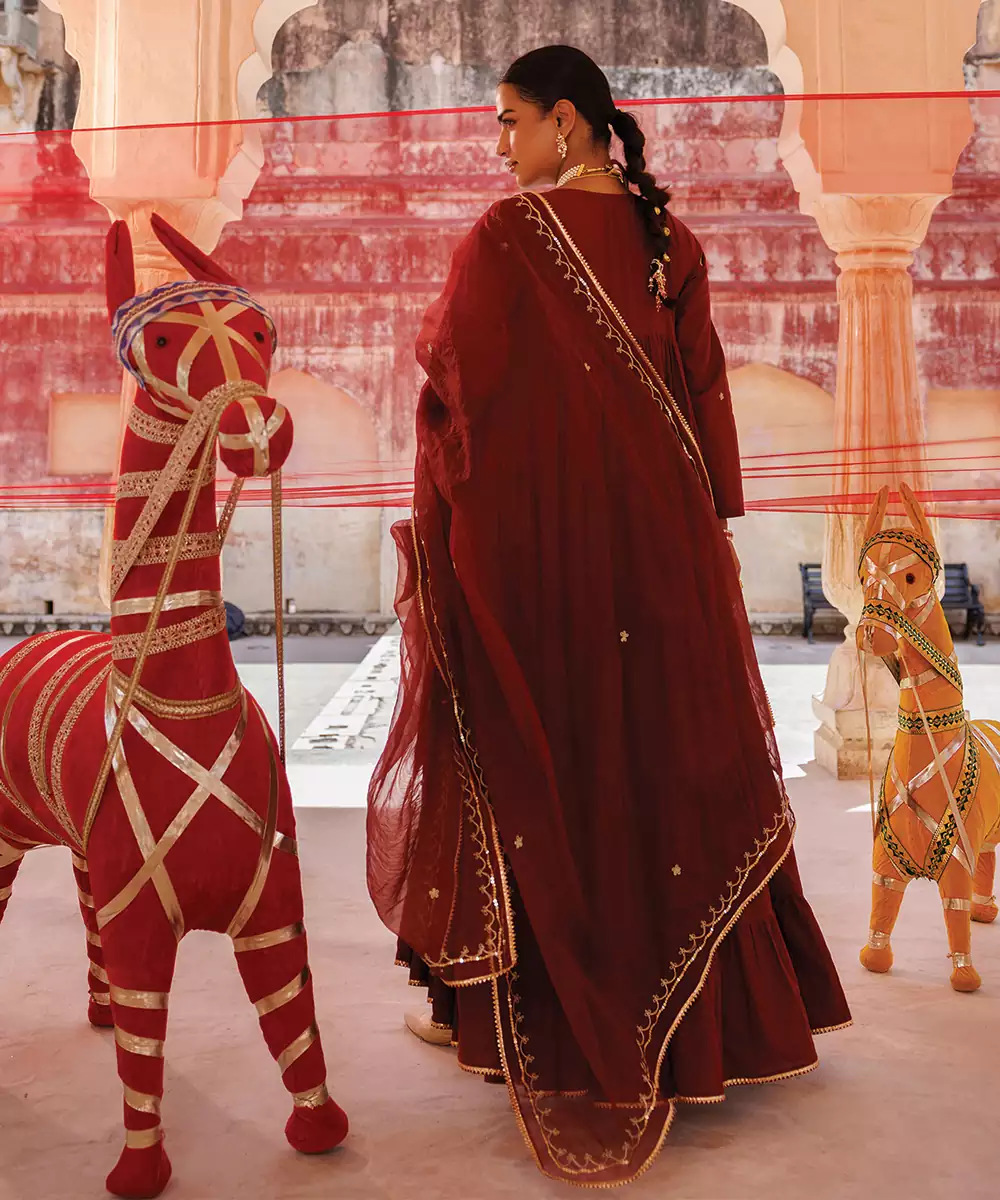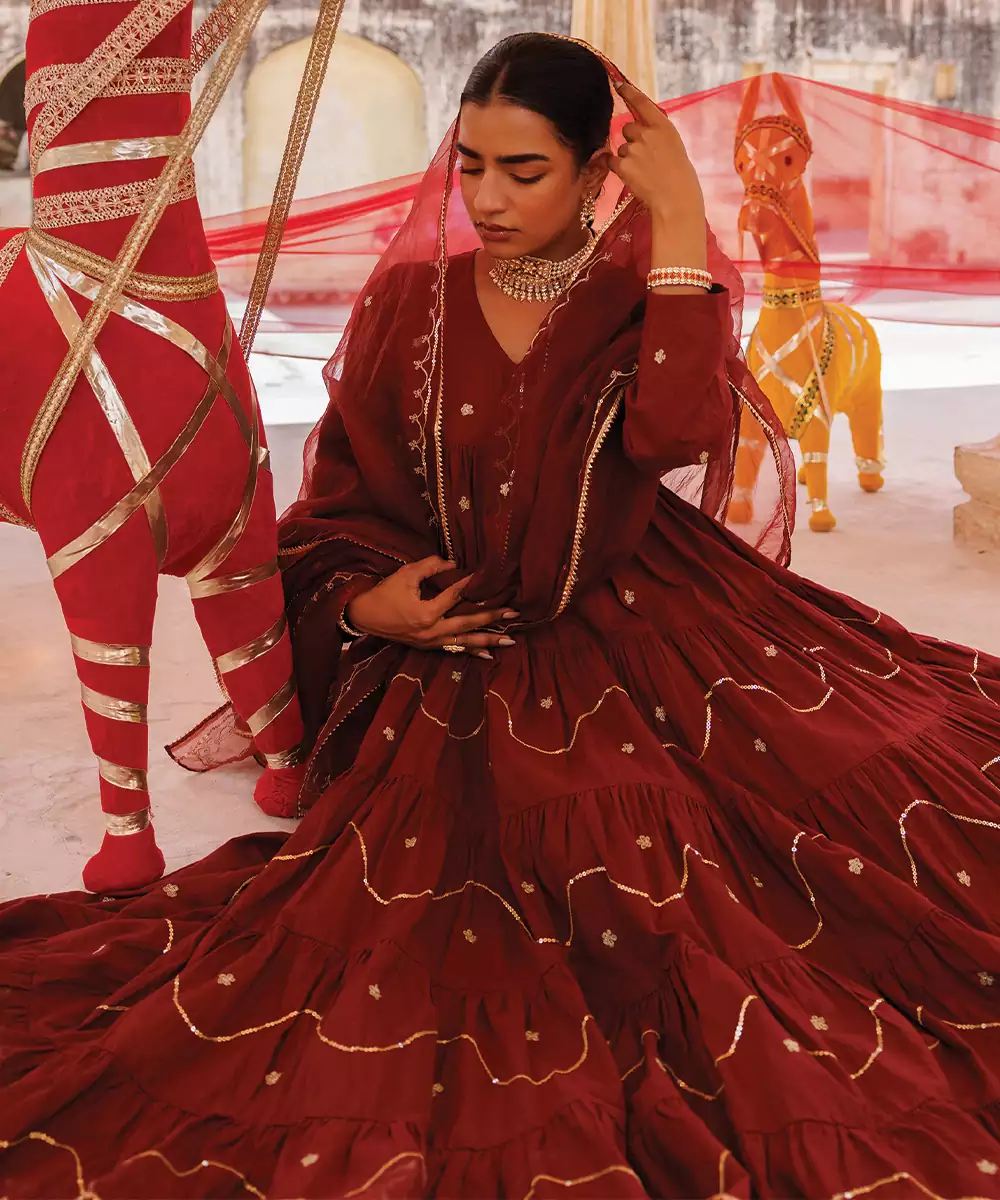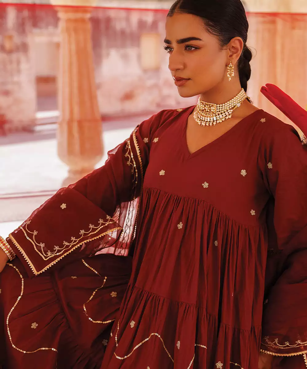 This Maroon Embroidered Cotton Anarkali Set Combines Rich Color With Delicate Detailing. The Soft Fabric Ensures Comfort, While The Flared Design Enhances Its Elegance. Ideal For Festive And Special Occasions, It Offers A Sophisticated And Timeless Ethnic Appeal.
