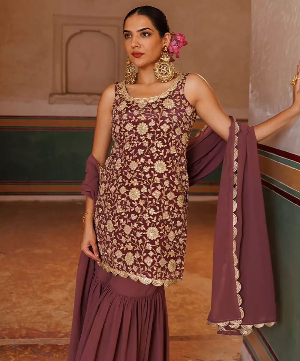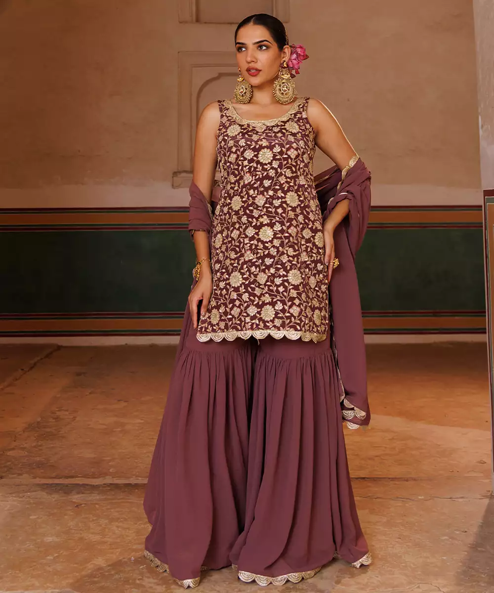 This Mauve Embroidered Crepe Sharara Set Showcases Elegance And Sophistication With Its Soft Hue And Intricate Embroidery. Made From Premium Crepe Fabric, It Offers A Smooth Texture And Graceful Drape. Perfect For Festive Occasions, Weddings, Or Parties, This Set Blends Timeless Charm With Modern Refinement Effortlessly.