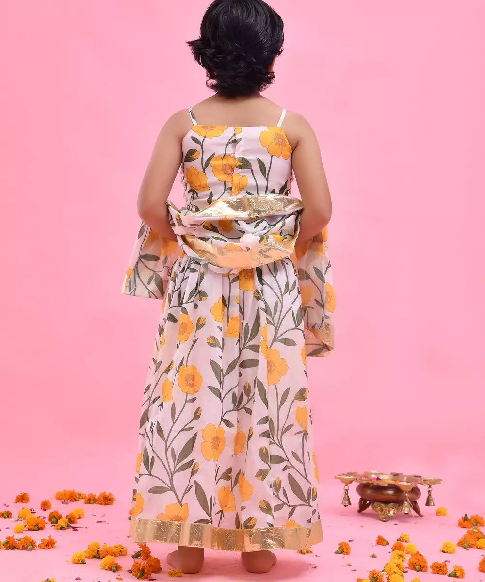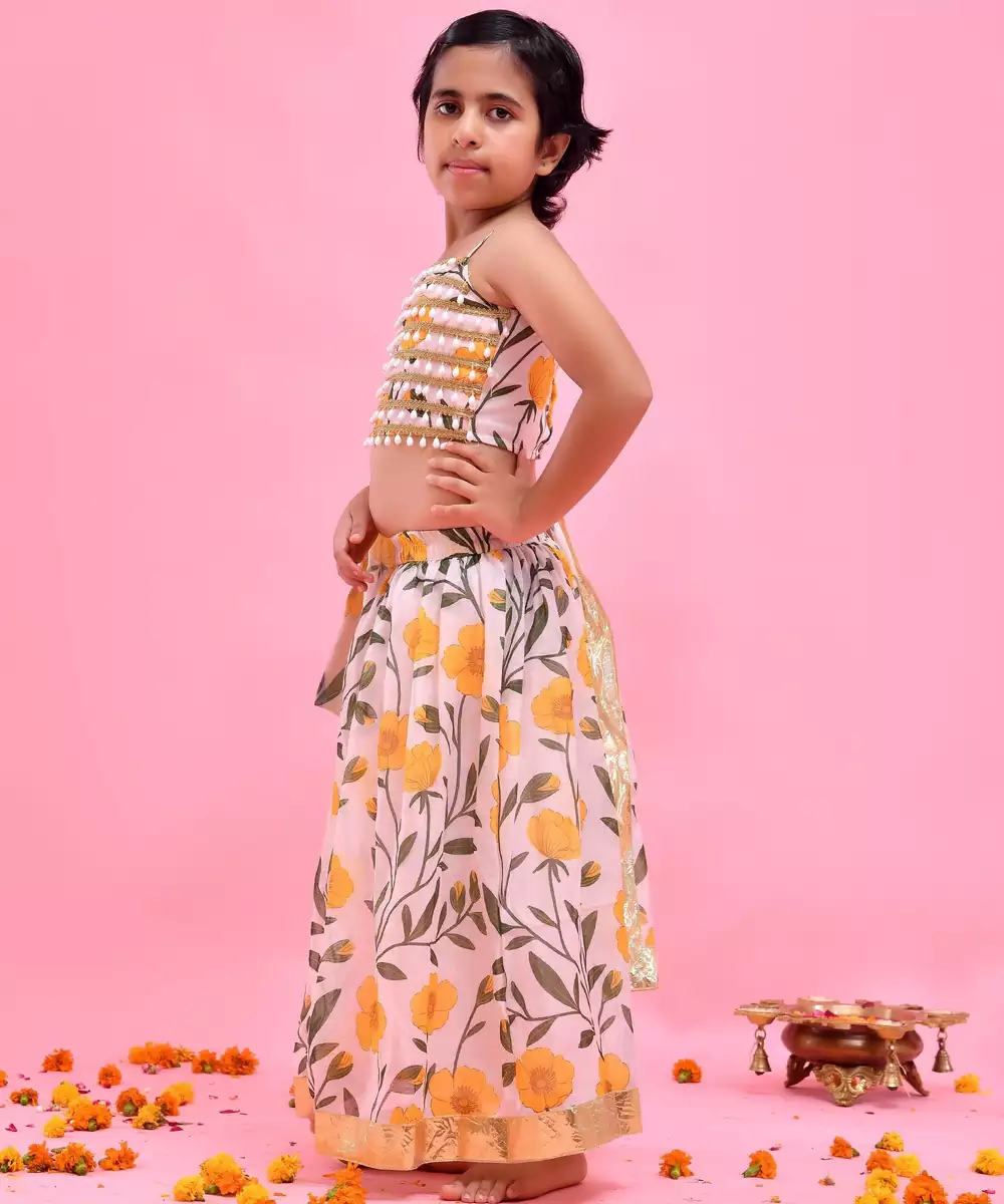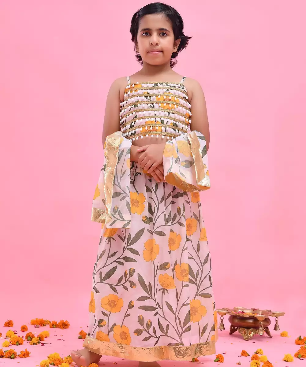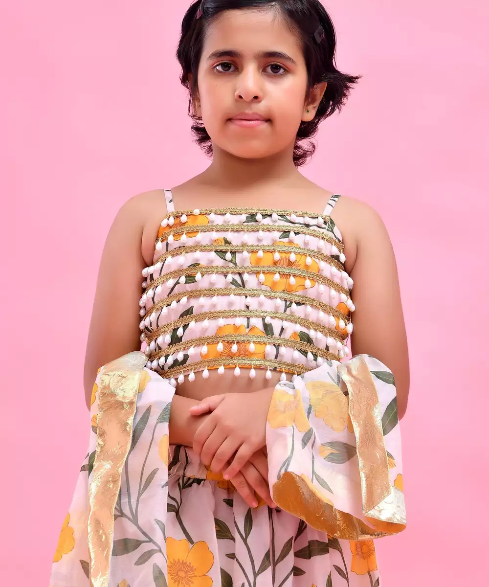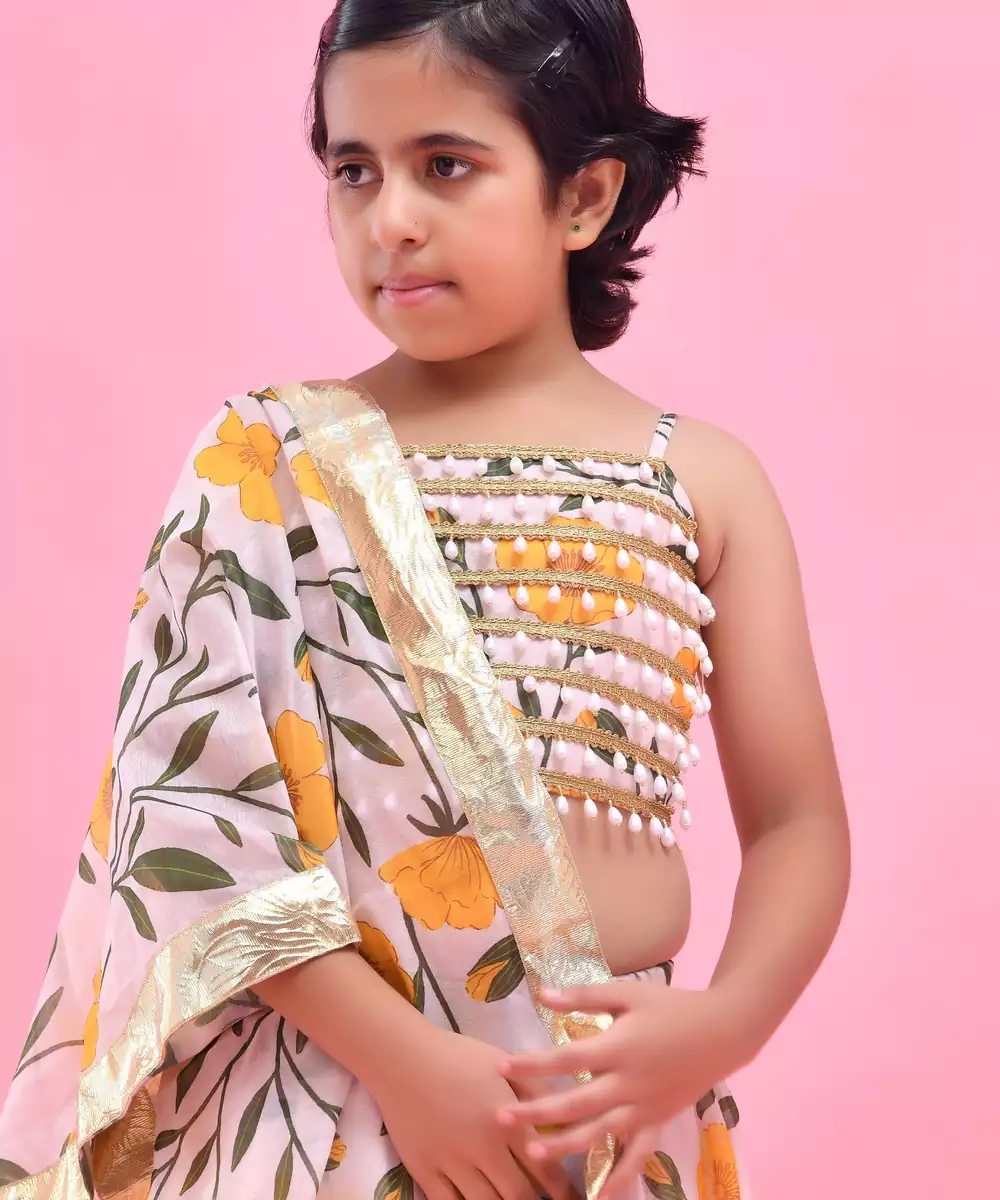 Featuring An Off White, Floral Printed Lehenga Set In Chanderi Fabric. It's Paired With A Pearl Lace Embellished Blouse And Chanderi Dupatta.