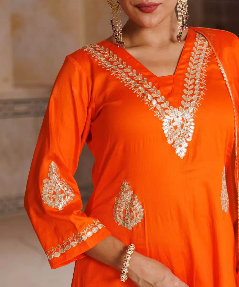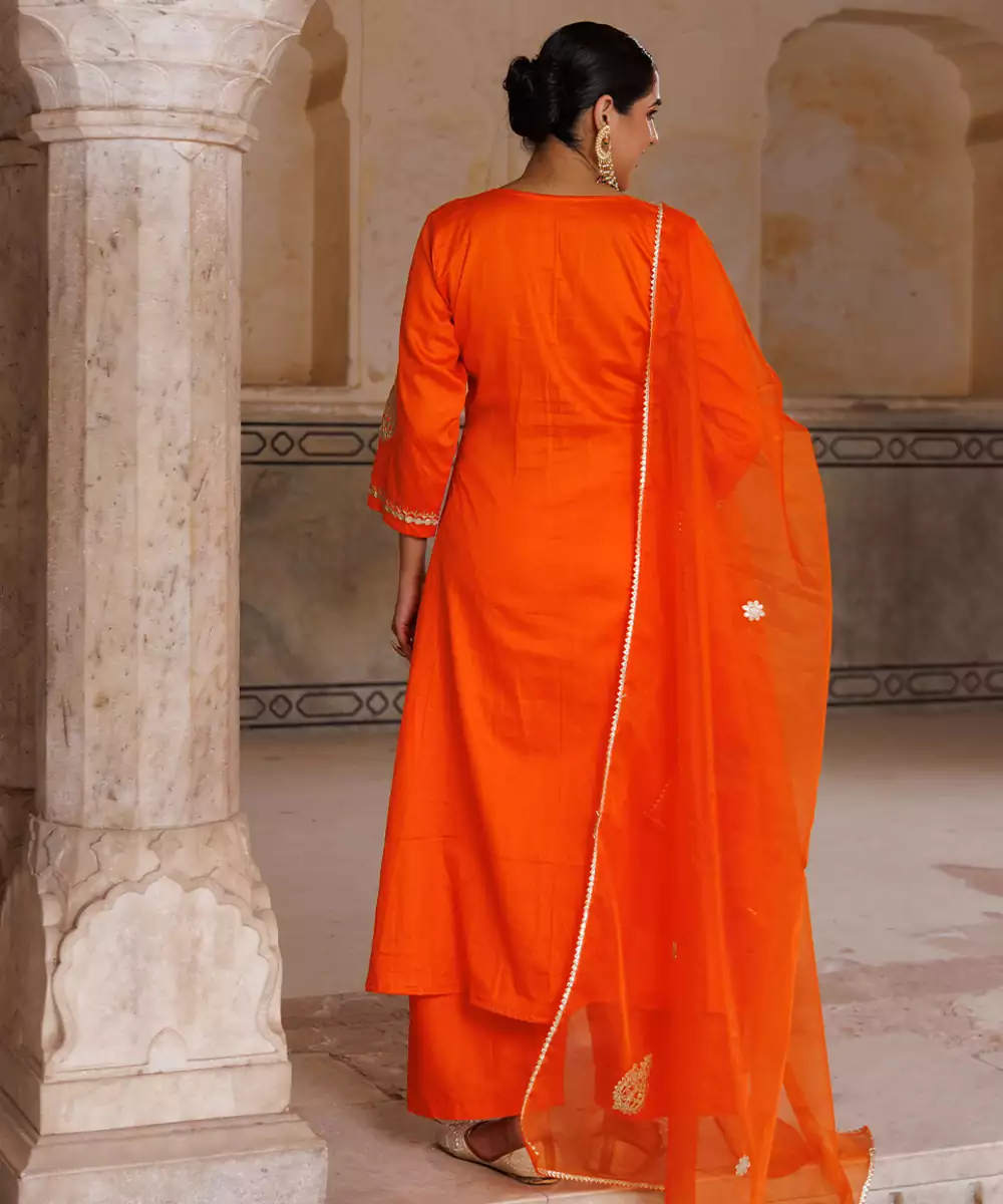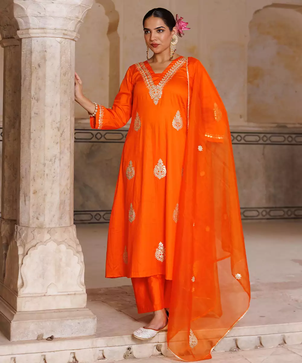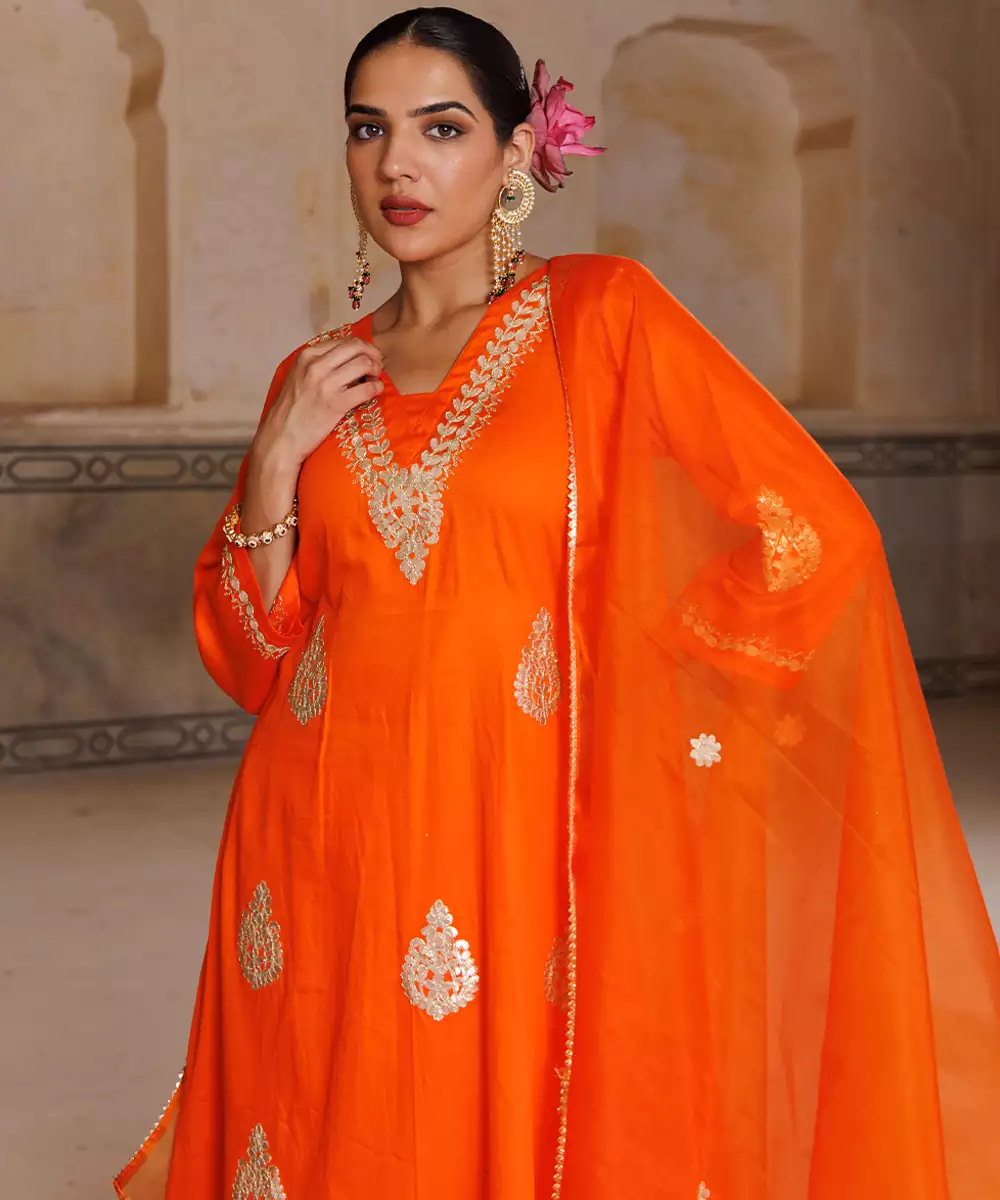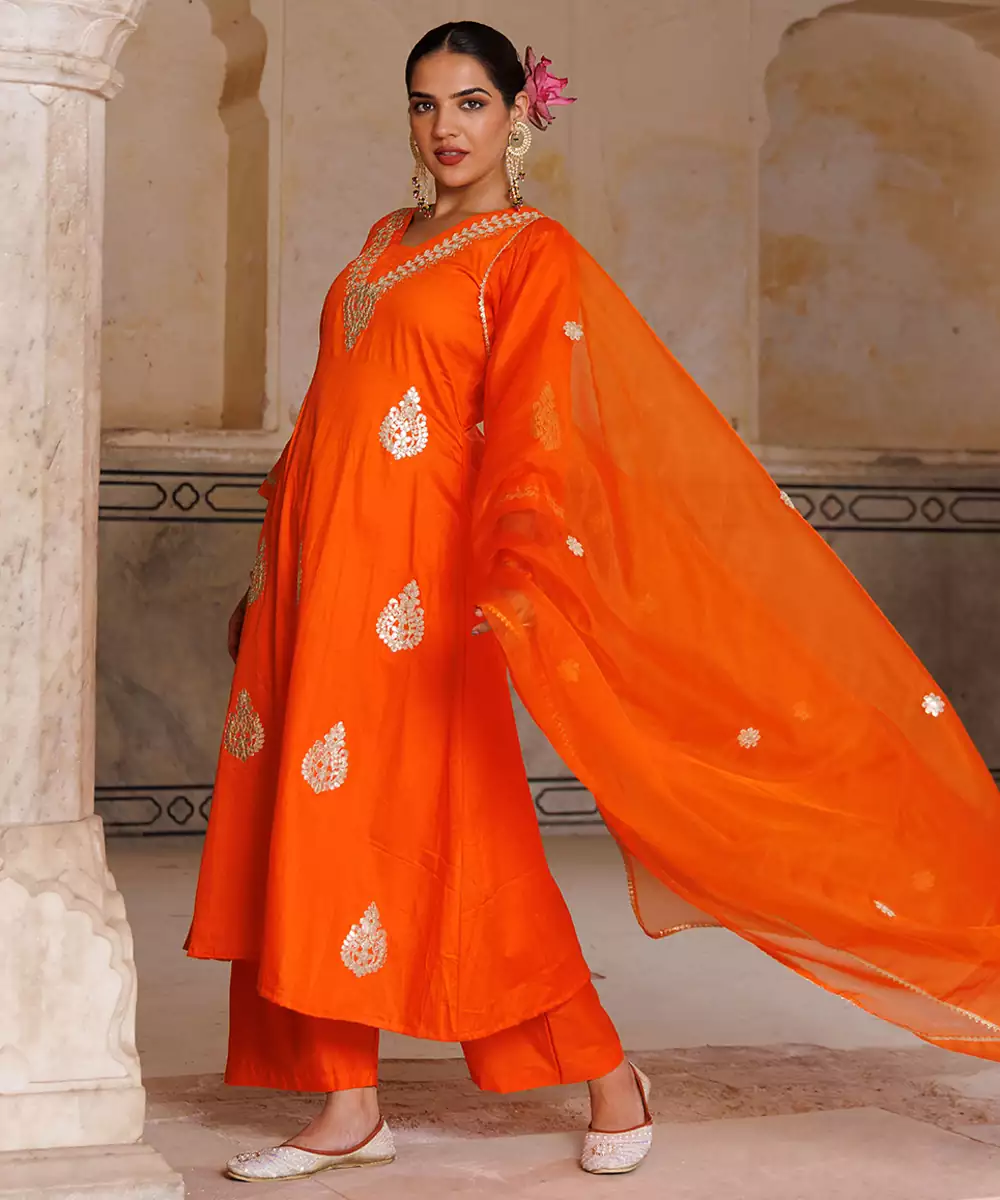 This Orange Embroidered Cotton Silk Anarkali Radiates Festive Charm With Its Vibrant Hue And Intricate Embroidery. Crafted From Premium Cotton Silk Fabric, It Offers A Smooth Texture And Comfortable Fit. Perfect For Weddings, Celebrations, Or Traditional Gatherings, This Anarkali Beautifully Blends Elegance, Grace, And Timeless Ethnic Appeal.