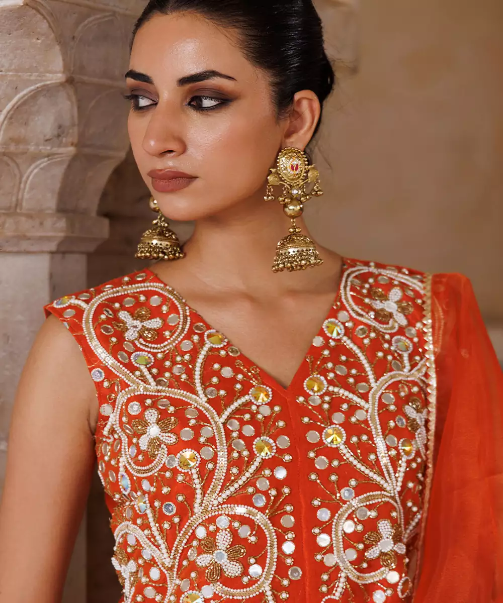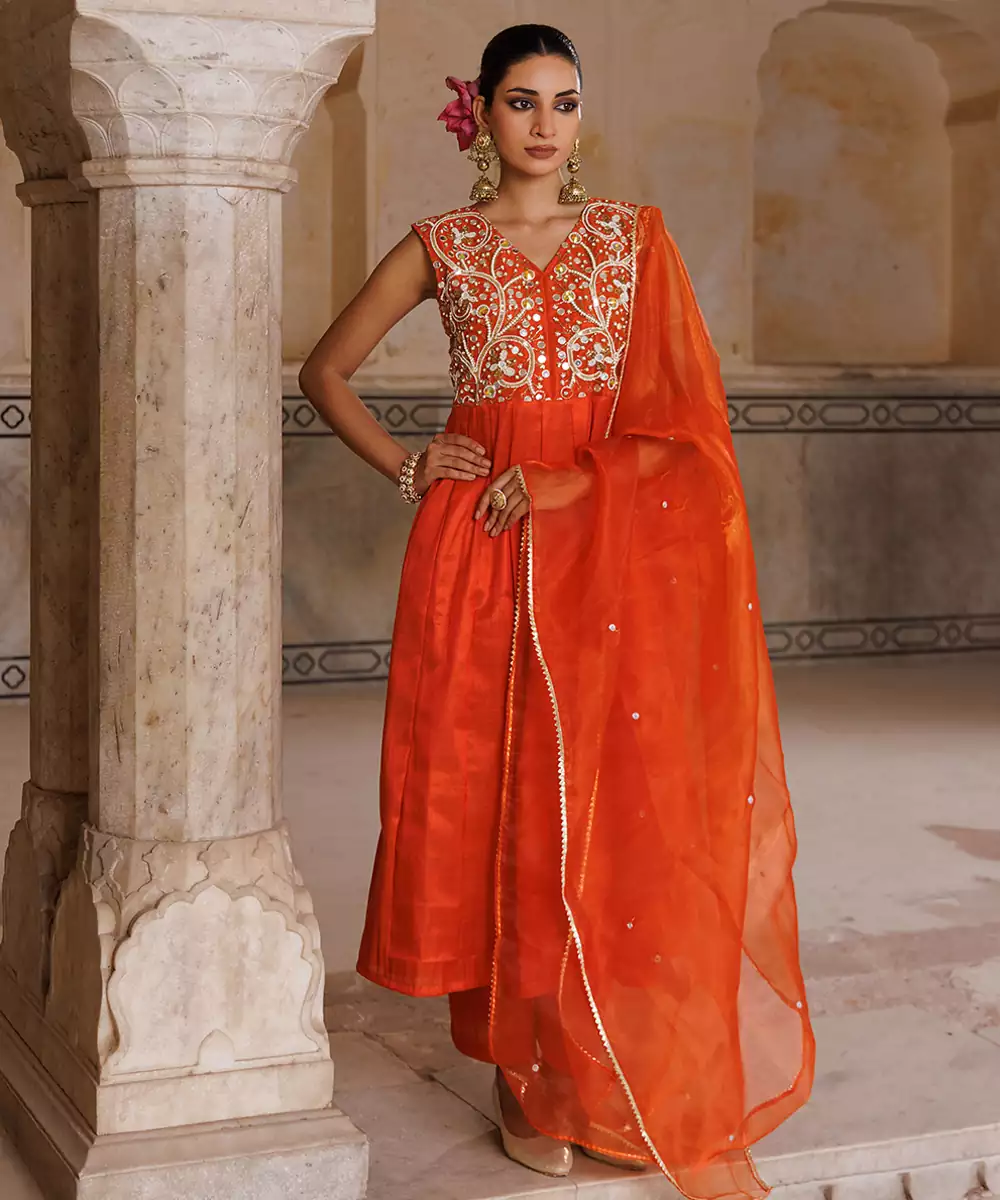 This Orange Embroidered Silk Kurta Set Exudes Timeless Elegance With Its Rich Silk Fabric And Intricate Embroidery. The Soft Pink Hue Adds A Touch Of Grace, While The Smooth Texture Ensures All Day Comfort. Perfect For Festive Occasions, Weddings, Or Celebrations, This Set Beautifully Combines Luxury With Traditional Charm.