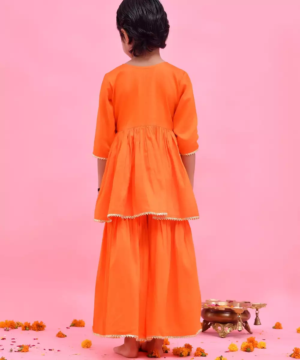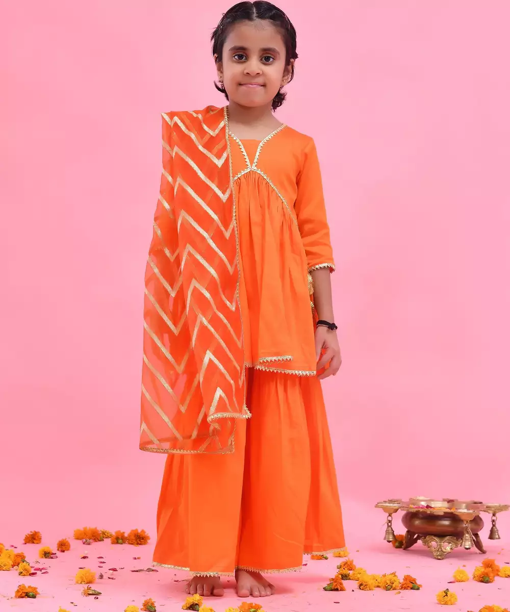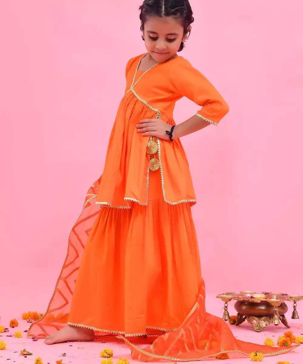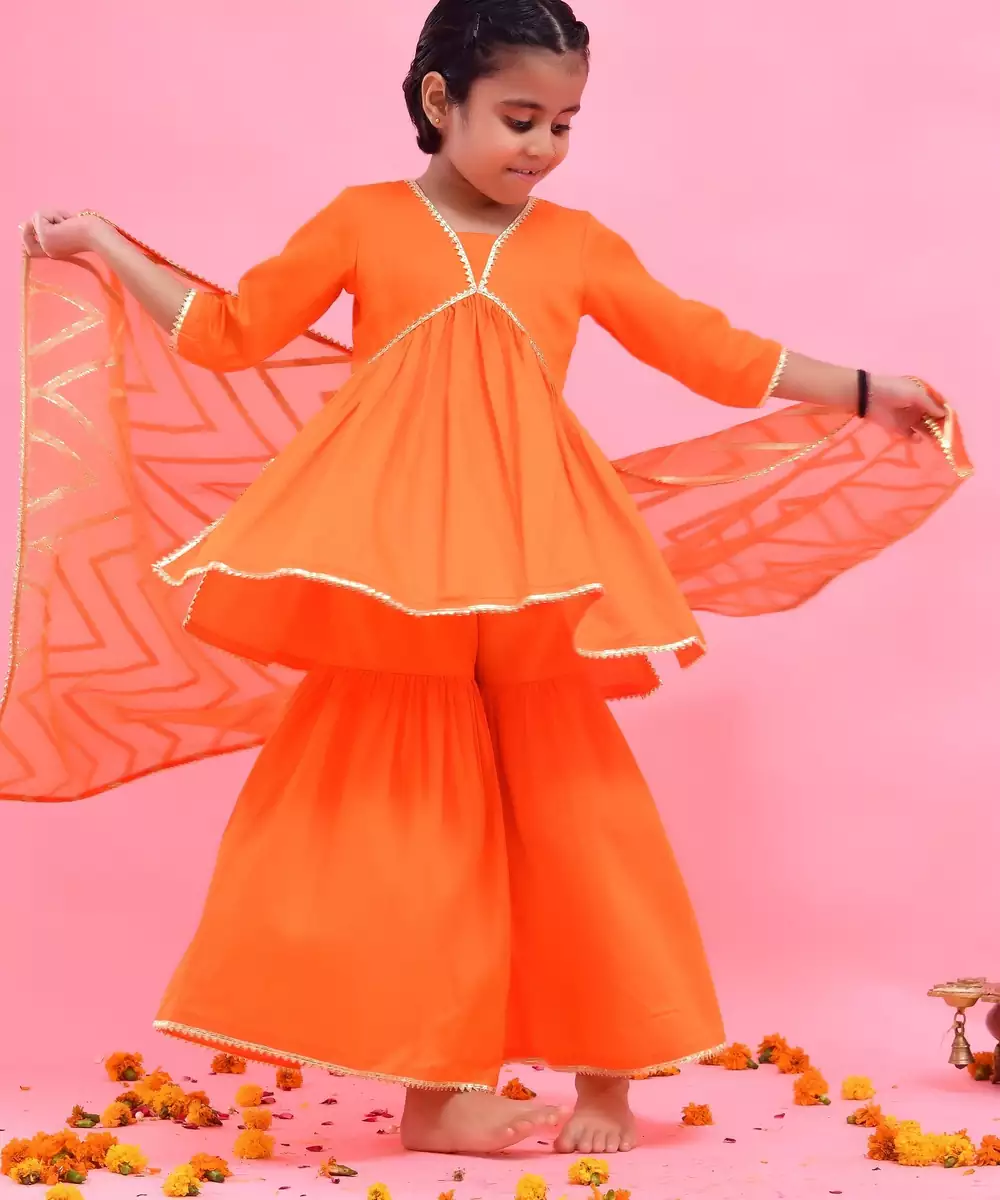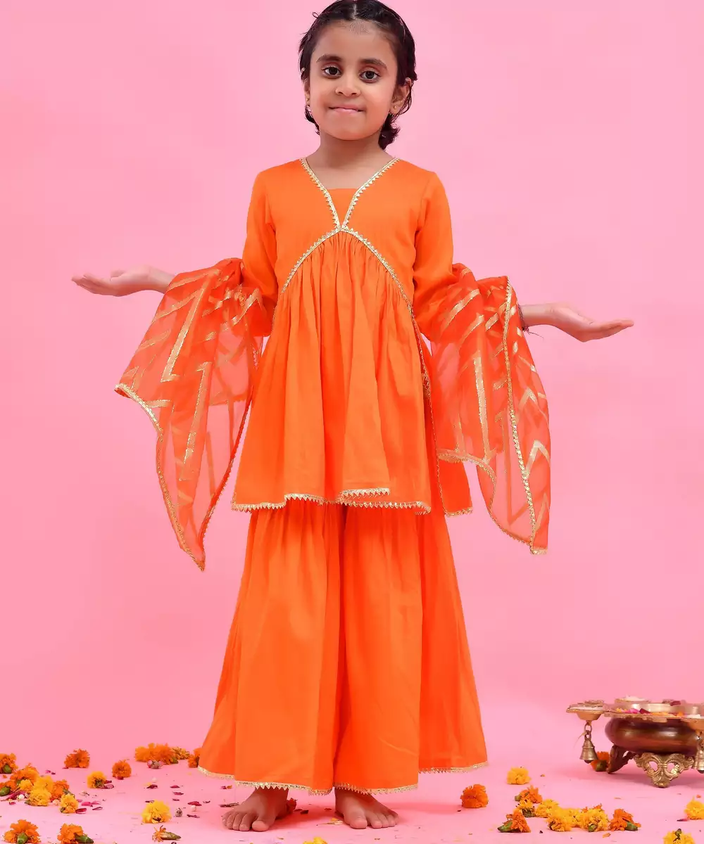 Featuring An Orange, Solid Cotton Silk Kurta, Sharara And Zari Woven Organza Dupatta With Gota Lace Details. Colour: Orange Fabric: Cotton Silk Components: 1 / Kurta 1 / Sharara 1 / Dupatta