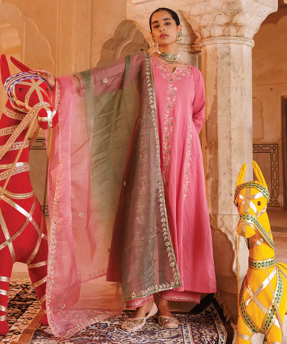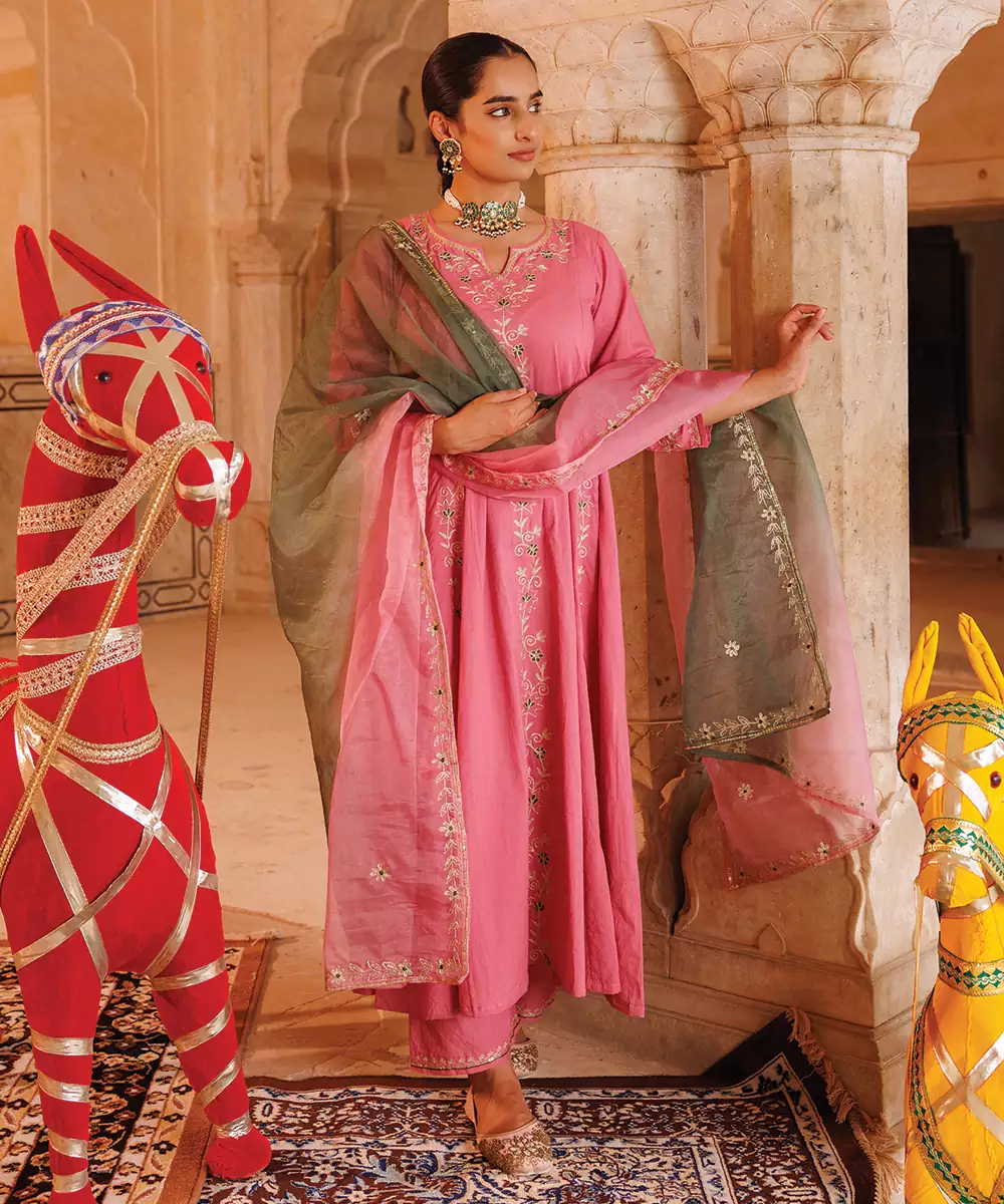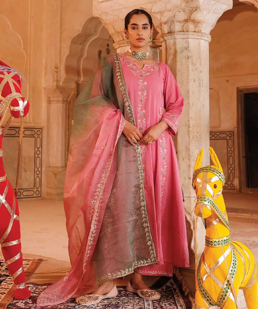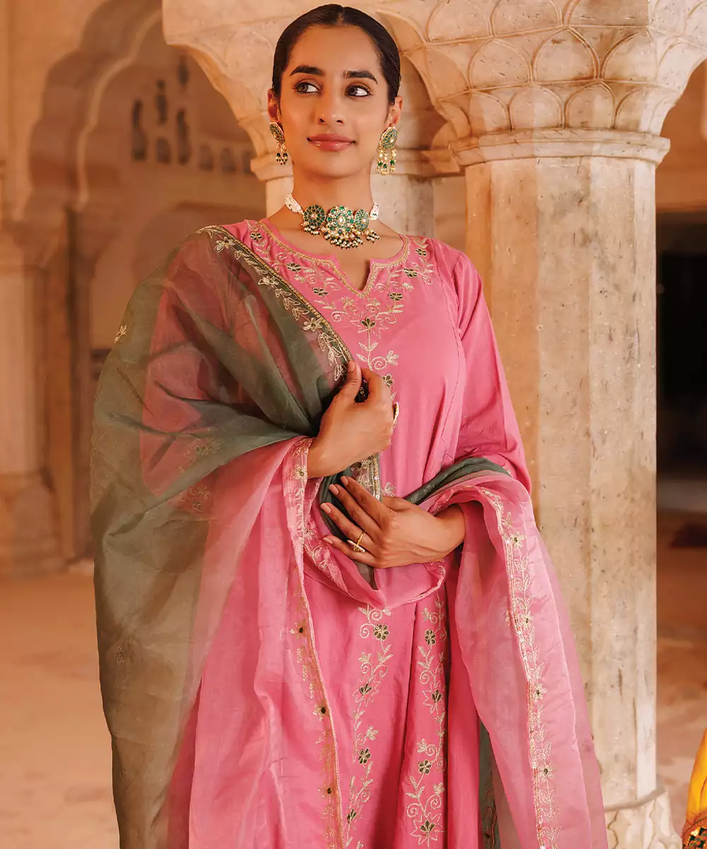 Soft And Elegant, This Pink Embroidered Cotton Anarkali Set Features Delicate Detailing On Breathable Fabric. The Flowy Silhouette Ensures Comfort And Grace, Making It Perfect For Festive And Casual Occasions. A Charming Outfit That Adds Femininity And Timeless Appeal To Your Wardrobe.