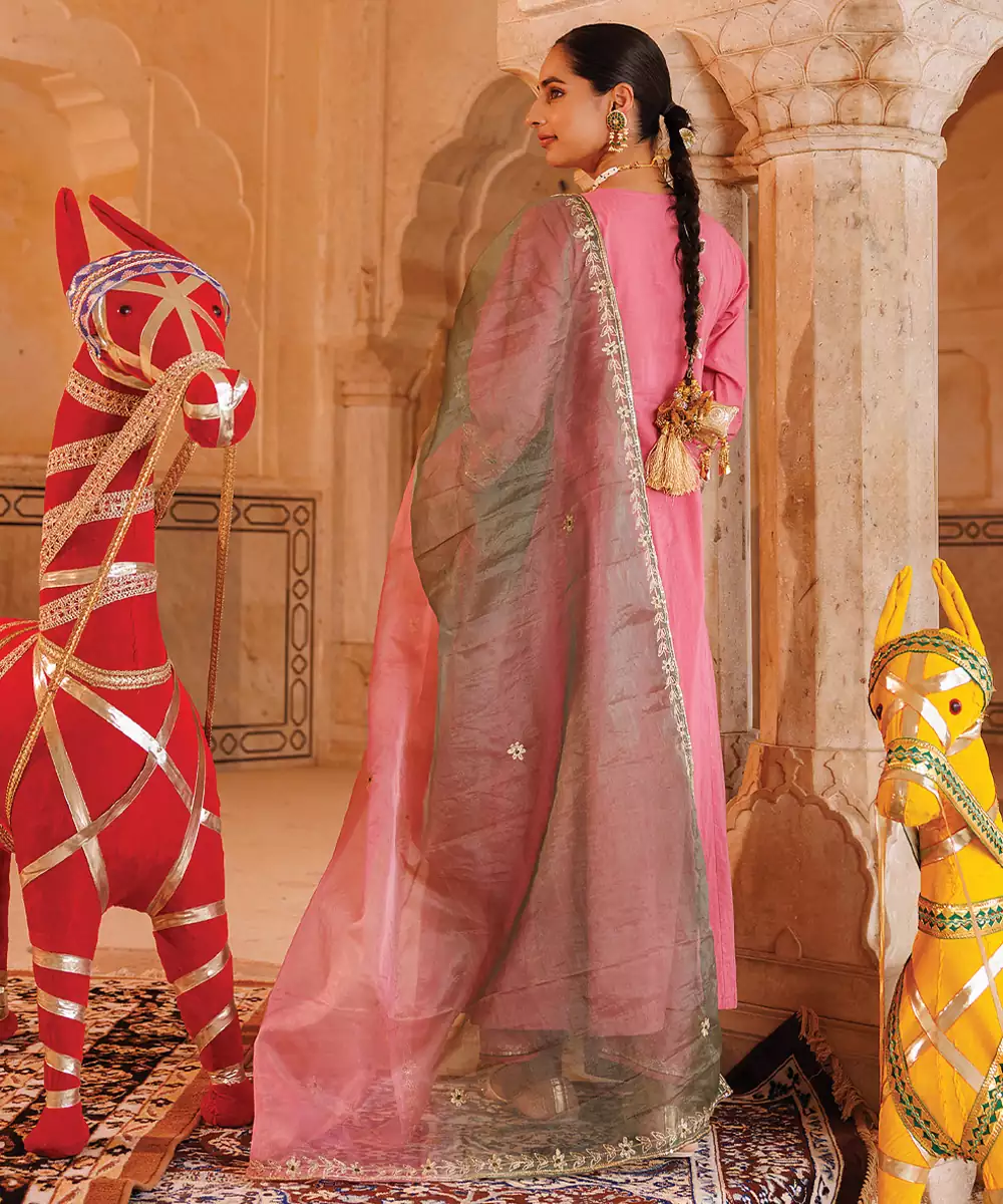 Pink Cotton Anarkali Set With Dual Shaded Dupatta
