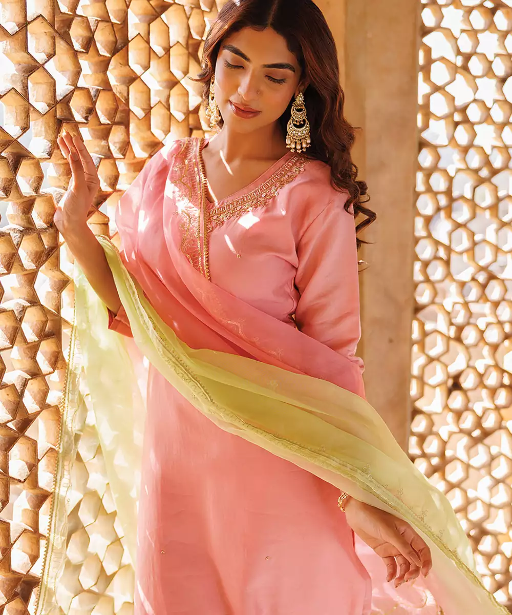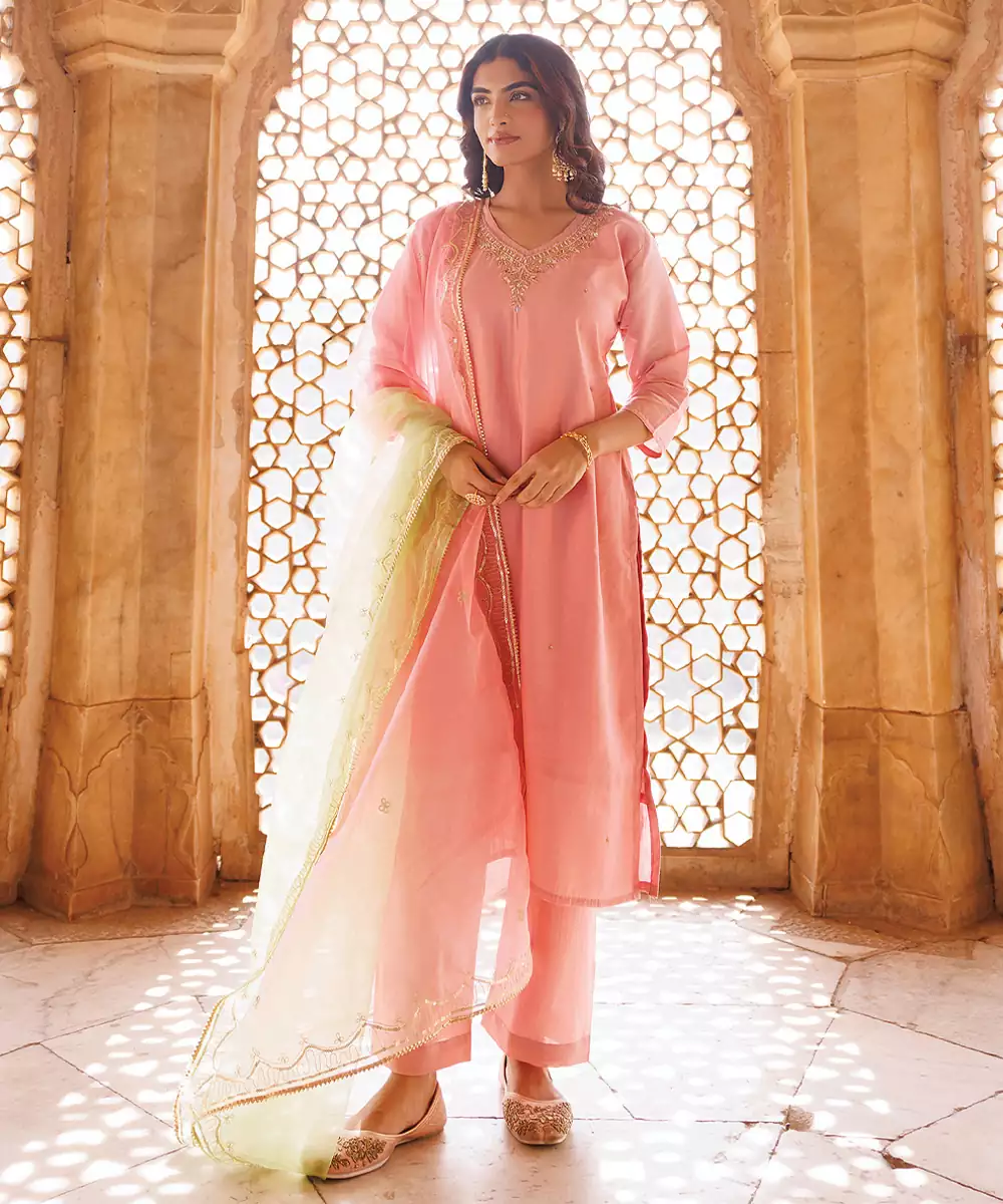 This Pink Embroidered Art Silk Kurta Set Offers A Perfect Blend Of Softness And Elegance. The Refined Detailing And Subtle Sheen Enhance Its Appeal, Making It Suitable For Festive And Casual Occasions. A Versatile Outfit That Adds Charm And Grace To Your Look.