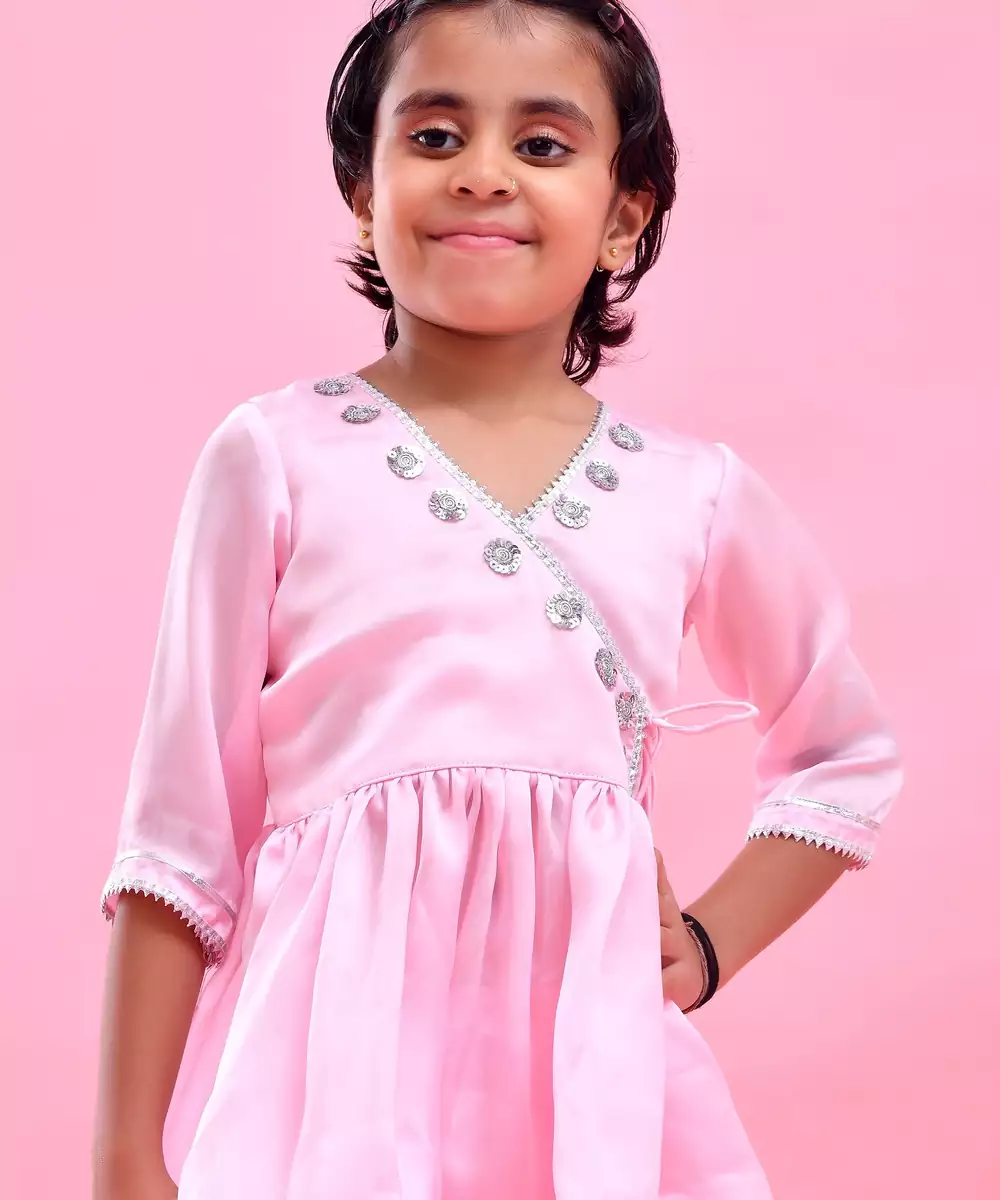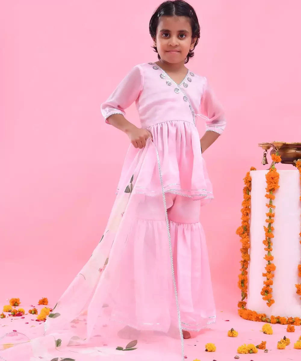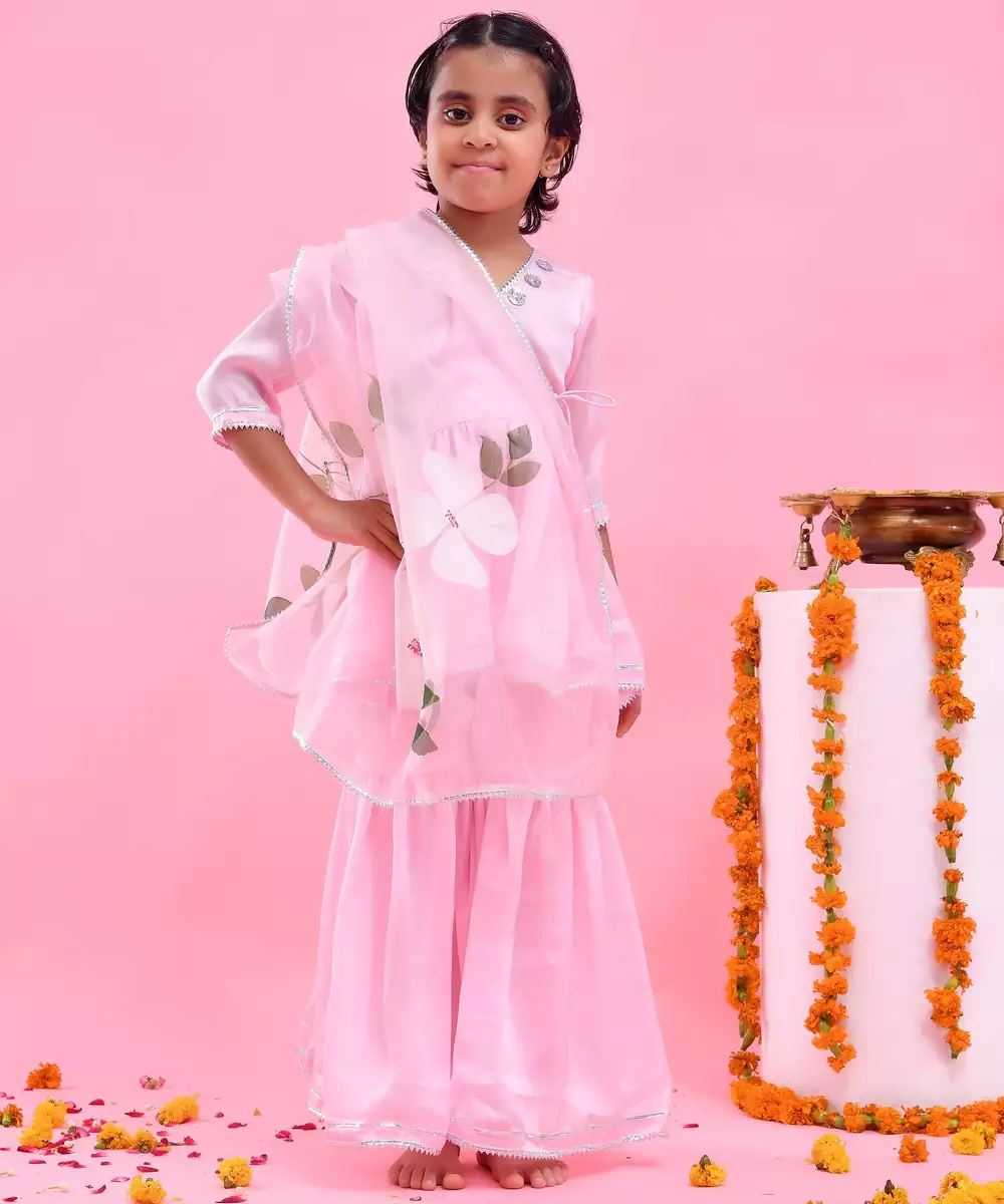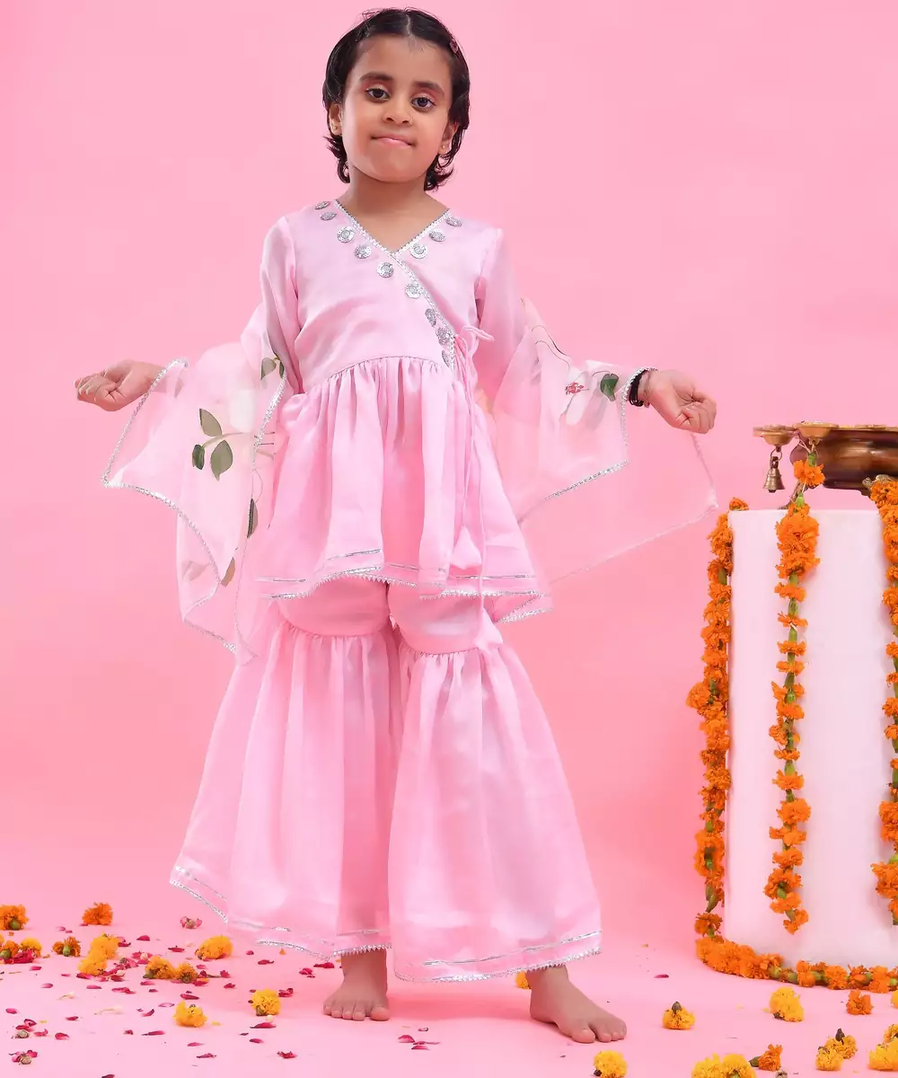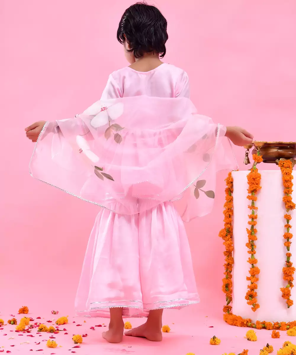 Featuring A Pink, Satin Georgette Fabric And Gota Embellished Kurta, Sharara And Hand Painted Organza Dupatta. Colour: Pink Fabric: Satin Georgette Components: 1 / Kurta 1 / Sharara 1 / Dupatta