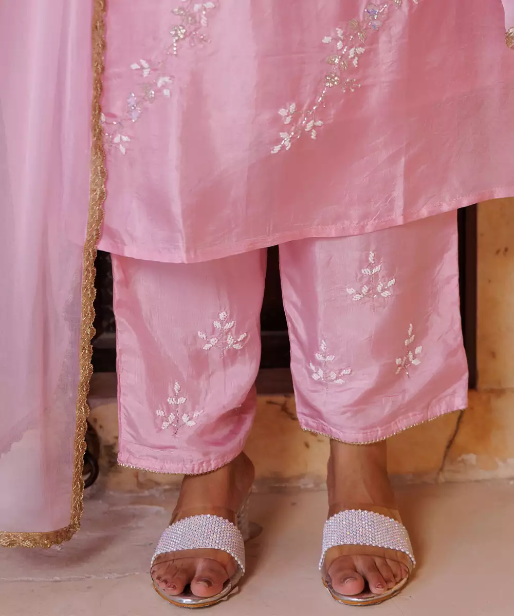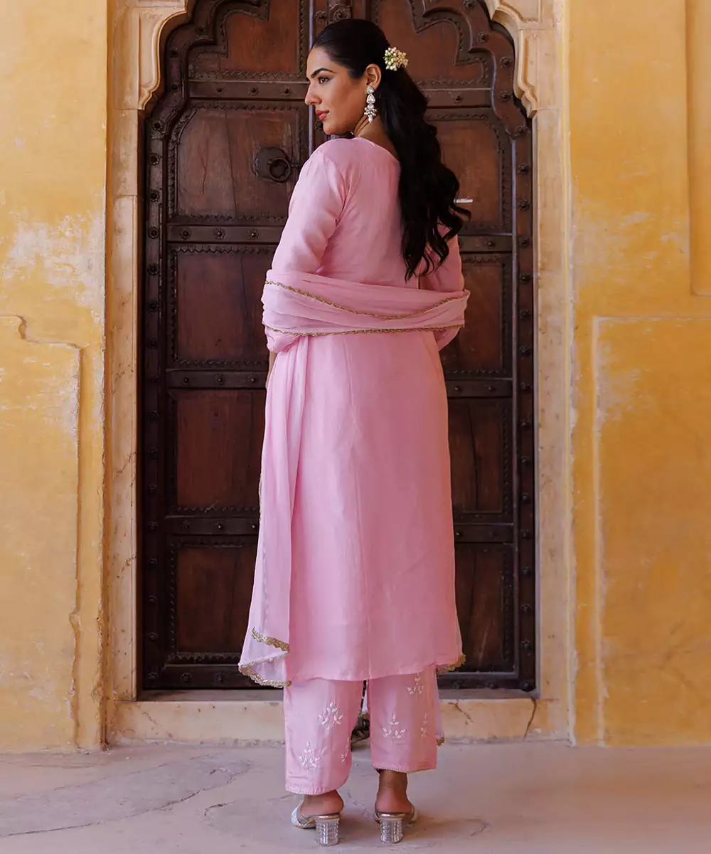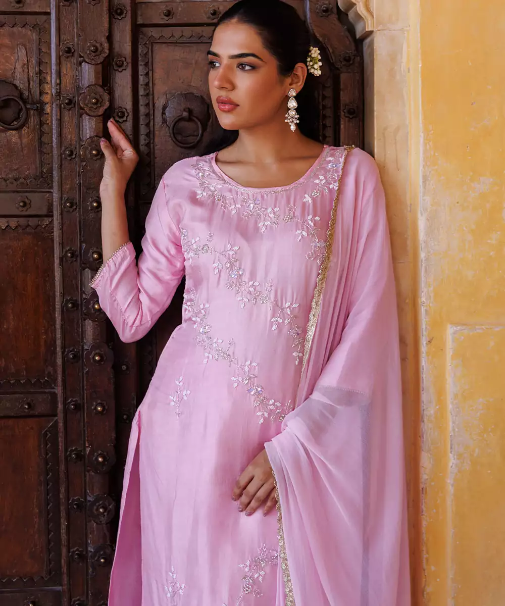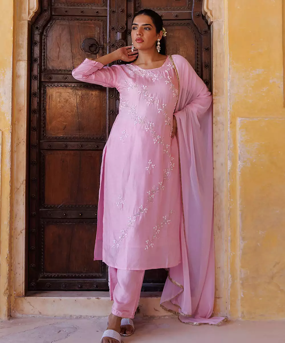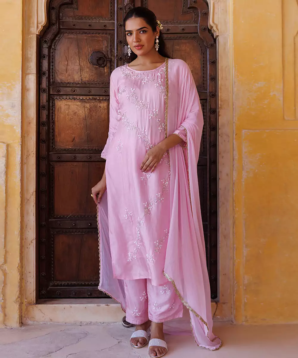 This Pink Embroidered Silk Kurta Set Exudes Timeless Elegance With Its Rich Silk Fabric And Intricate Embroidery. The Soft Pink Hue Adds A Touch Of Grace, While The Smooth Texture Ensures All Day Comfort. Perfect For Festive Occasions, Weddings, Or Celebrations, This Set Beautifully Combines Luxury With Traditional Charm.