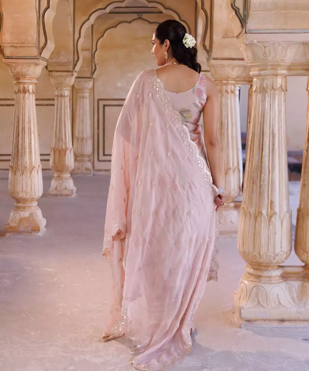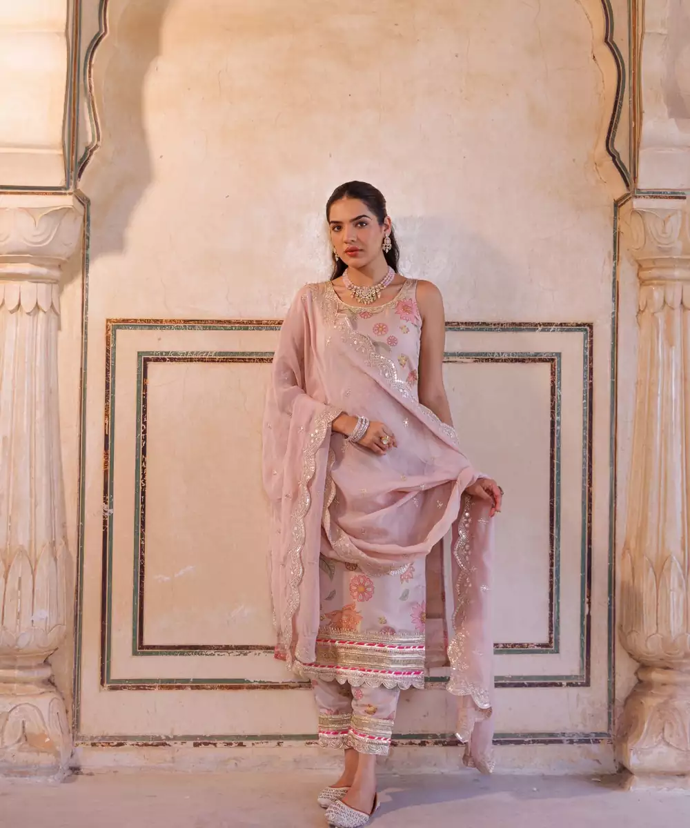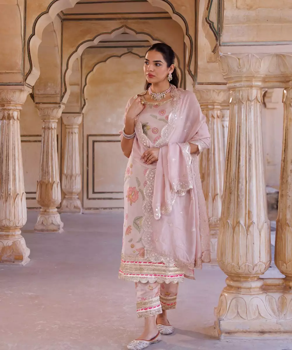 Pastel Pink Tissue, Floral Printed Kurta Set With Lace Embellished Details On Kurta & Pant. Paired With An Embroidered Georgette Dupatta. Color: Pink Fabric: Tissue Components: 1 Kurta / 1 Pant / 1 Dupatta