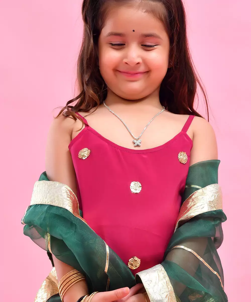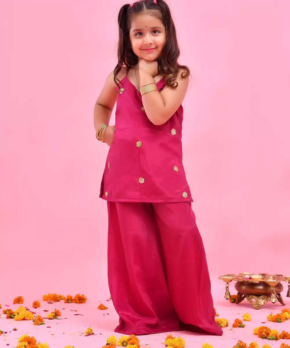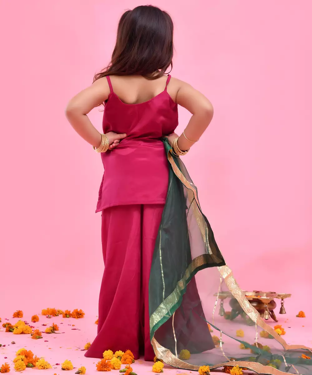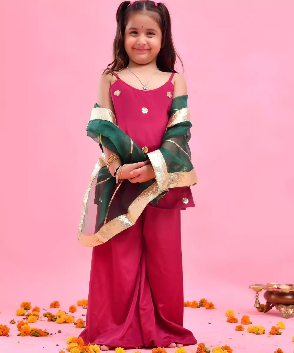 Featuring A Wine Colour, Sharara And Short Kurta In Crepe Fabric. It's Paired With A Contrast Colour, Green, Gota Embellished, Organza Dupatta. Colour: Pink Fabric: Crepe Silk Components: 1 / Kurta 1 / Sharara 1 / Dupatta
