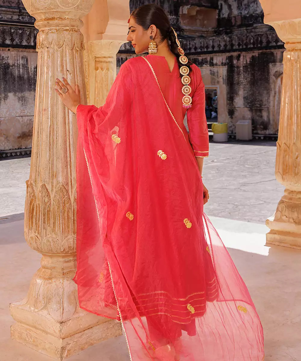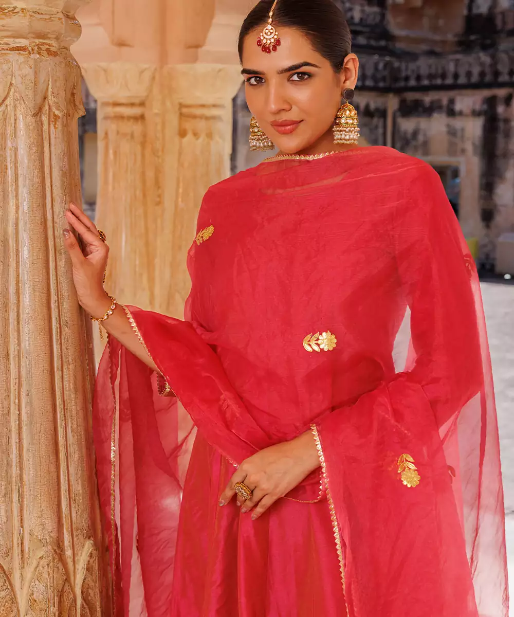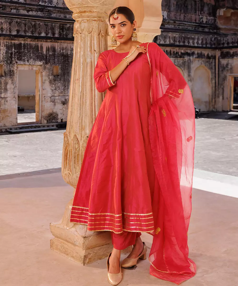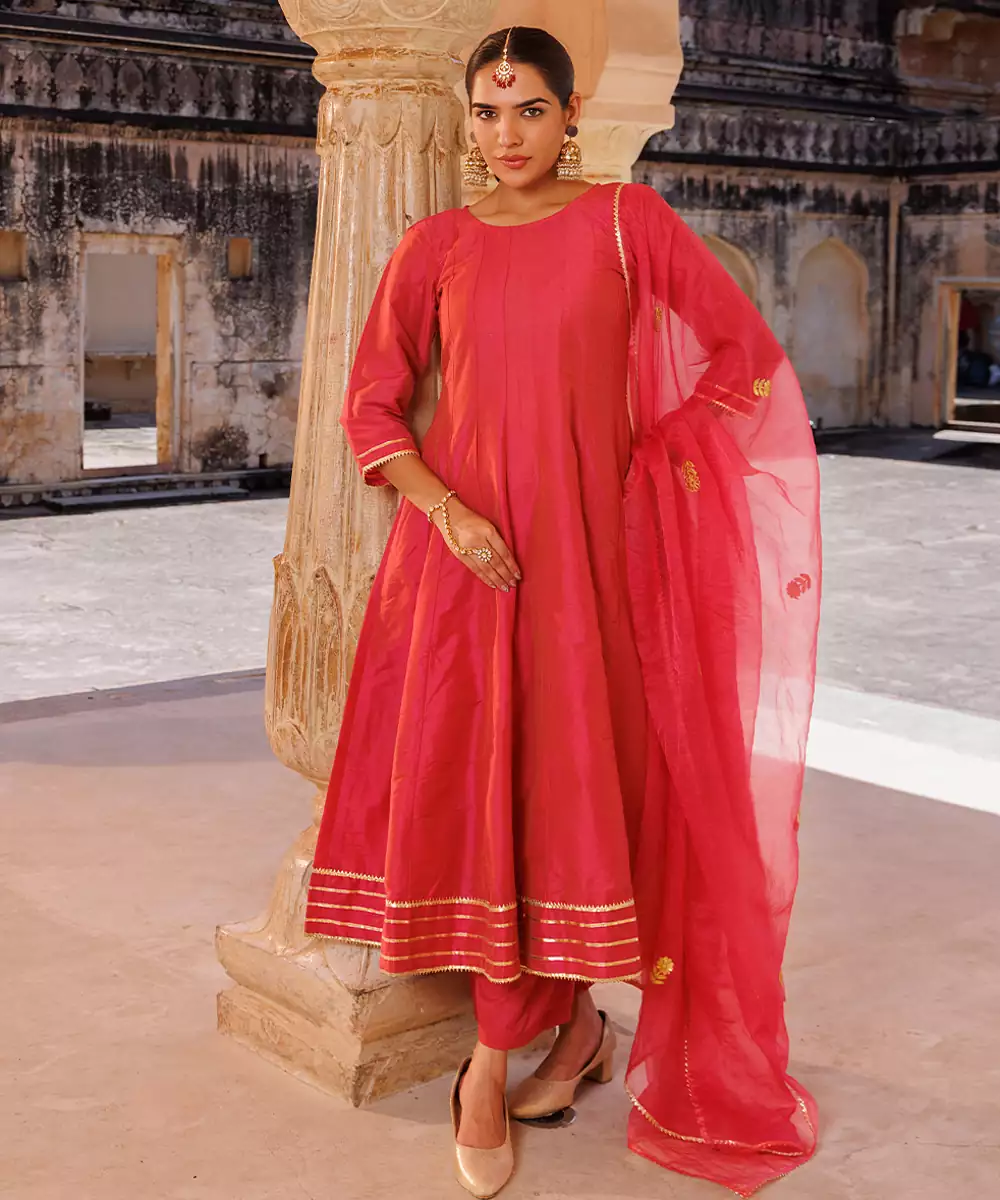 This Pink Plain Raw Silk Anarkali Exudes Subtle Elegance With Its Rich Texture And Graceful Flow. Crafted From Premium Raw Silk Fabric, It Offers A Luxurious Feel And Flattering Silhouette. Perfect For Festive Occasions, Weddings, Or Traditional Gatherings, This Anarkali Adds Timeless Charm And Sophistication To Your Ethnic Wardrobe.