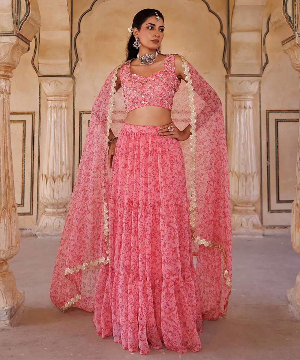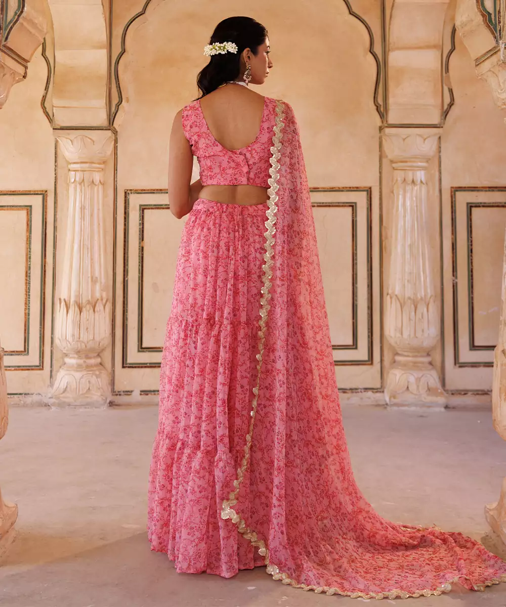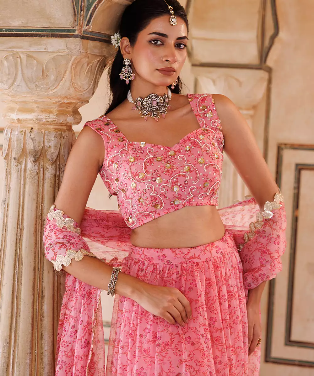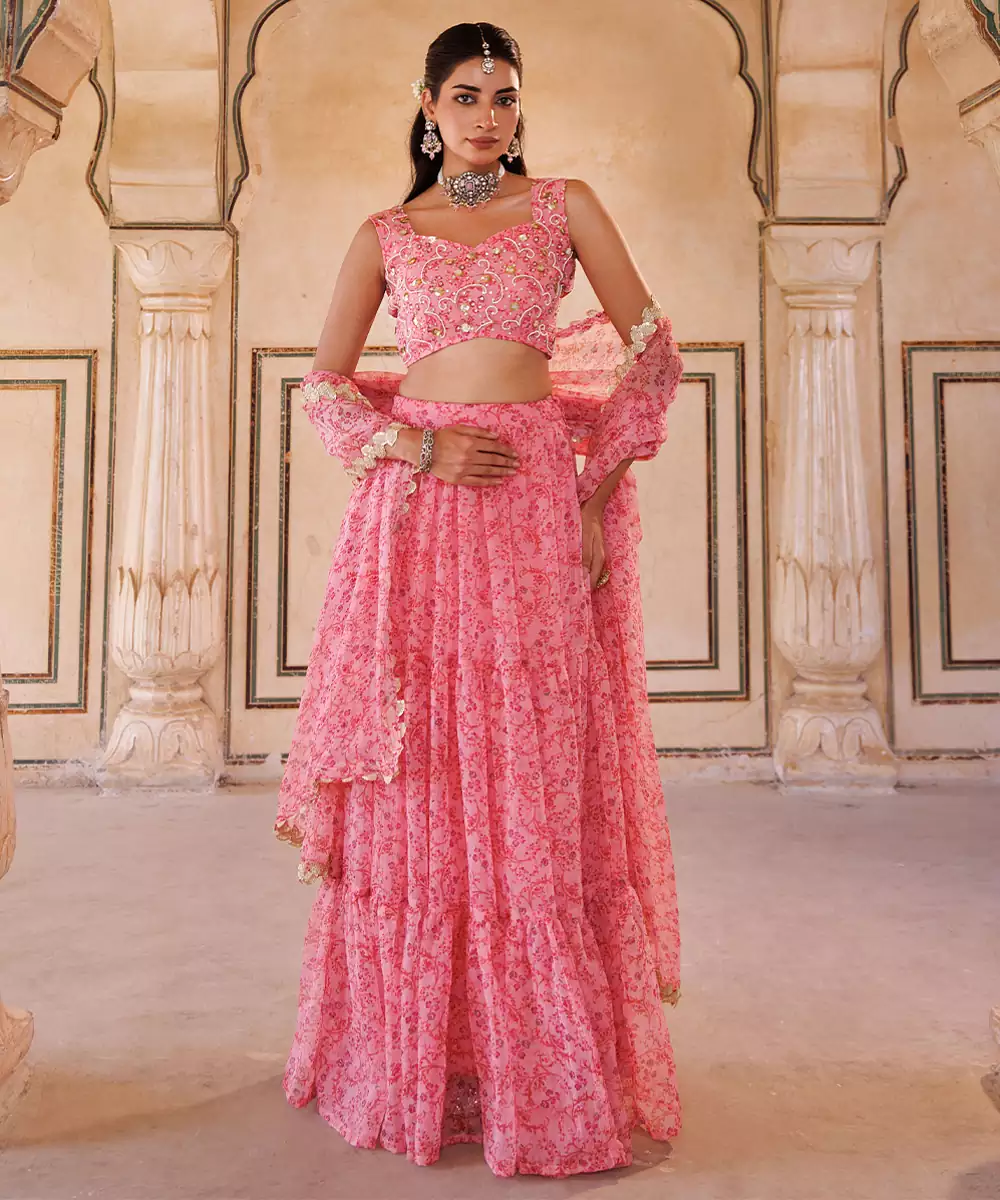 This Pink Printed Chiffon Lehenga Set Showcases A Soft, Feminine Charm With Its Lightweight, Flowy Silhouette. The Delicate Prints Add A Refreshing Touch, While The Airy Chiffon Fabric Ensures Elegant Movement. Paired With A Matching Blouse And Dupatta, It’s Perfect For Festive Functions, Daytime Celebrations, And Graceful Traditional Styling.