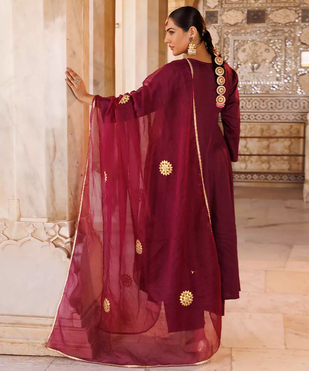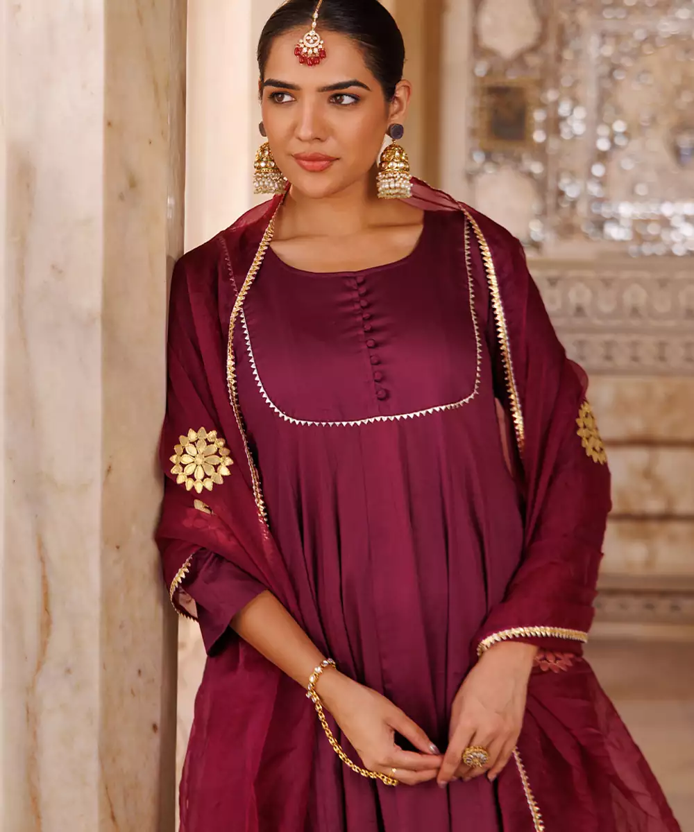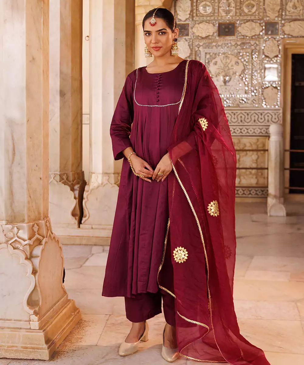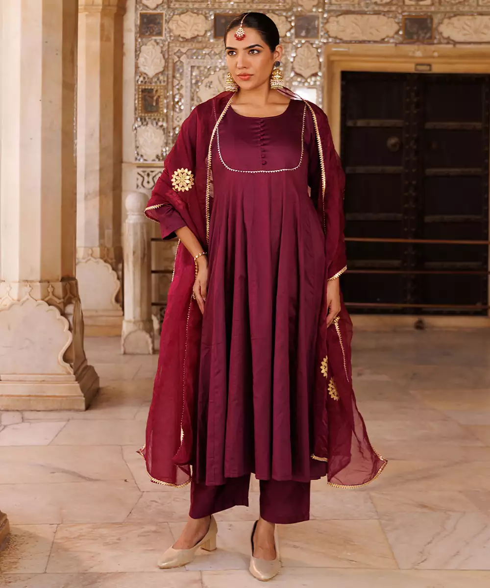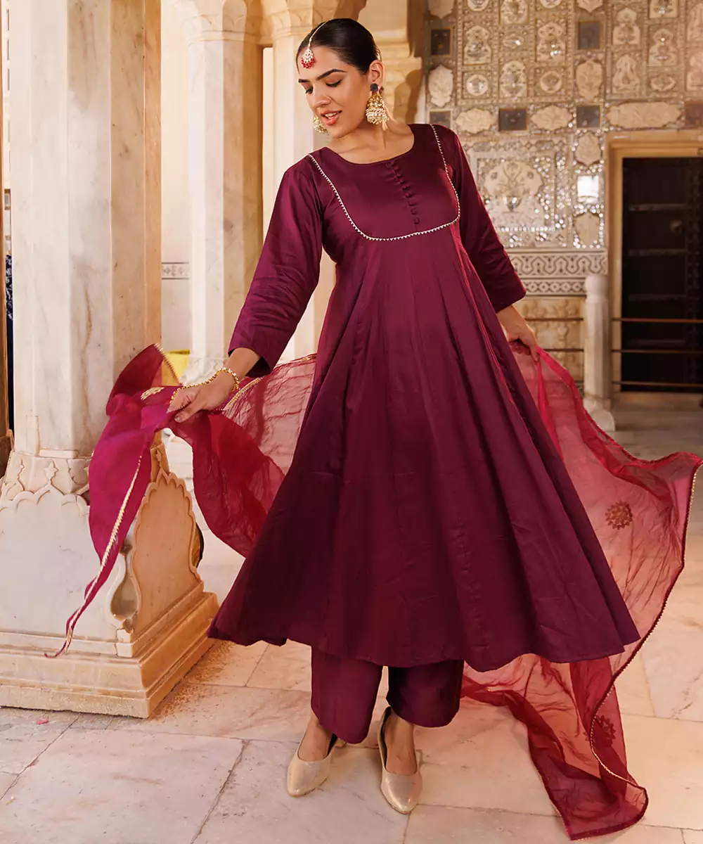 This Purple Plain Cotton Silk Anarkali Combines Simplicity With Elegance. Crafted From Soft, Breathable Cotton Silk Fabric, It Offers A Smooth Texture And Graceful Drape. The Rich Purple Hue Adds Sophistication, Making It Perfect For Festive Occasions, Family Gatherings, Or Casual Celebrations With A Touch Of Refined Charm.