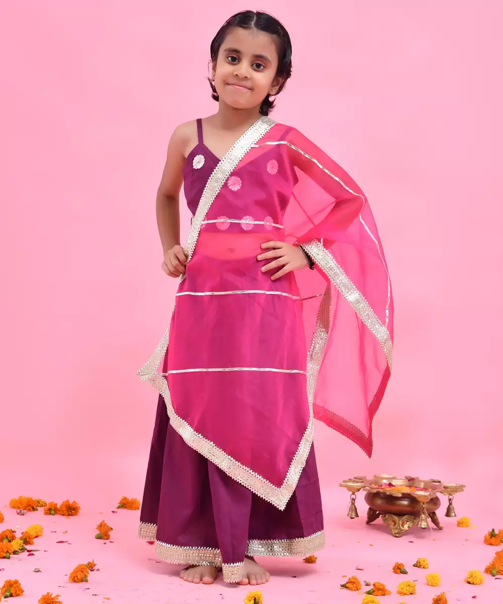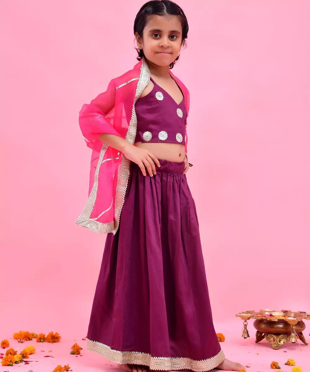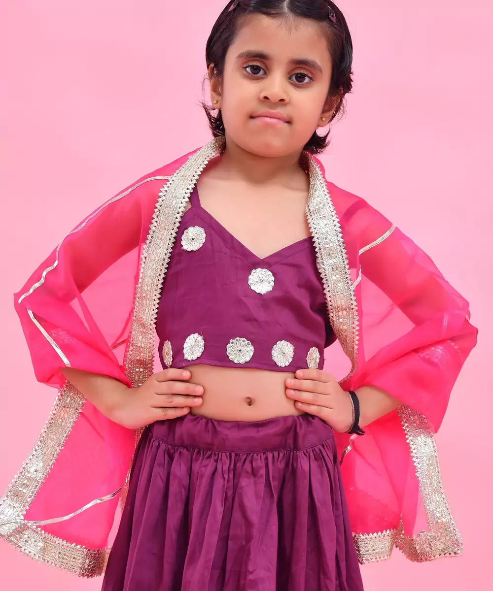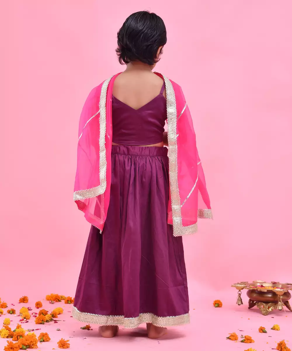 Featuring A Purple, Cotton Silk Lehenga Set. It's Paired With A Blouse And Gota Embellished Rani Pink, Organza Dupatta. Colour: Purple Fabric: Cotton Silk Components: 1 / Lehenga 1 / Blouse 1 / Dupatta
