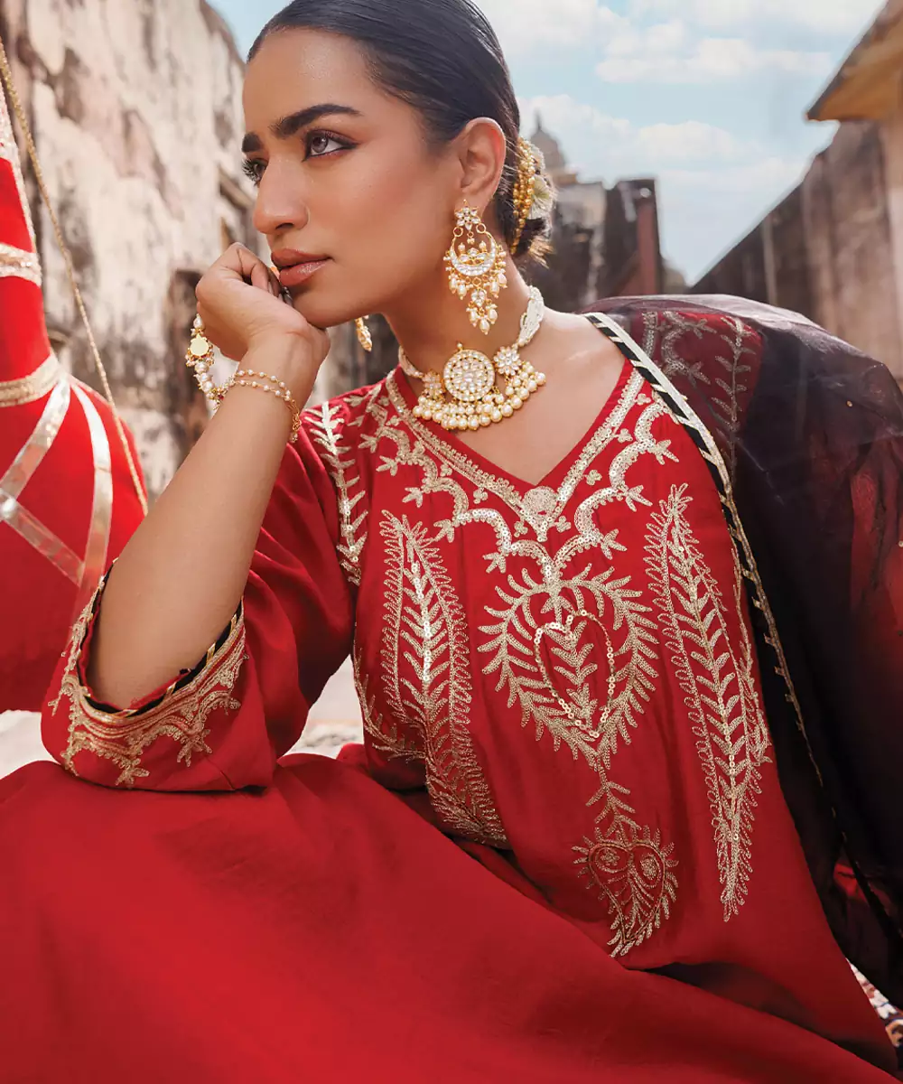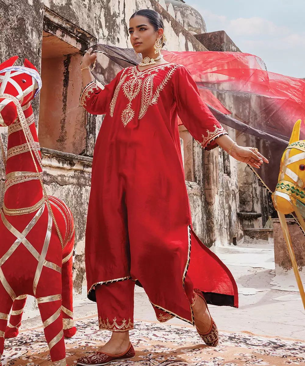 Bold And Elegant, This Red Embroidered Chanderi Kurta Set Features Intricate Detailing On A Lustrous Fabric. The Rich Color Enhances Its Festive Appeal, While The Lightweight Texture Ensures Comfort. Perfect For Celebrations, It Adds A Striking And Traditional Charm To Your Ethnic Wardrobe.