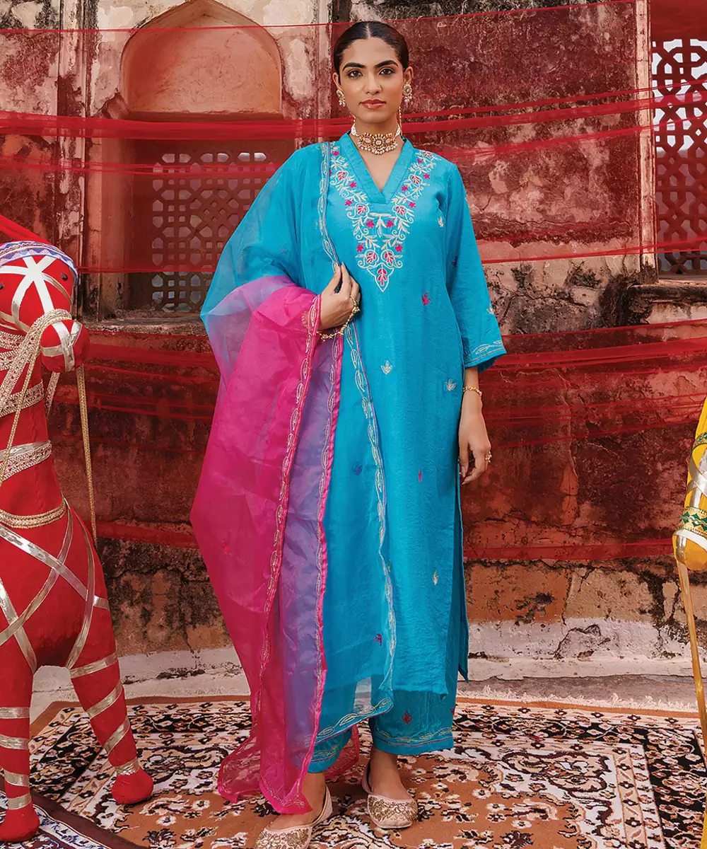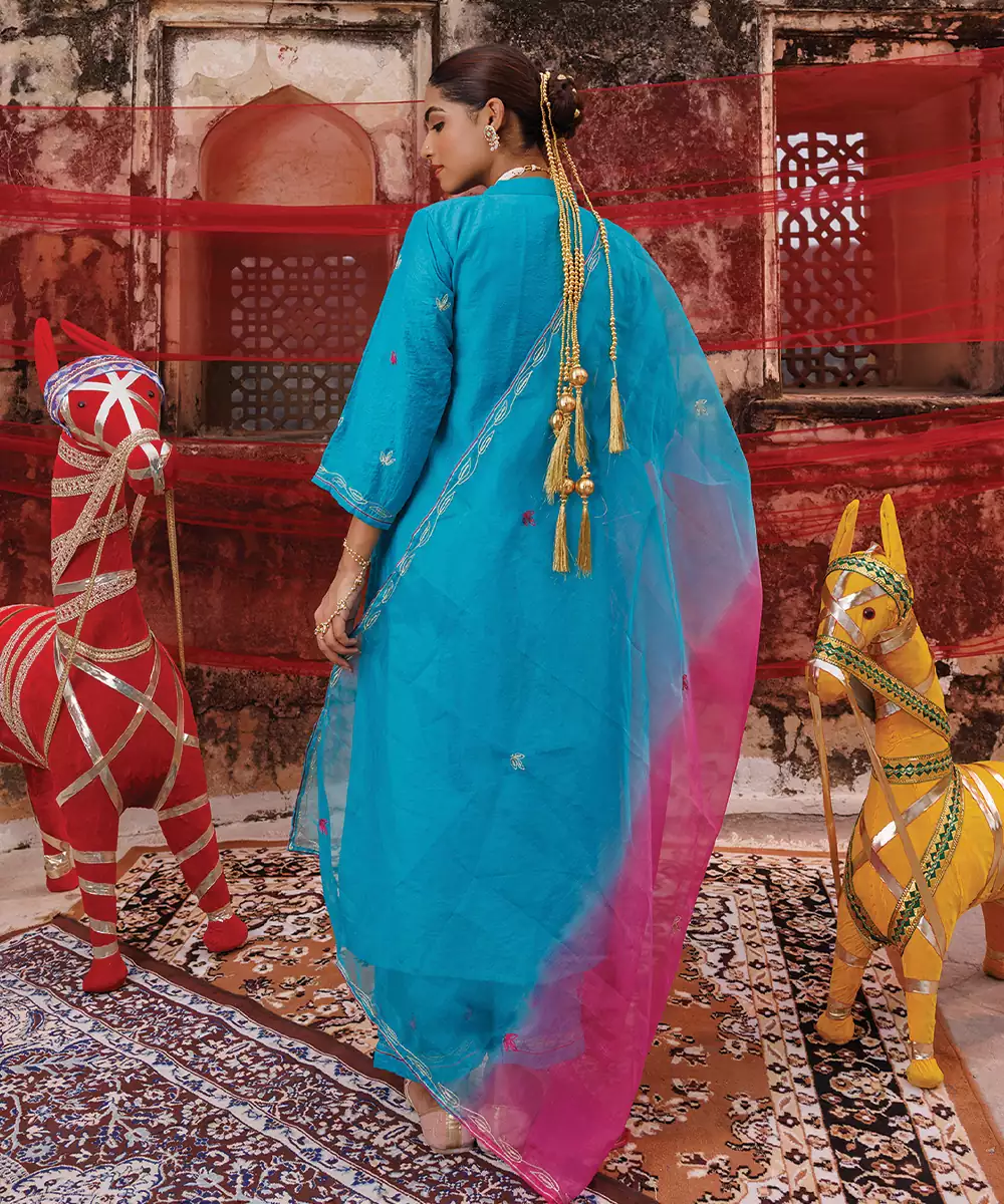 Teal Blue Chanderi Kurta Set With Dual Shade Dupatta.