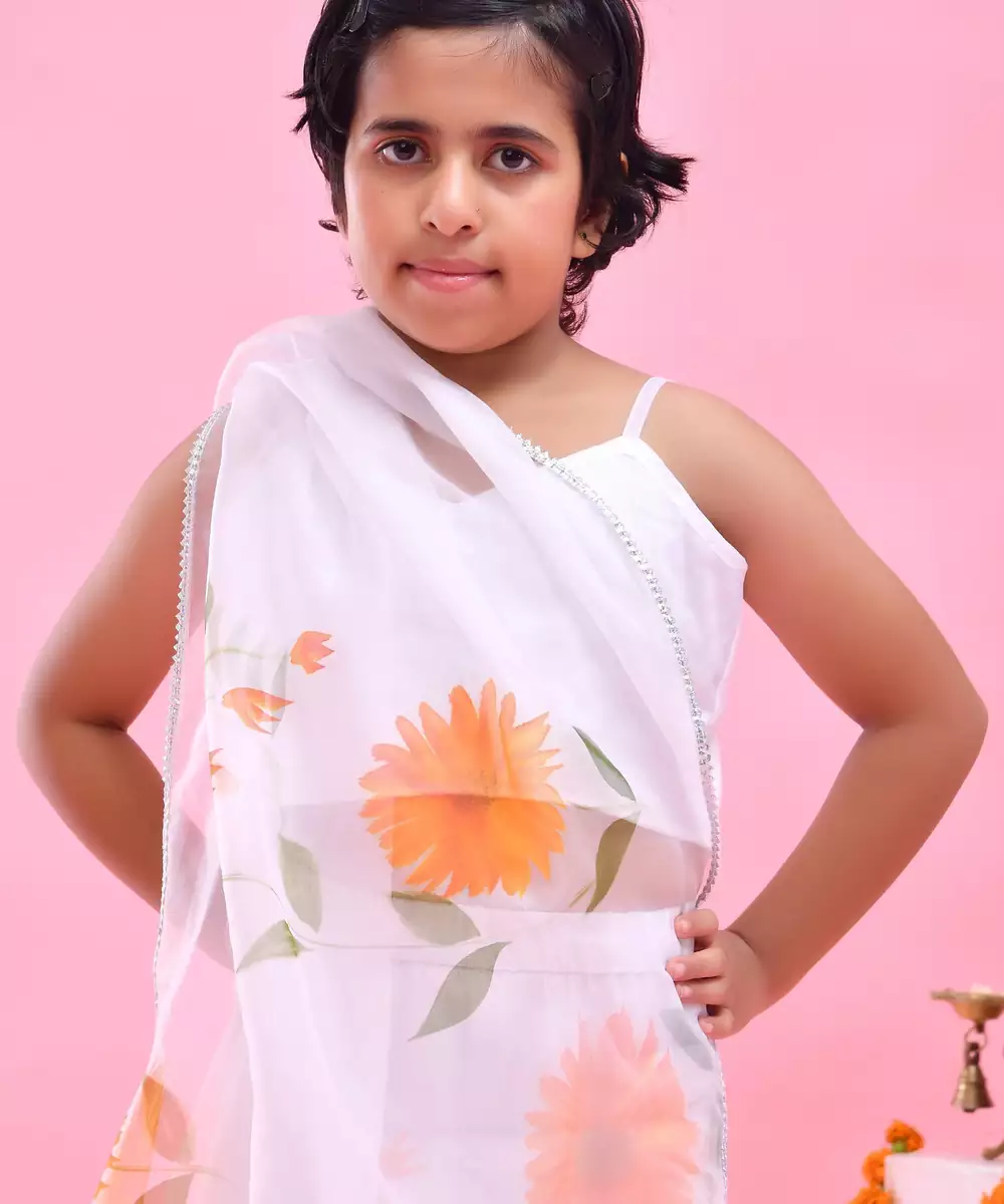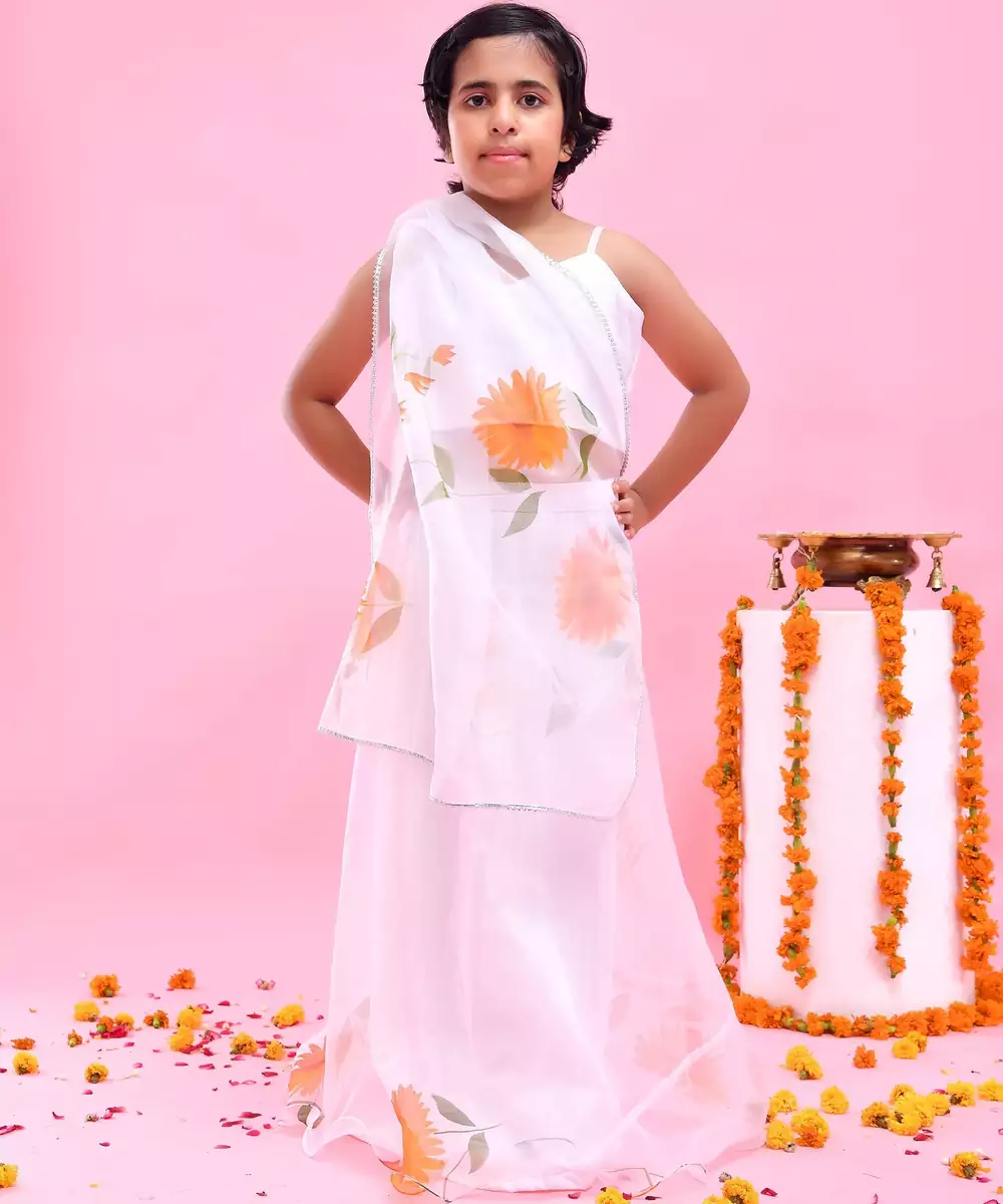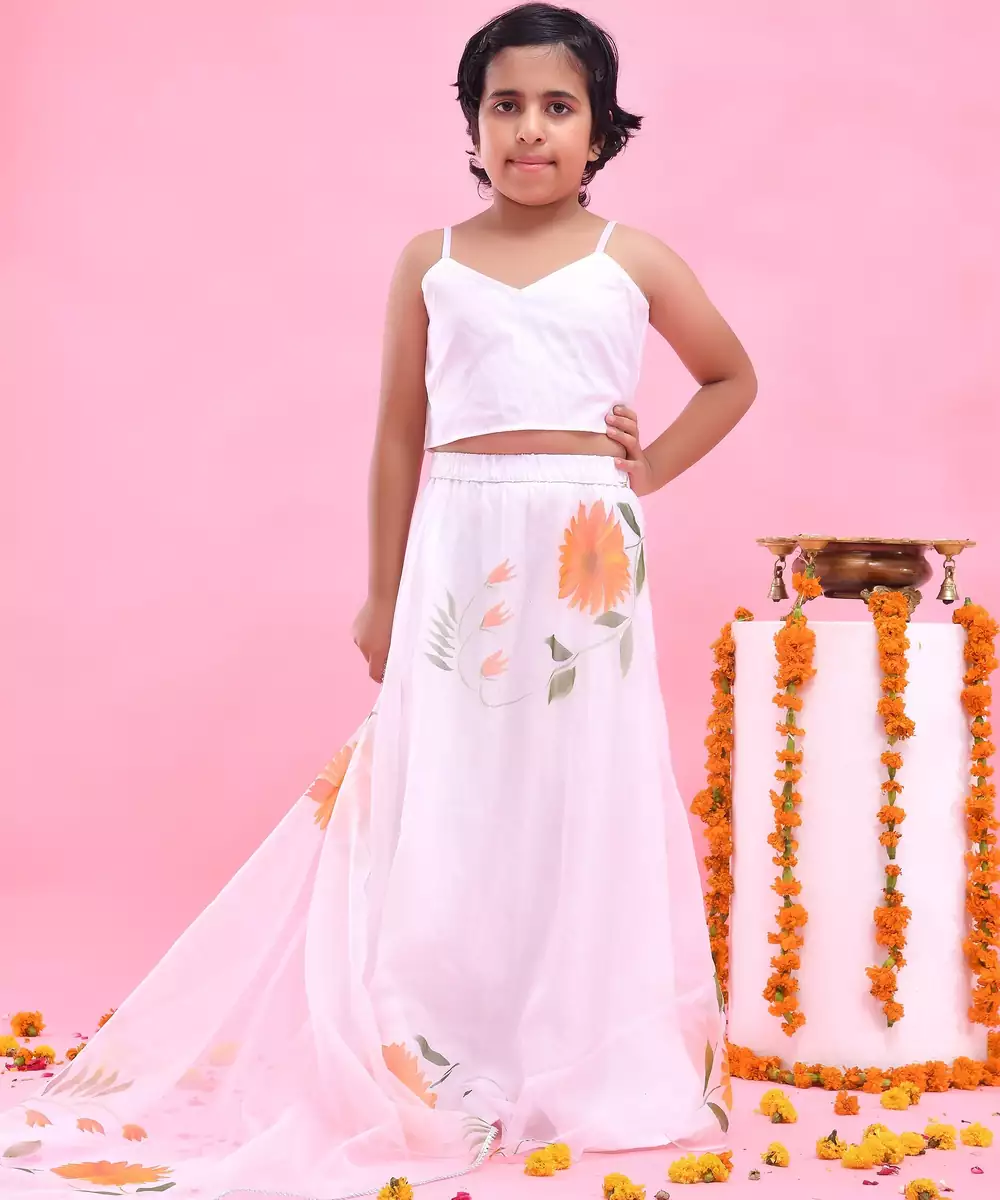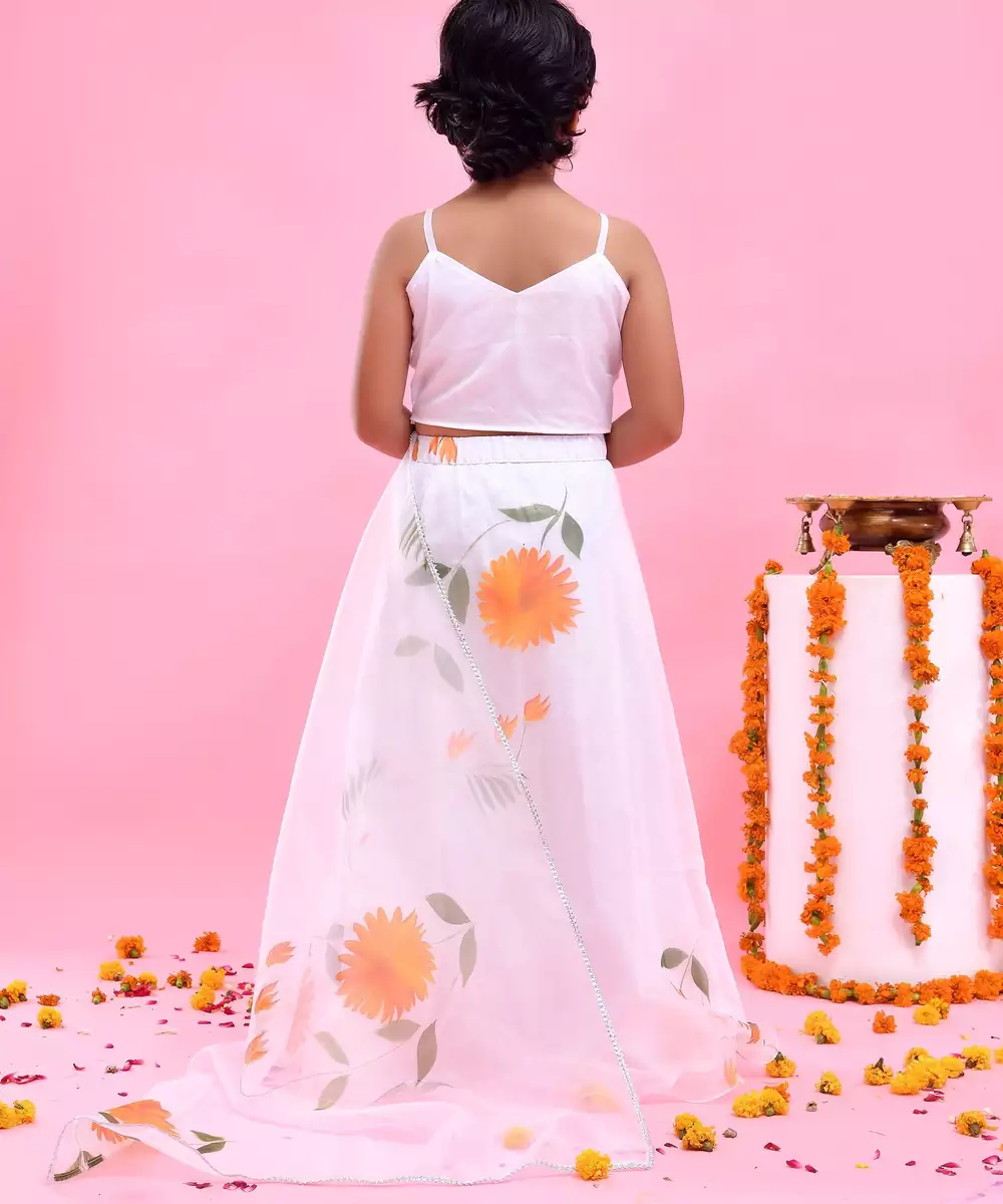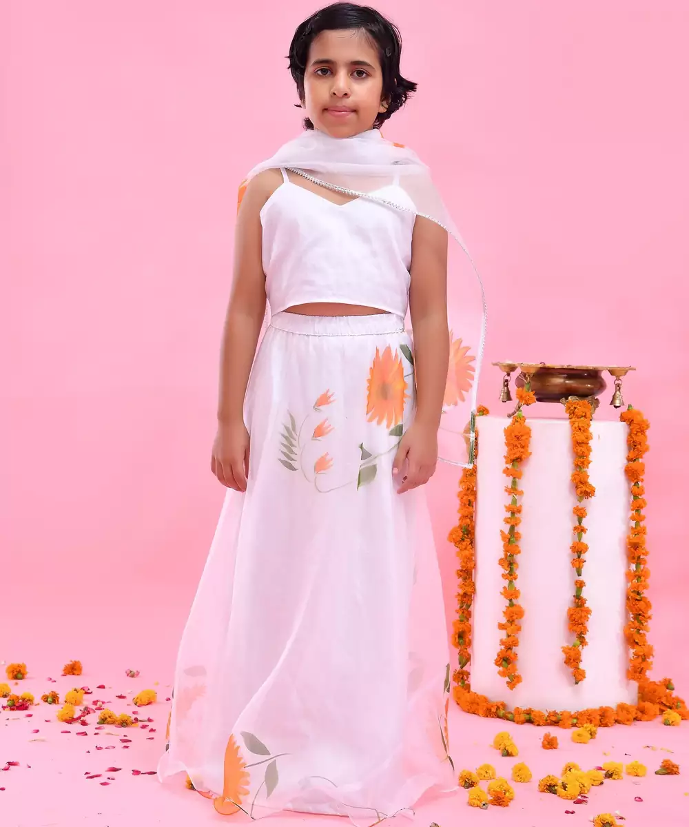 Featuring A White Organza, Hand Painted Sunflowers, Lehenga Set . It's Paired With A Plain Organza Blouse And Gota Embellished Hand Painted Dupatta.