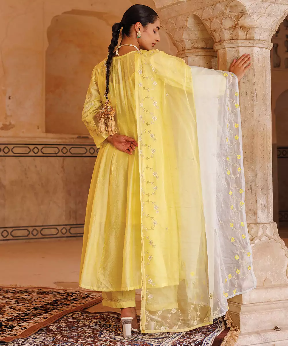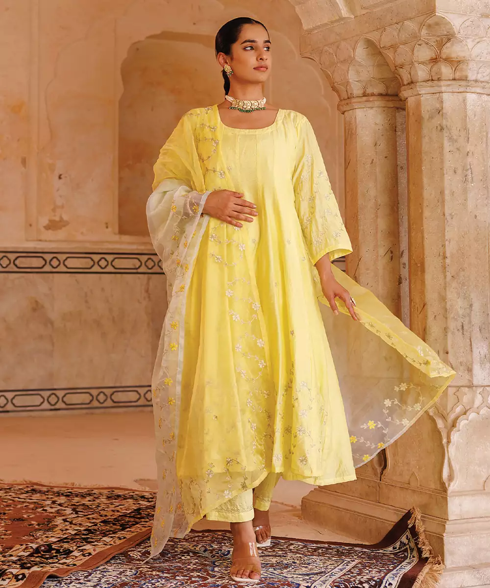 Yellow Embroidered Chanderi Anarkali Set