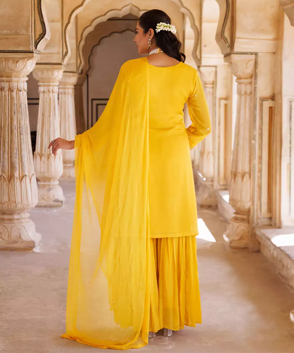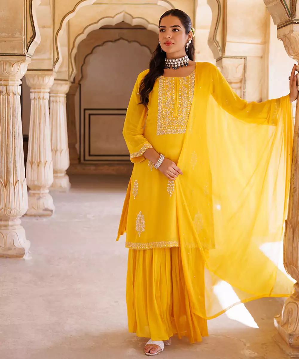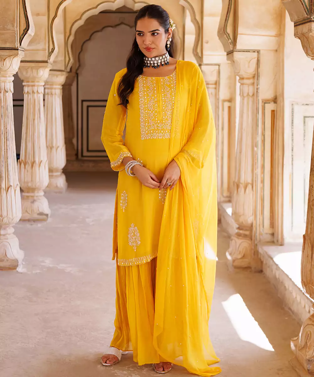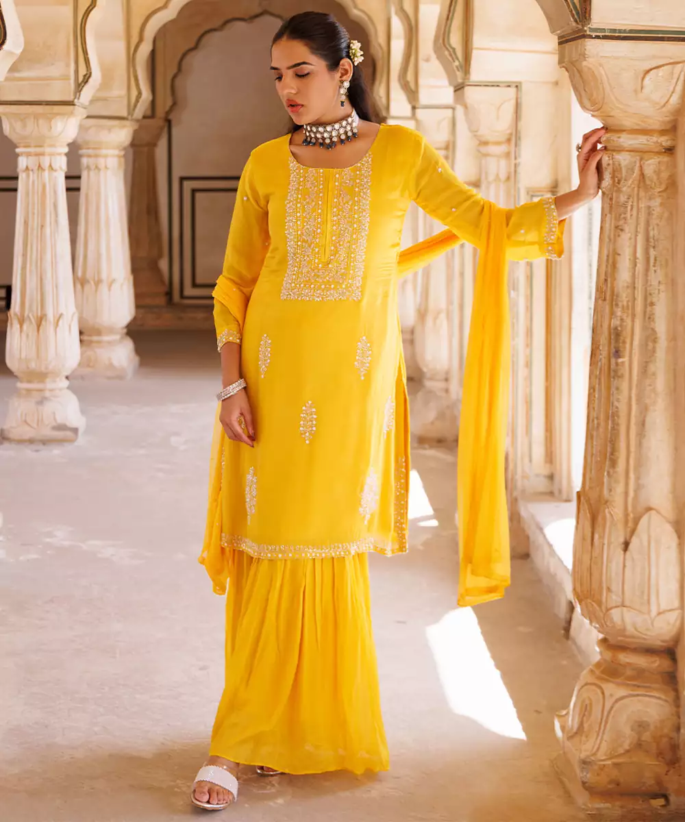 This Yellow Embroidered Silk Sharara Set Radiates Festive Elegance With Its Vibrant Hue And Intricate Embroidery. Crafted From Luxurious Silk Fabric, It Offers A Rich Texture And Graceful Silhouette. Perfect For Weddings, Celebrations, Or Festive Gatherings, This Set Adds A Bright, Traditional Charm To Your Ethnic Wardrobe.