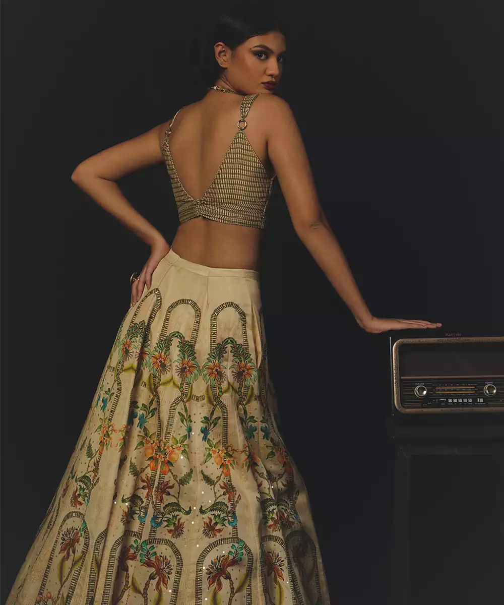 Embrace Subtle Luxury With This Beige Printed Tissue Lehenga Set, Showcasing A Lightweight Fabric With A Soft Shimmer And Delicate Texture. Elegant Prints Add Refined Charm, While The Graceful Silhouette Ensures Comfort And Style. Paired With A Matching Blouse, It Is Perfect For Festive Occasions, Weddings, And Stylish Celebrations.