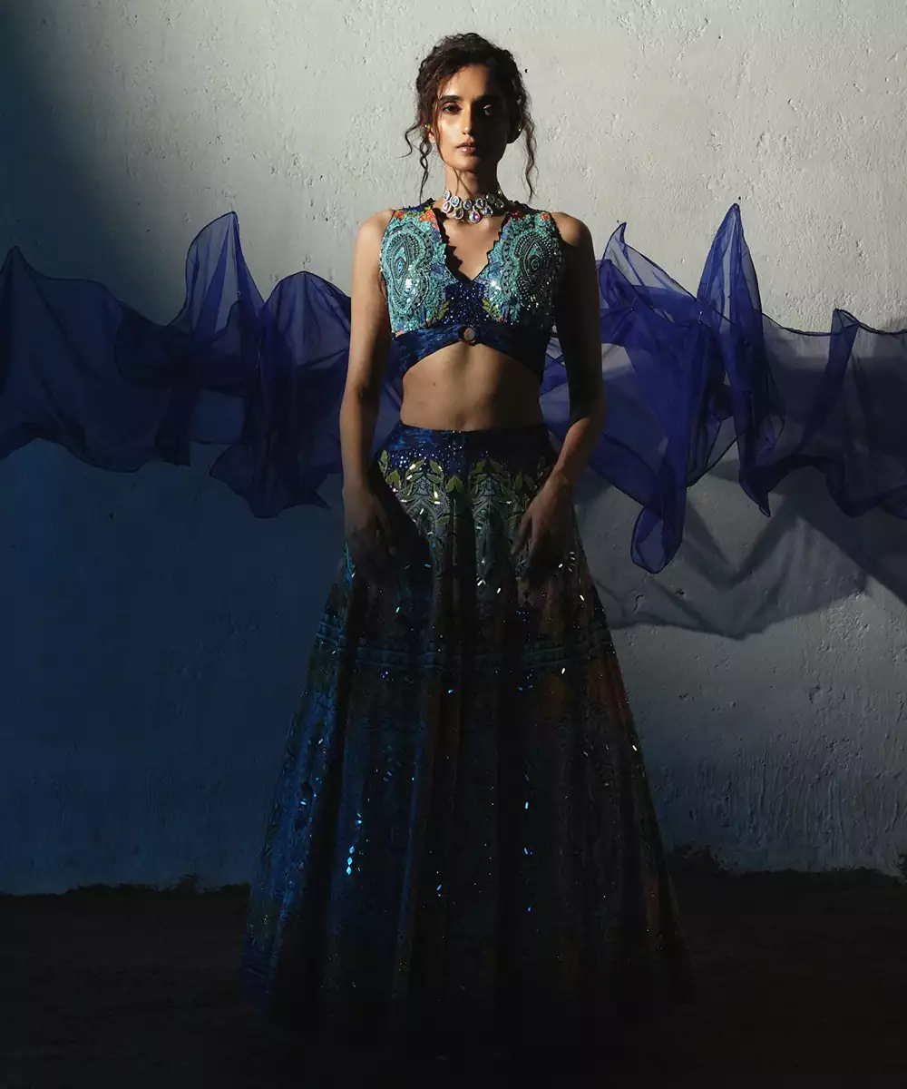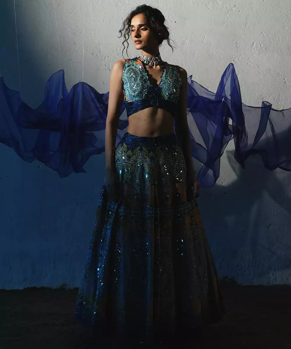 This Blue Embroidered Chiffon Lehenga Set Exudes Graceful Elegance And Festive Charm. Crafted From Lightweight Chiffon Fabric, It Features Intricate Embroidery That Adds A Refined, Stylish Touch. Perfect For Weddings And Celebrations, It Offers A Flowing Silhouette, Comfortable Fit, And Timeless Ethnic Appeal.