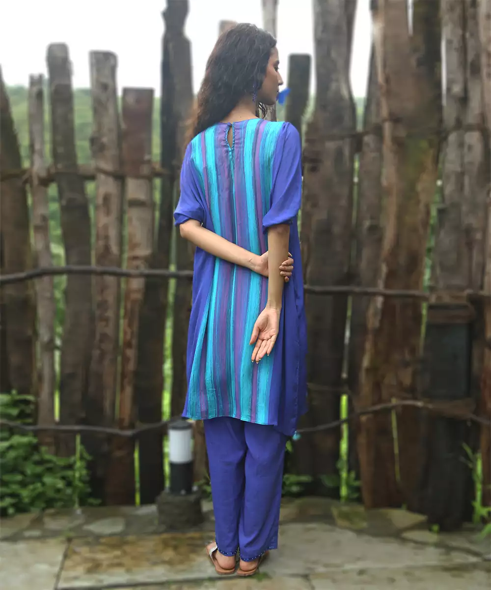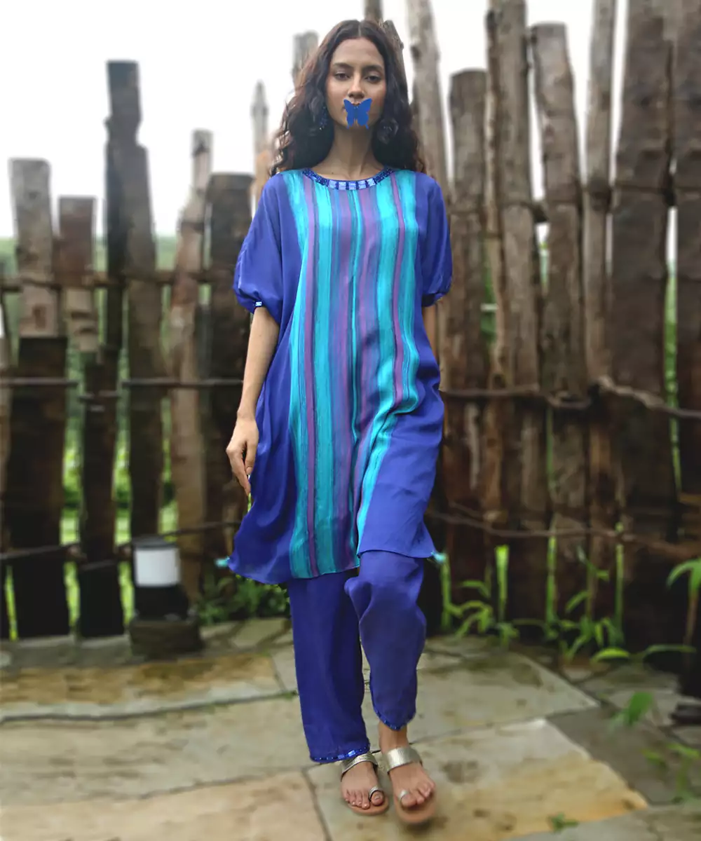 This Blue Printed Chiffon Kurta Set Showcases Breezy Elegance And Cheerful Charm. Crafted From Lightweight Chiffon Fabric, It Features Vibrant Prints That Add A Fresh, Lively Touch. Perfect For Daytime Festivities And Casual Celebrations, It Offers A Graceful Drape, Airy Comfort, And Effortless Ethnic Style.