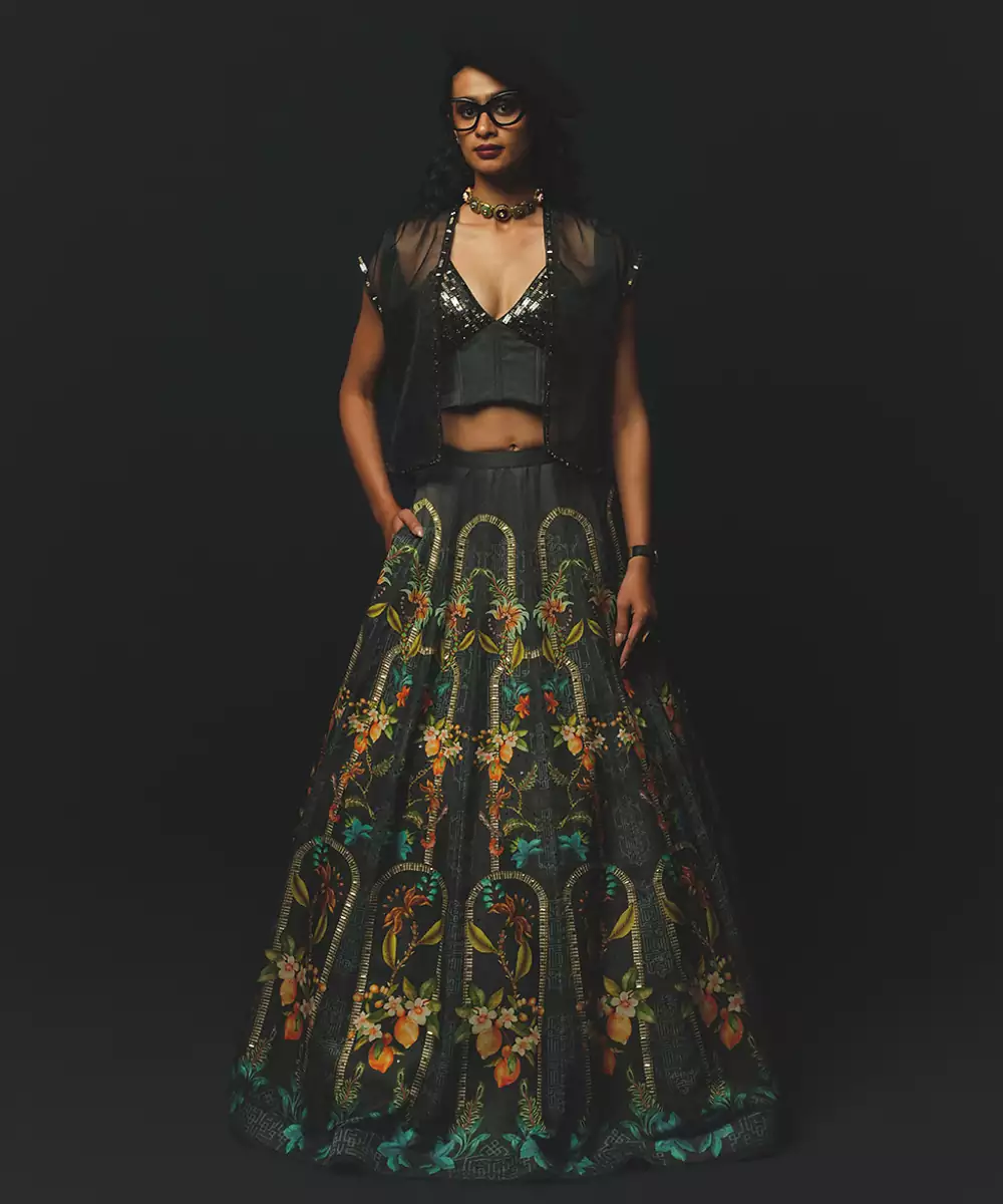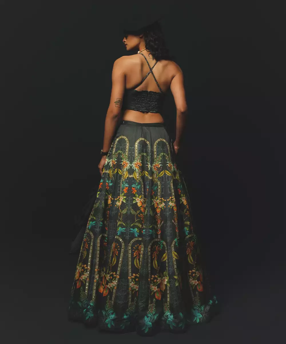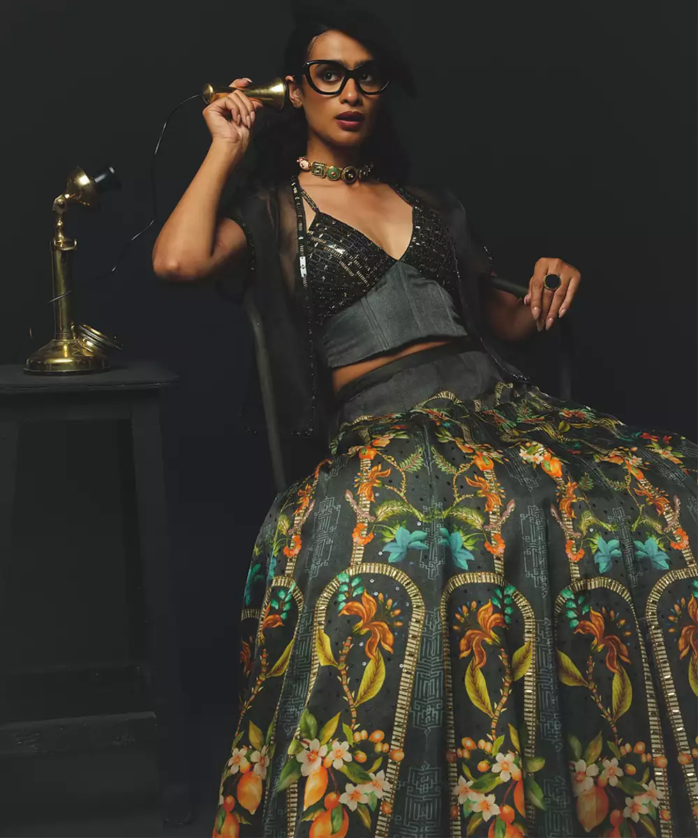 Step Into Effortless Elegance With This Charcoal Printed Linen Lehenga Set, Featuring A Breathable Fabric And Soft, Natural Texture. Subtle Prints Enhance Its Contemporary Appeal, While The Graceful Flare Ensures Comfort And Style. Paired With A Coordinated Blouse, It Is Perfect For Festive Gatherings, Daytime Celebrations, And Casual Occasions.