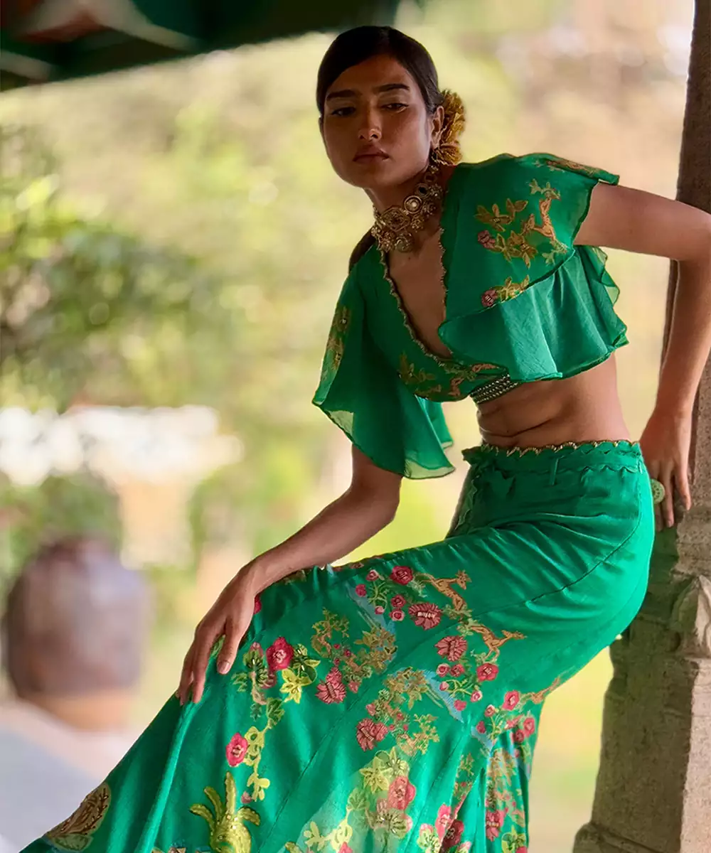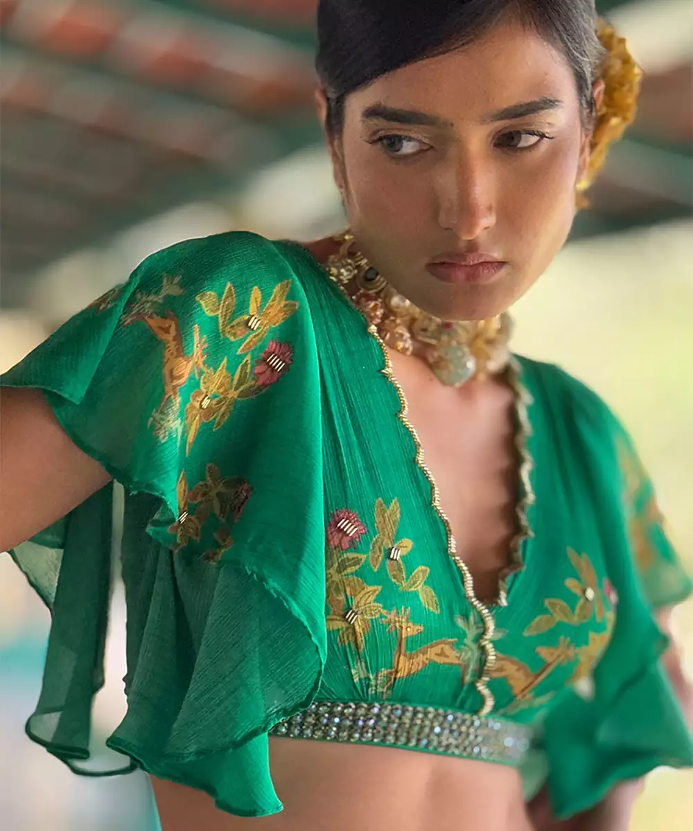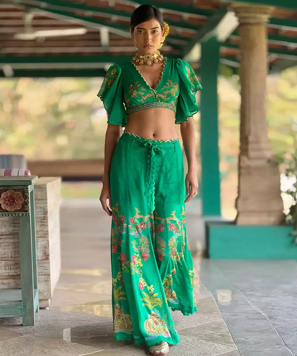 This Green Printed Chiffon Co Ord Set Radiates Fresh Elegance And Contemporary Charm. Crafted From Lightweight Chiffon Fabric, It Features Vibrant Prints That Add A Lively, Stylish Touch. Perfect For Festive Occasions And Casual Gatherings, It Offers A Comfortable Fit, Graceful Drape, And Timeless Ethnic Appeal.