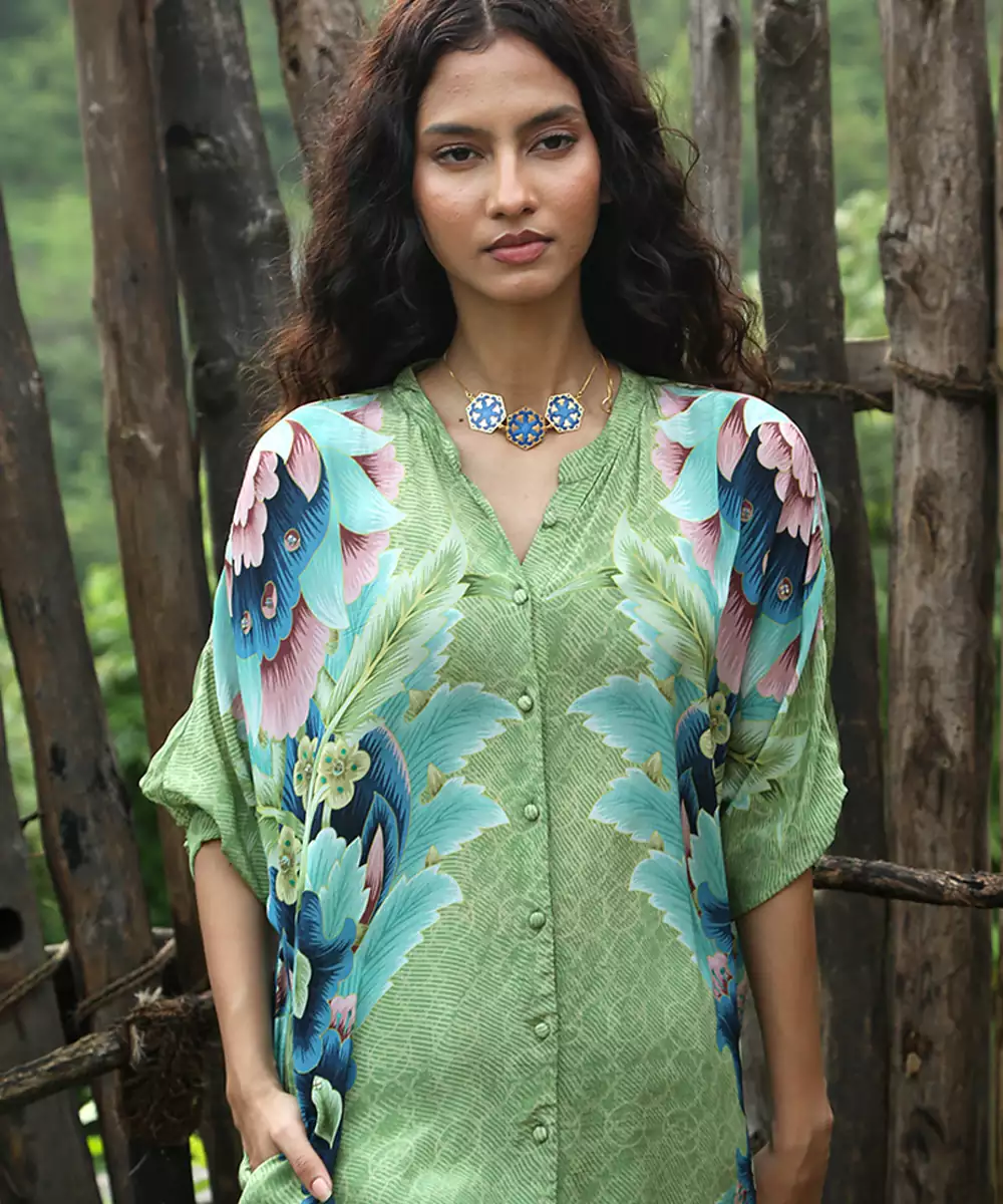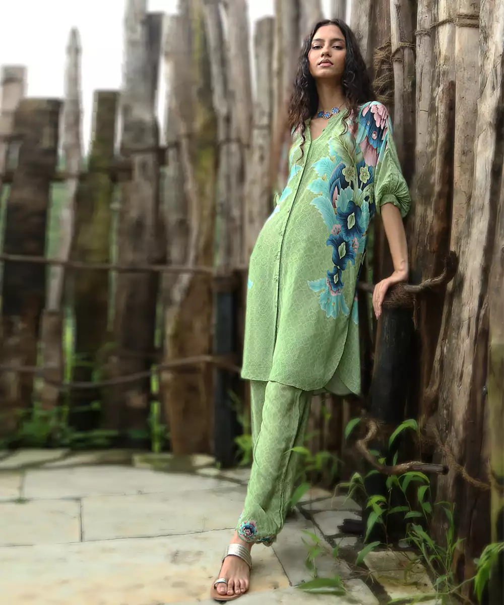 This Green Printed Crepe Co Ord Set Radiates Lively Charm And Contemporary Elegance. Crafted From Lightweight Crepe Fabric, It Features Vibrant Prints That Add A Playful, Stylish Touch. Perfect For Festive Occasions And Casual Gatherings, It Offers A Comfortable Fit, Graceful Drape, And Timeless Ethnic Appeal.