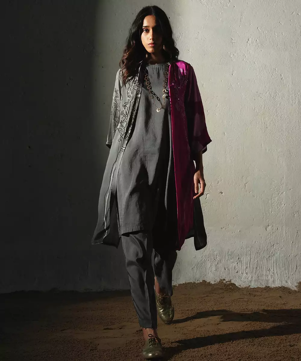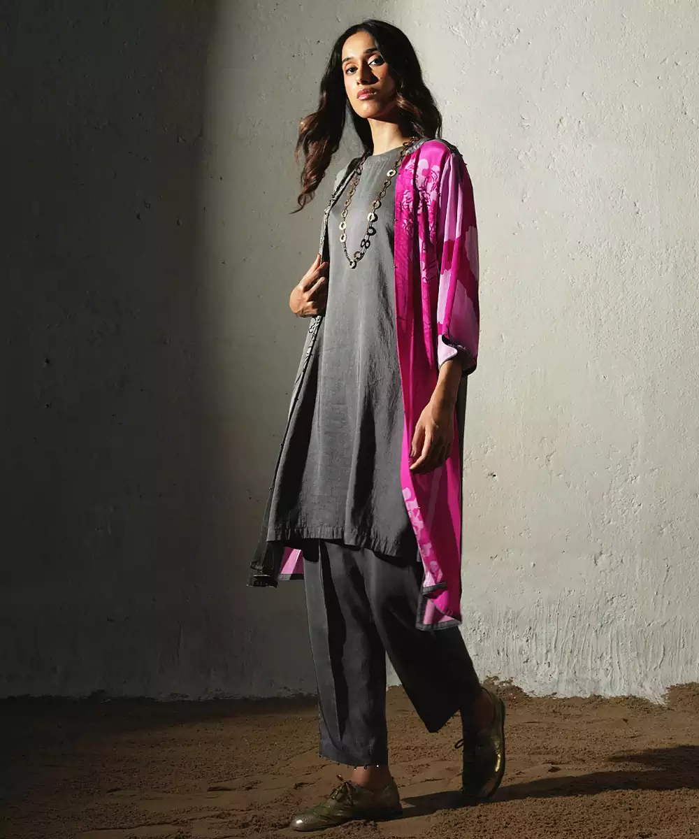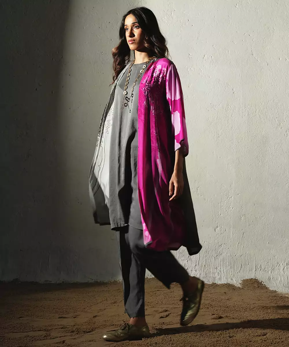 This Grey Embroidered Crepe Kurta Set With Jacket Radiates Vibrant Elegance And Festive Charm. Crafted From Lightweight Crepe Fabric, It Features Intricate Embroidery That Adds A Refined Touch. Perfect For Celebrations And Special Occasions, It Offers A Stylish Layered Look, Comfortable Fit, And Timeless Ethnic Appeal.
