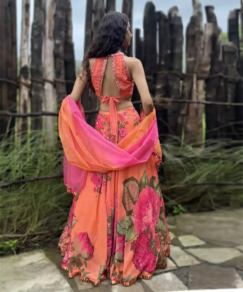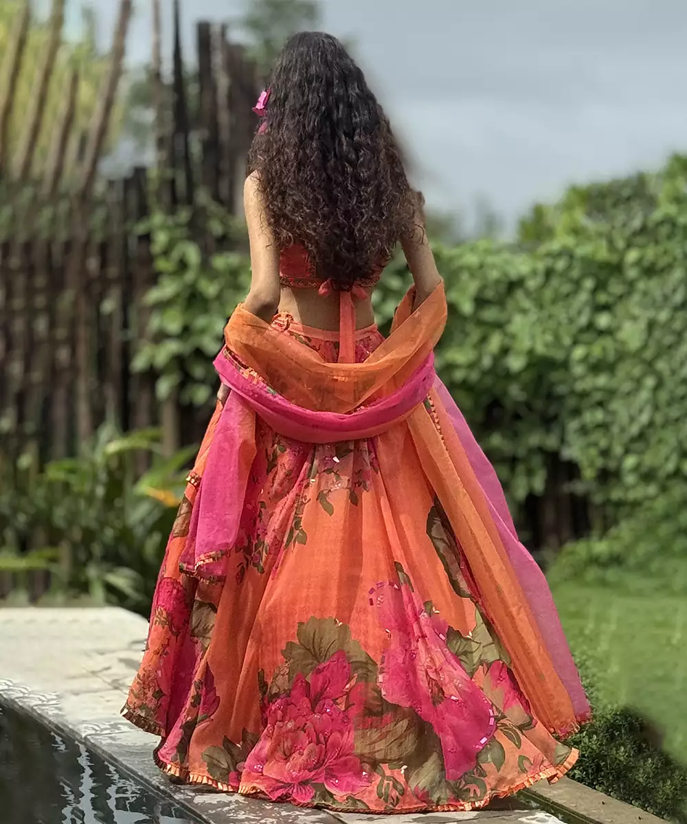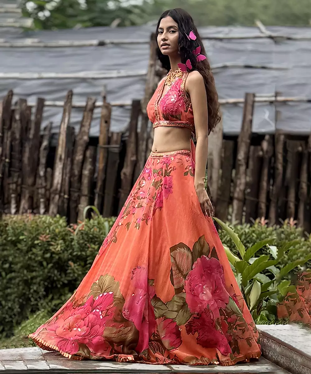 This Orange Printed Organza Lehenga Set Showcases Vibrant Elegance With A Modern Festive Appeal. Crafted From Lightweight Organza Fabric, It Features Stylish Prints That Add A Lively, Graceful Touch. Perfect For Celebrations And Special Occasions, It Offers A Voluminous Silhouette, Airy Comfort, And Timeless Ethnic Charm.