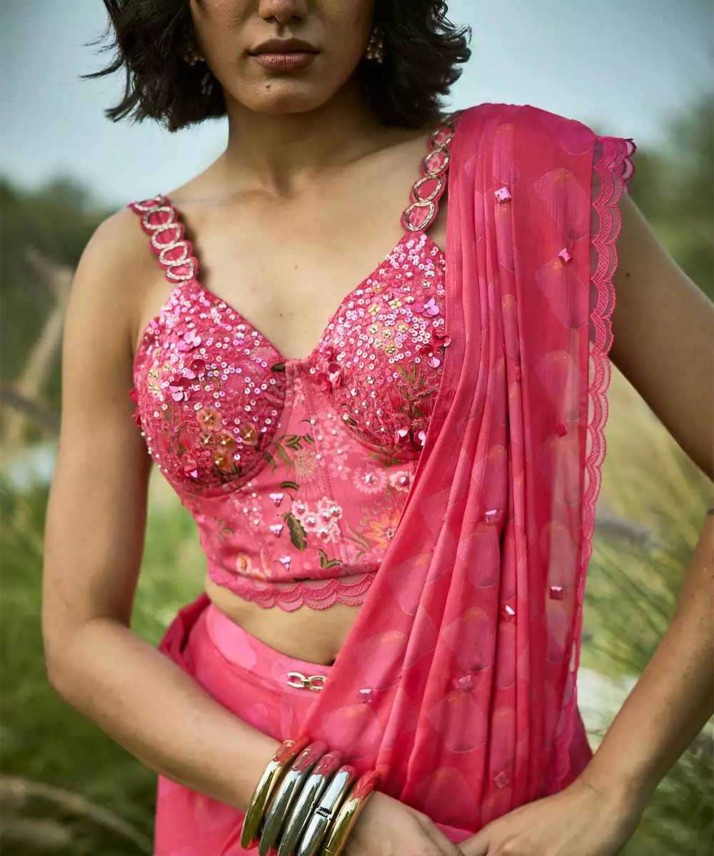 "This Pink Chiffon Saree Features Delicate Embroidery That Enhances Its Soft And Feminine Appeal. The Lightweight Fabric Drapes Effortlessly, Creating A Graceful And Flowy Silhouette. Perfect For Festive Occasions Or Evening Events, It Pairs Beautifully With Subtle Jewelry For A Refined, Elegant, And Timeless Look.