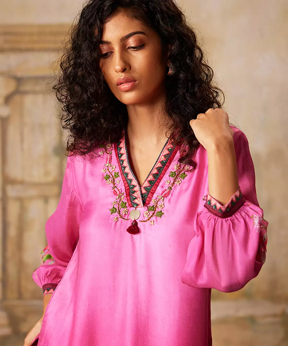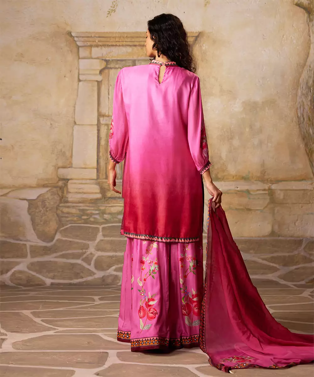 This Pink Embroidered Satin Sharara Set Exudes Graceful Elegance And Festive Charm. Crafted From Smooth, Luxurious Satin Fabric, It Features Intricate Embroidery That Adds A Rich, Refined Touch. Perfect For Weddings And Special Occasions, It Offers A Flowing Silhouette, Comfortable Fit, And Timeless Ethnic Appeal.