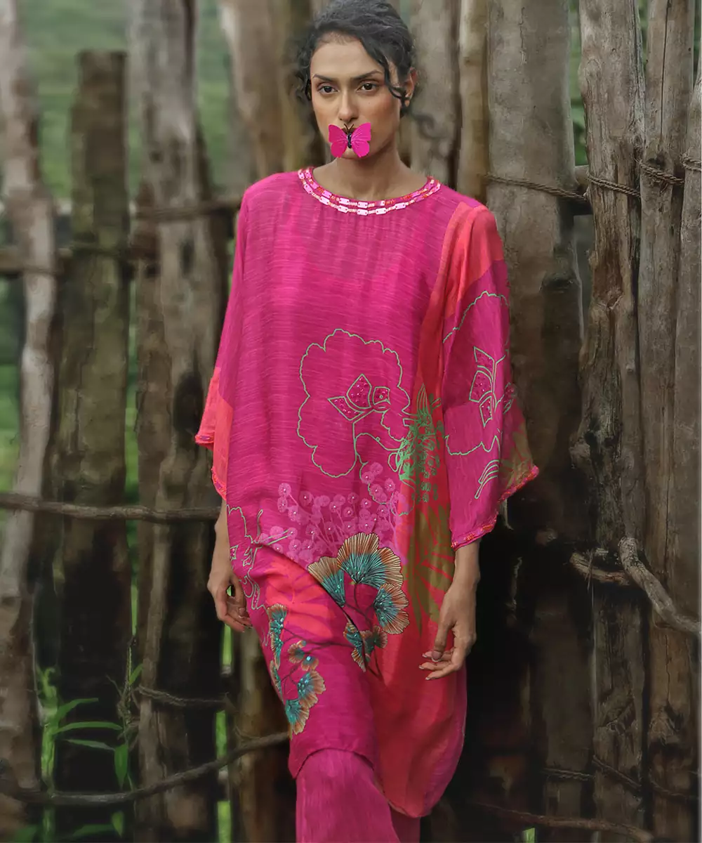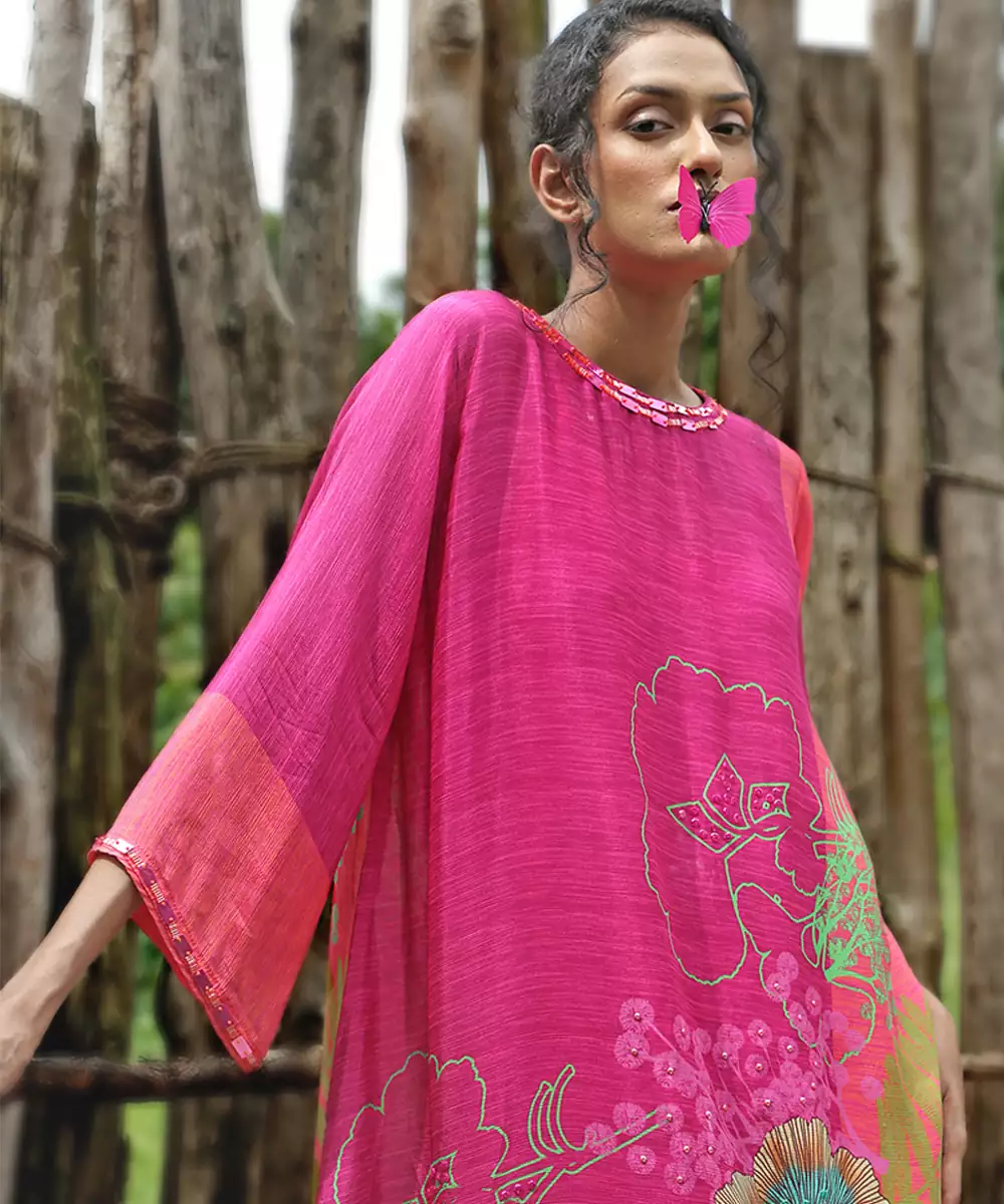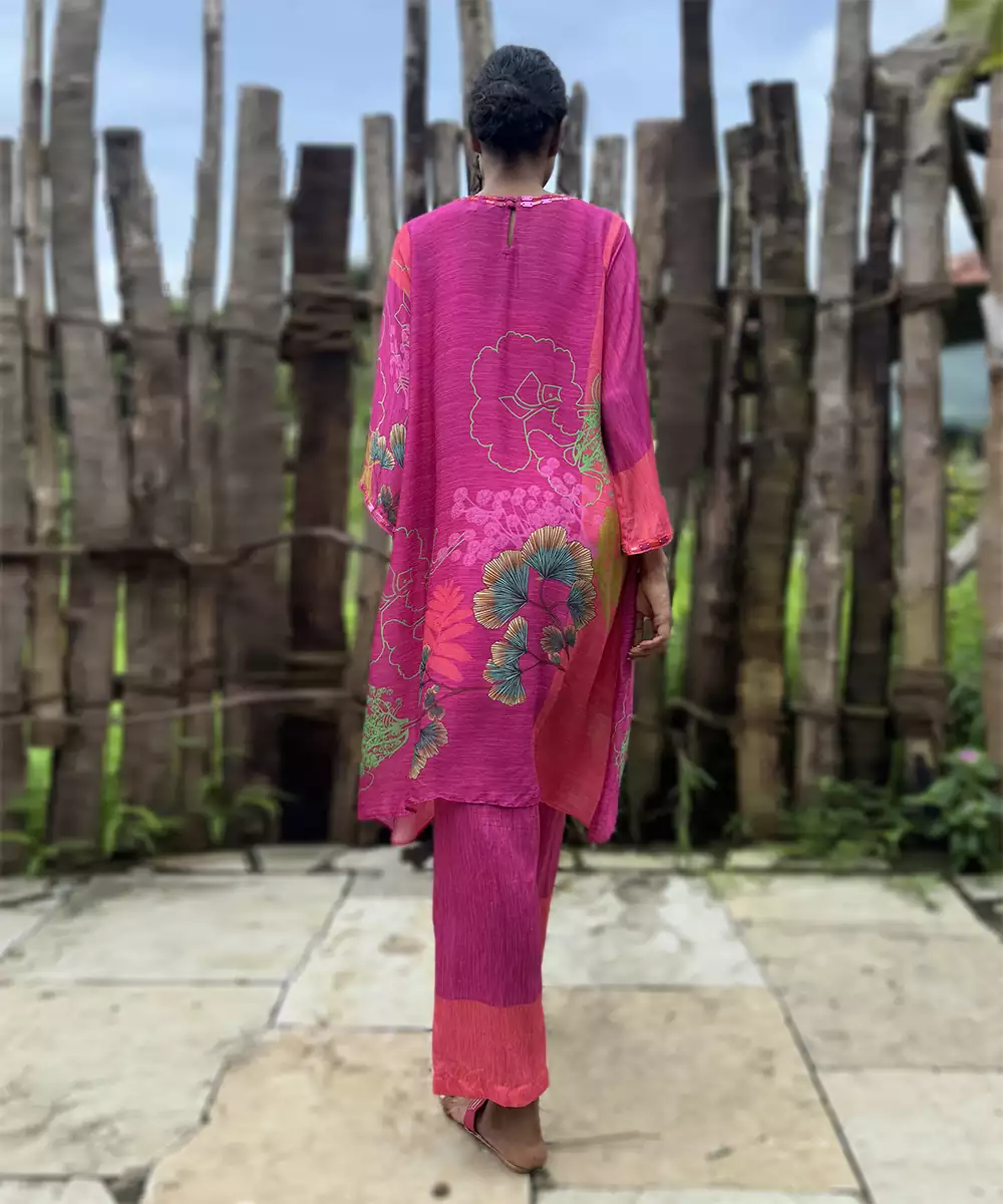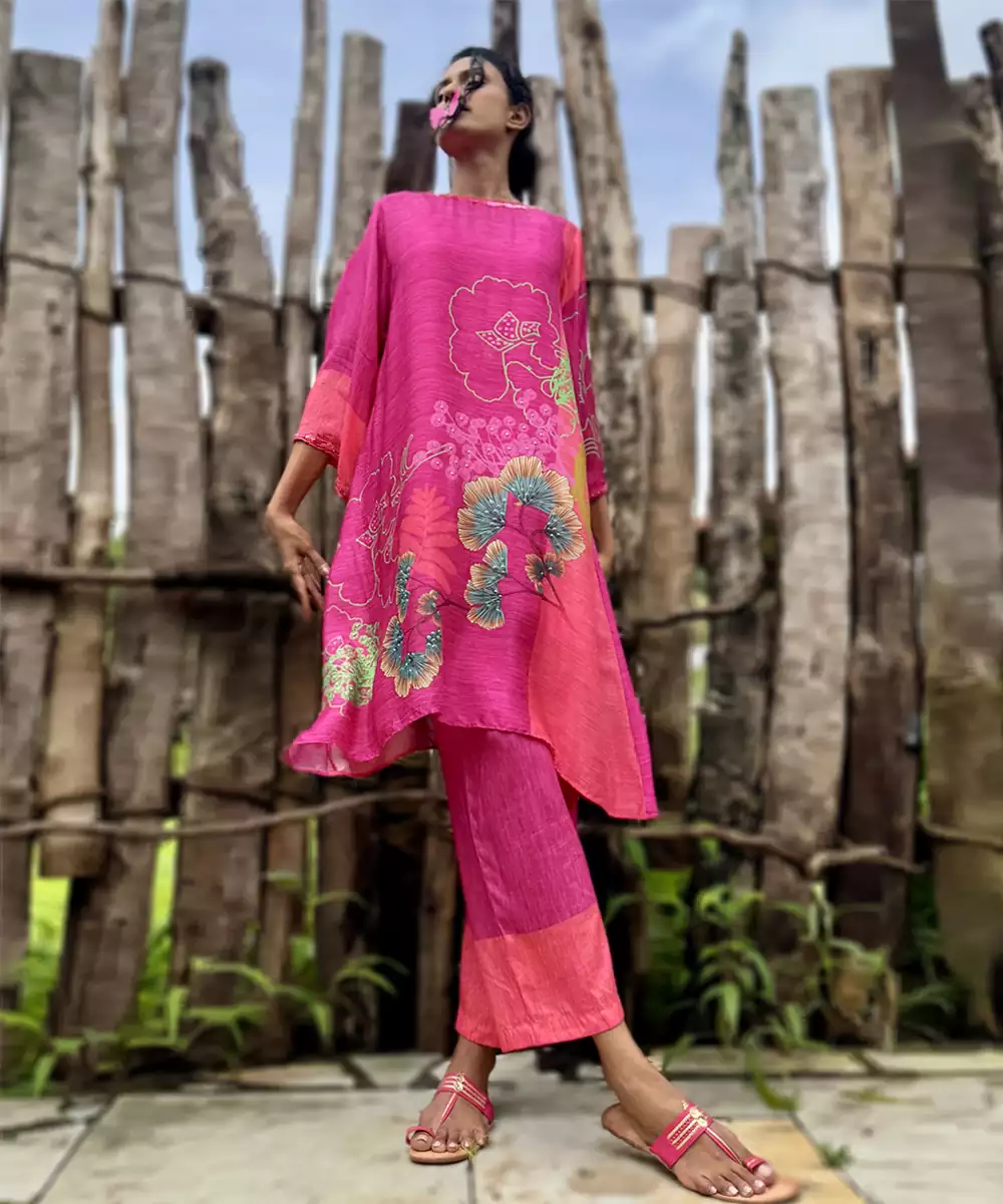 This Pink Printed Chiffon Kurta Set Showcases Breezy Elegance And Cheerful Charm. Crafted From Lightweight Chiffon Fabric, It Features Vibrant Prints That Add A Fresh, Lively Touch. Perfect For Daytime Festivities And Casual Celebrations, It Offers A Graceful Drape, Airy Comfort, And Effortless Ethnic Style.